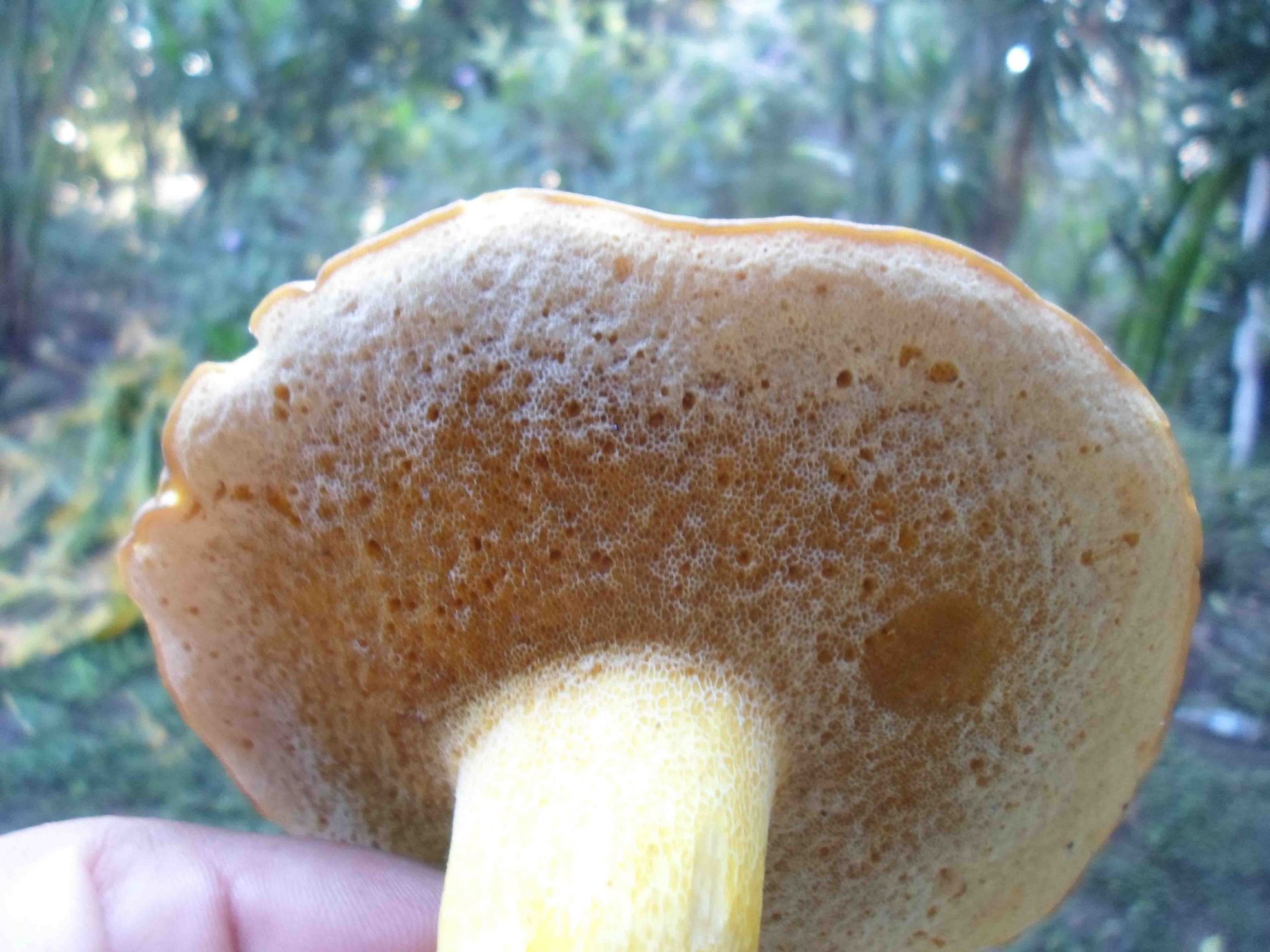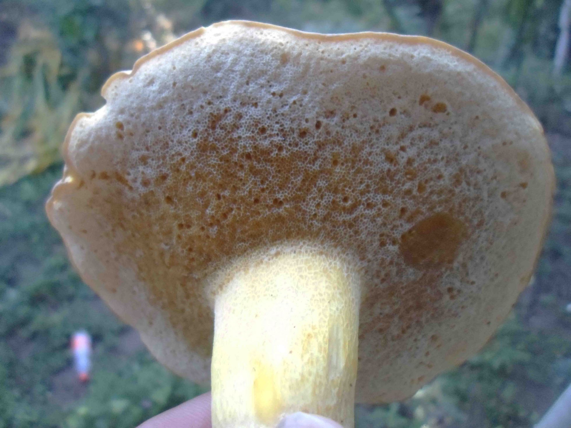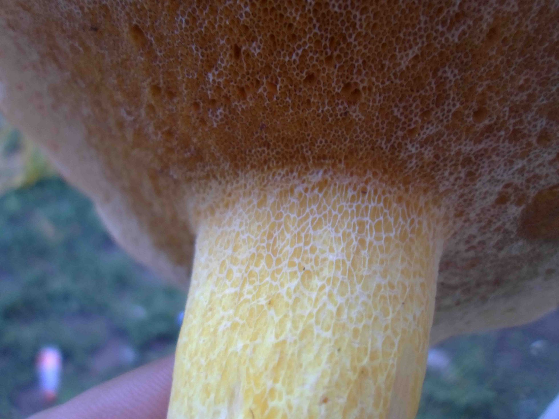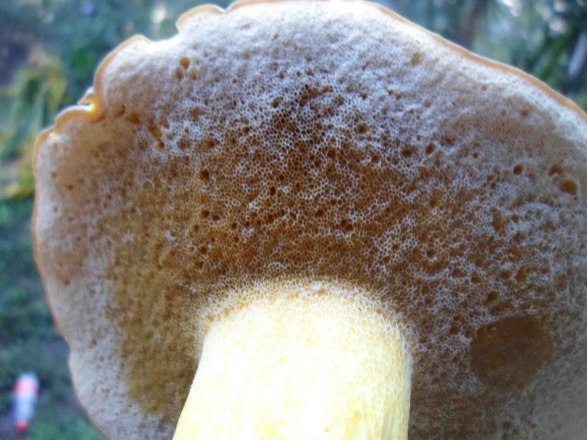 En ralidad en esta fase es una seta amarilla, poror amarillos que con la edad se oscurecen. La cutícula es igualmente amarilla. El retículo es evidente.