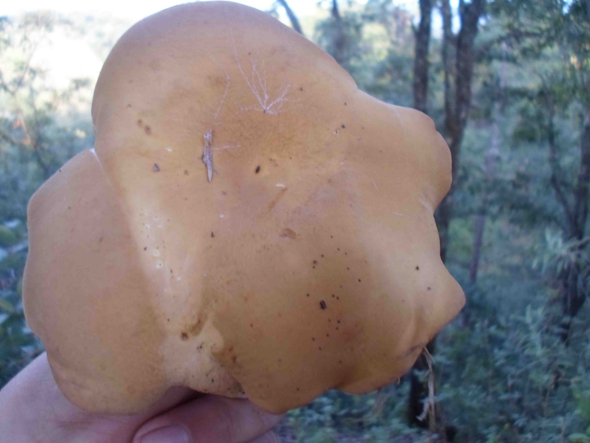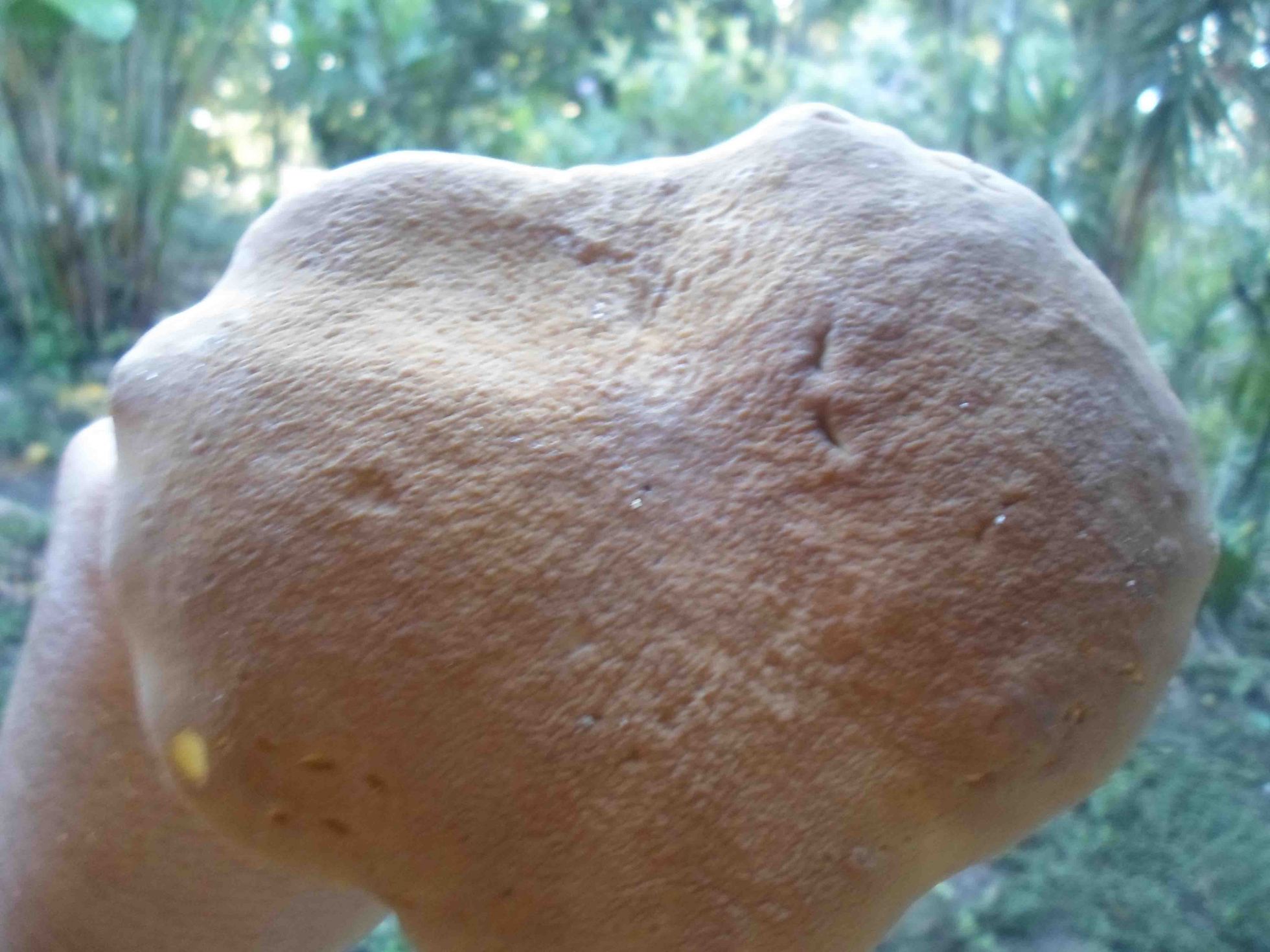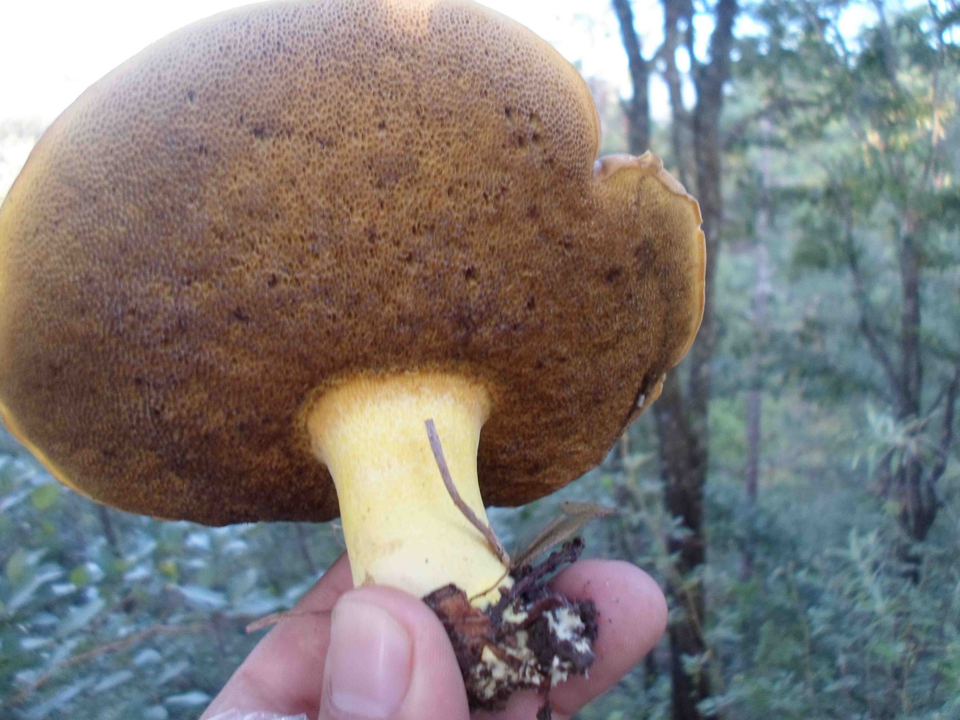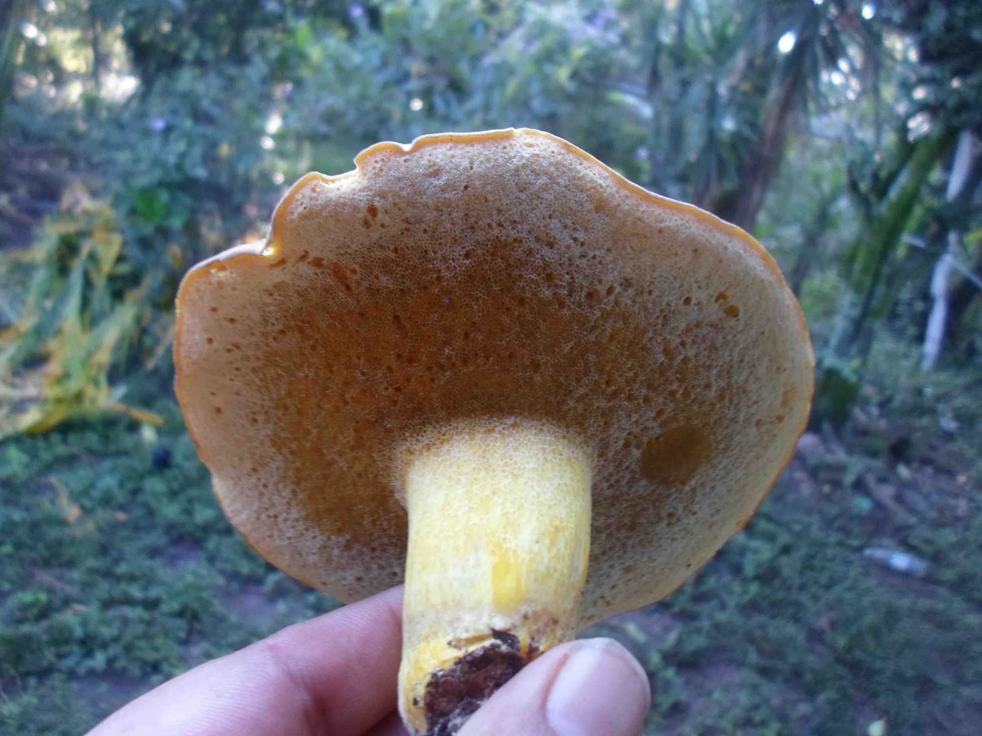 En ralidad en esta fase es una seta amarilla, poror amarillos que con la edad se oscurecen. La cutícula es igualmente amarilla. El retículo es evidente.
