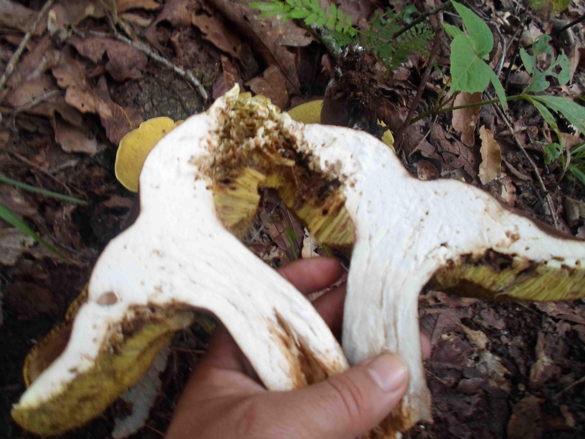 Curiosos hongos,a mi me recuerdan a algunos Boletus de carne blanca que tenemos por aqui,esa carne blanca y los poros verdosos,parecen Boletus aereus.