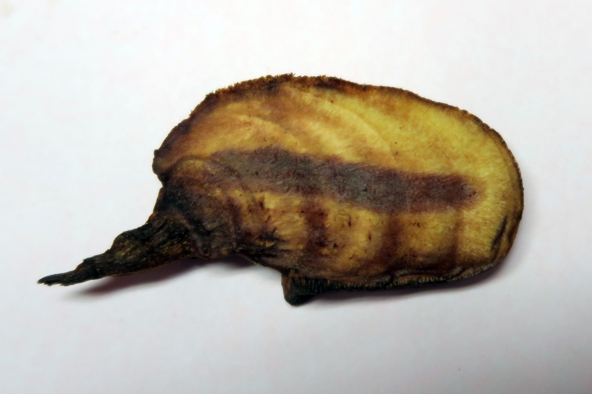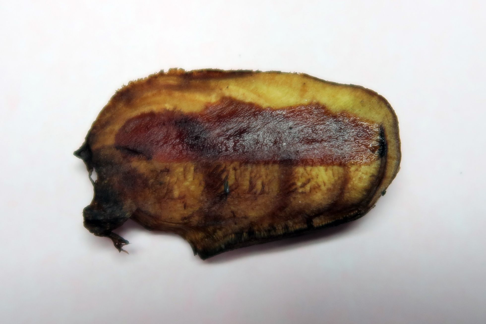 En la sección se aprecia claramente un desarrolo por capas, la carne de color amarillo, intuyo en la especie un desarrollo rápido ya que 15 días atrás pasé por el lugar y muy probablemente no había aparecido ya que no se me habría escapado, de haber estado allí.