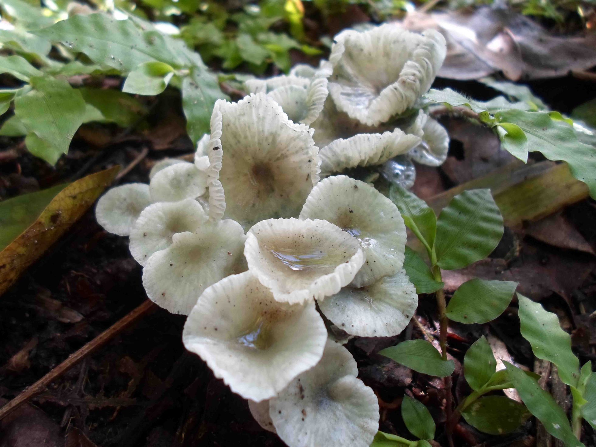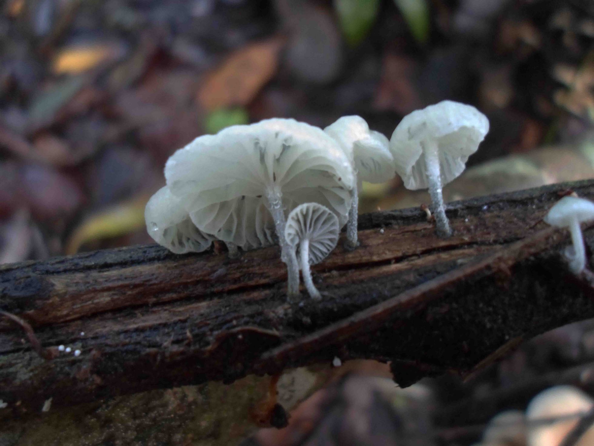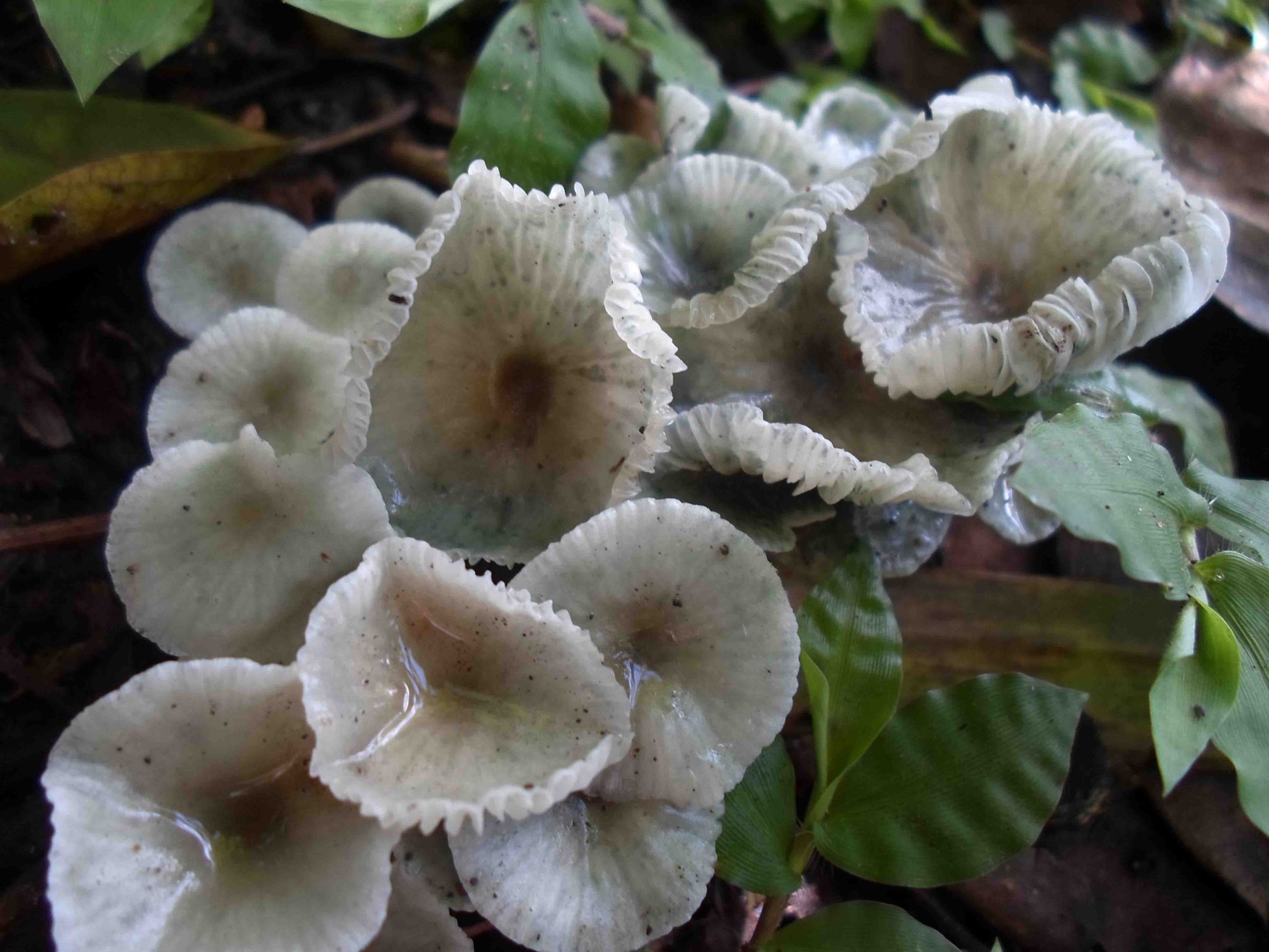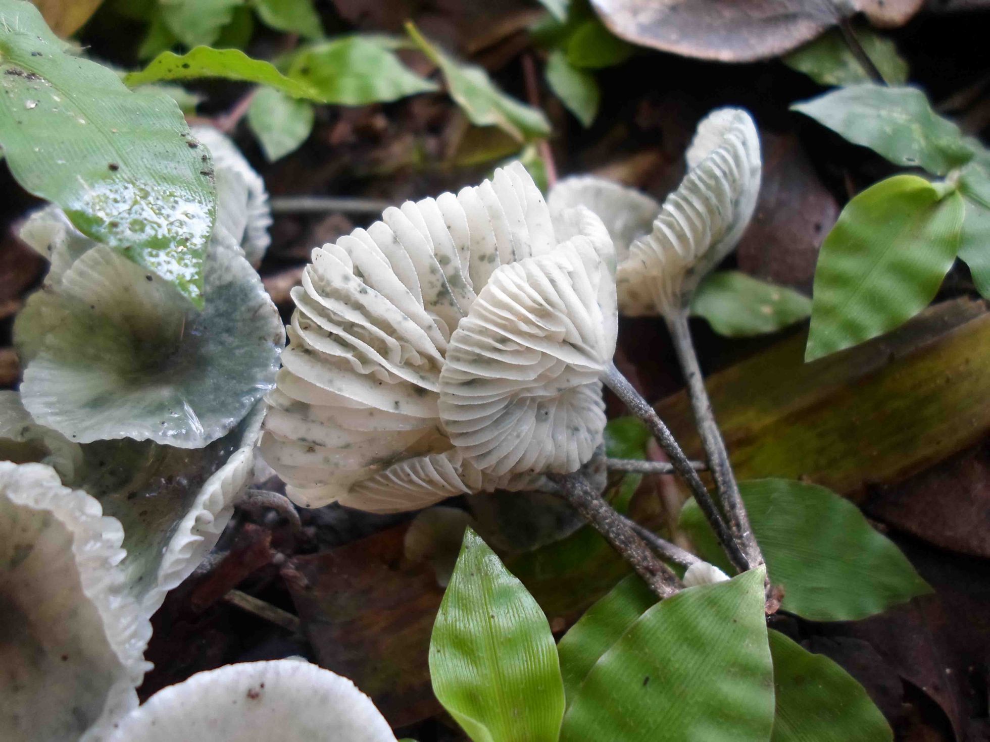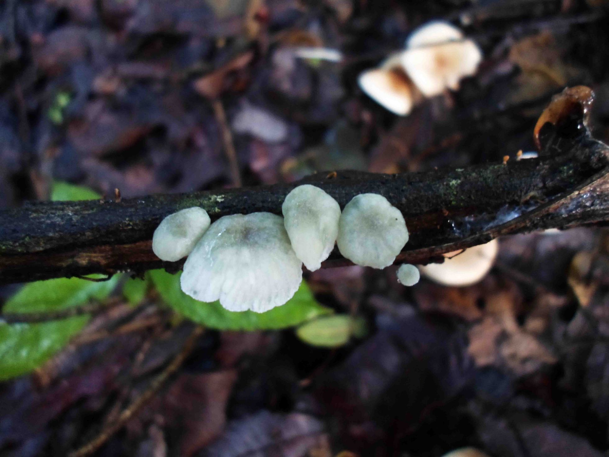 Hola Rubén , las primeras imágenes me parecen de Marasmiellus Vaillantii, eso si el color verdoso es de moho por la humedad, las dos últimas parecen de Marasmiellus Candidus.