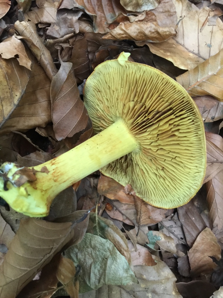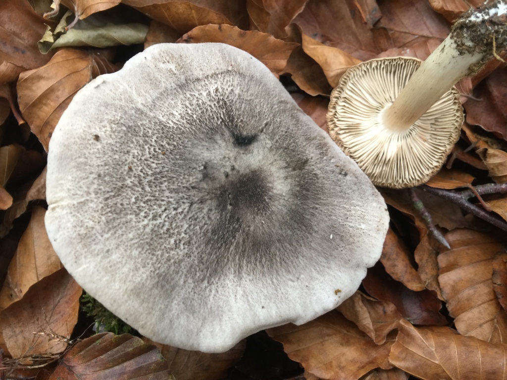 El Tricholoma me parece sciodes, ademas en la segunda foto, me parece verle el caracteristico punteado negro en la arista de las laminas