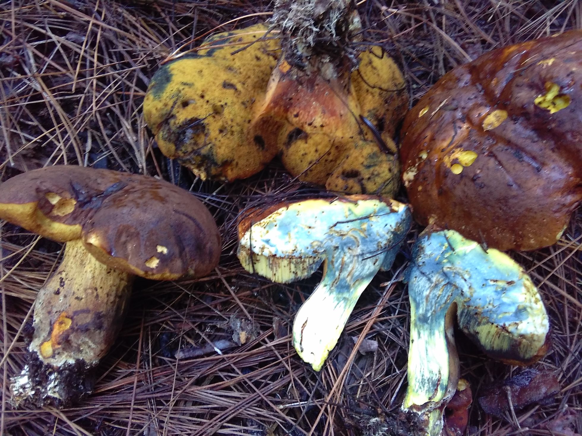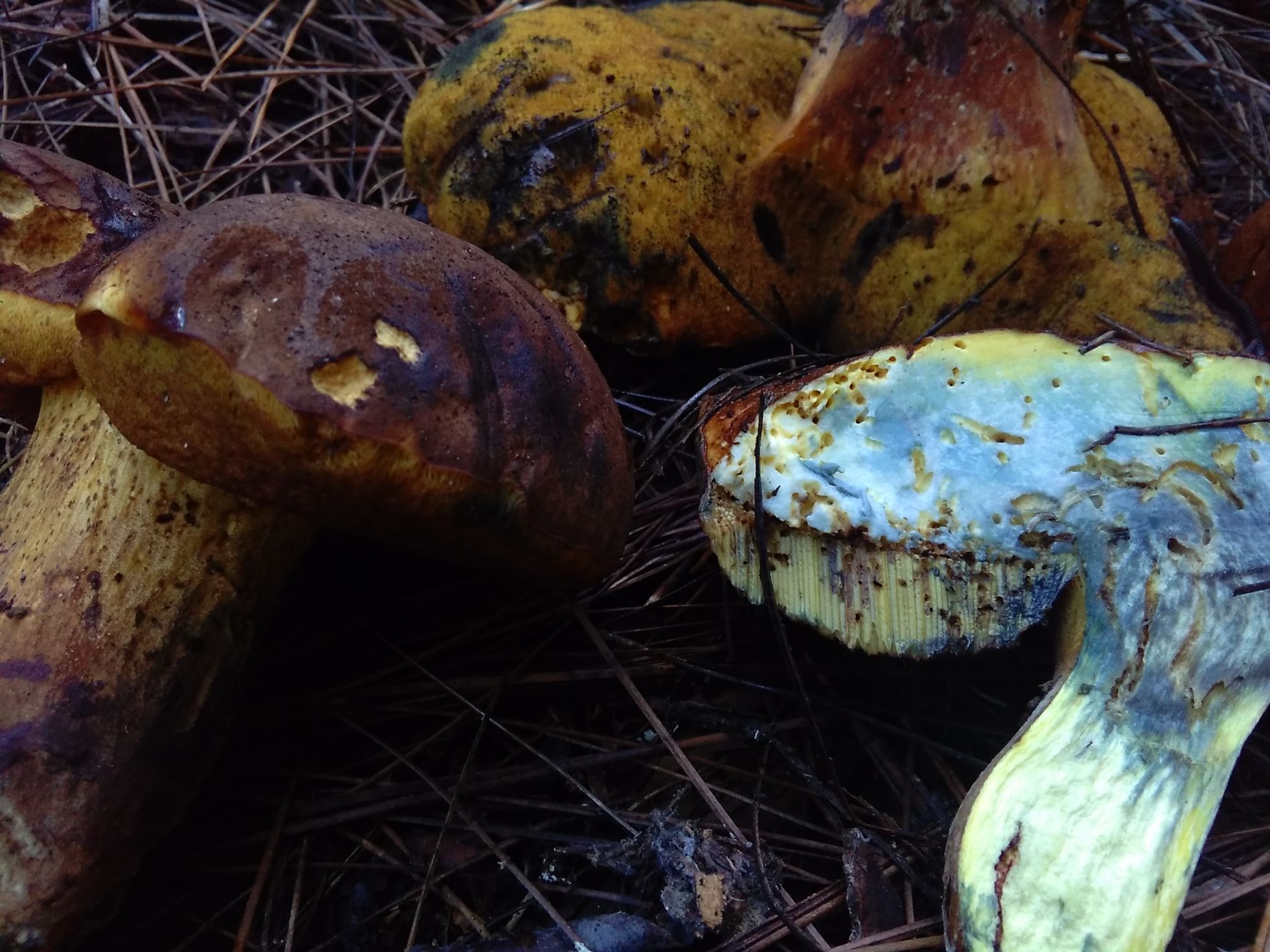 Antes que nada discúlpenme por la mala calidad de las fotos pero salí a pasear con las perras y no me llevé la cámara, las saqué con el móvil. Los siguientes ejemplares creo que son suillus pero ¿cuál podría ser? Azulea al corte y también si se hace una impresión en el himenio.