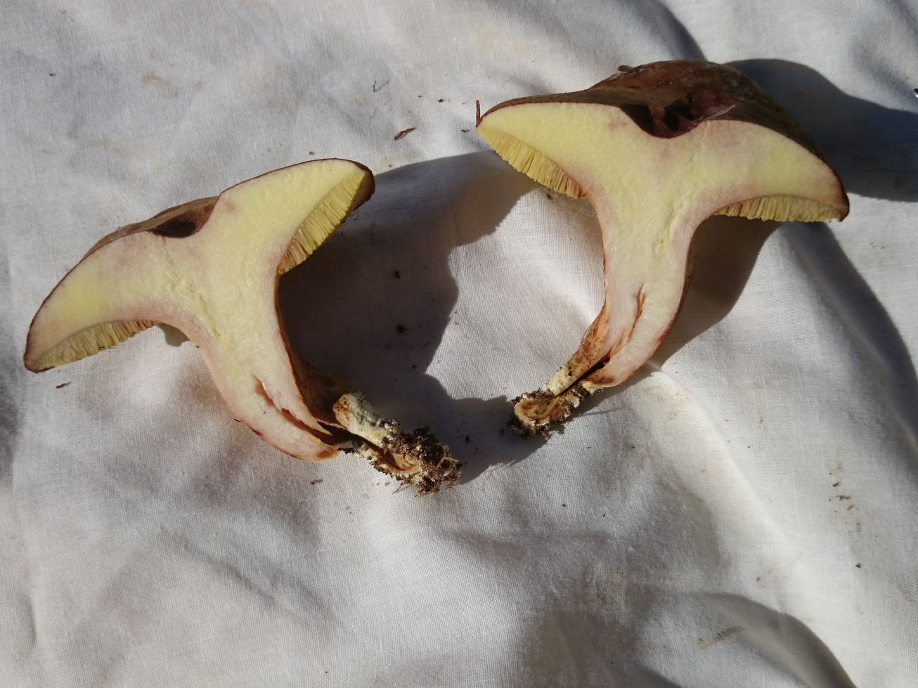 Esta mañana he encontrado estos dos ejemplares y revisando las fichas micológicas es lo más aproximado que he encontrado. Aunque tengo que decir que, aunque en las fotos no se distinga bien, el color de la carne es amarillo. Tanto la carne como los poros permanecieron inmutables al corte y al tacto.