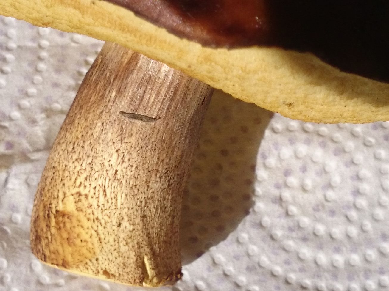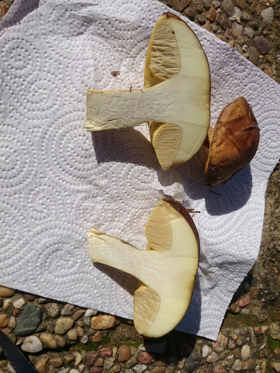 Pues, la verdad, si no hubieses aclarado que ni la carne ni los poros azuleaban lo más mínimo al corte ni al tacto... hubiese pensado que era un badius. Pero en estas condiciones, puede ser el que indica Josep: Xerocomus ferrugineus.