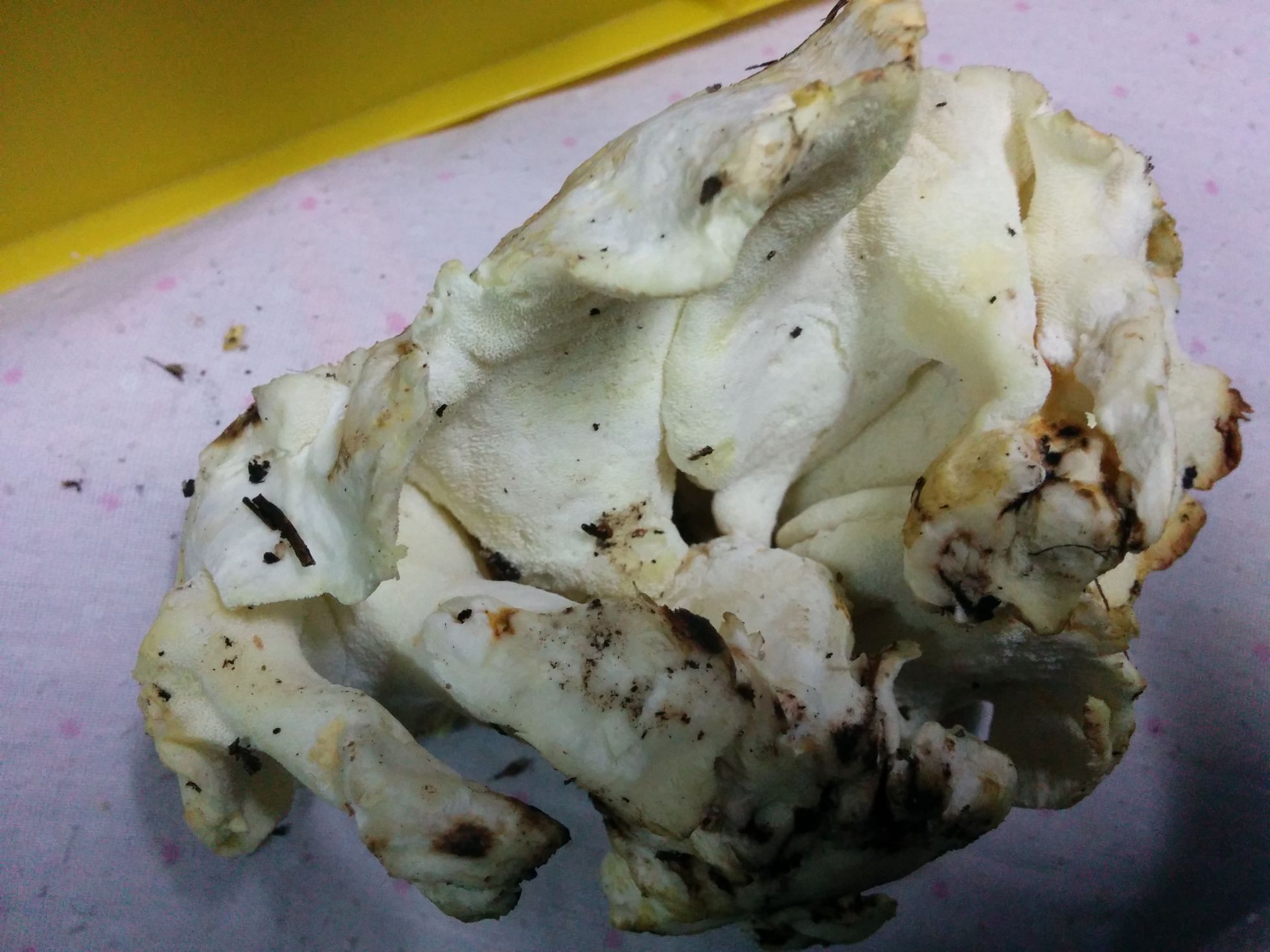 Hola amigos, tengo dudas sobre esta seta, encontrada en pinar, a uno 1700 metros de altura. La empecé a recoger pensando que eran Hydnum albidum, o algún tipo de Hydnum. De repente recapacité, las miré bien y observé que se encontraban en racimos de grandes dimensiones la mayoría de ellas, habiendo alguna suelta alrededor, las puas del inferior del sombrero no eran muy grandes, casi diría que era una textura como el terciopelo. Decidí llevar algunas a casa para averiguar algo más sobre ellas.Todo esto sucedió el otoño pasado y no recuerdo donde vi la información que he buscado sin conseguir volver a encontrarla. Bien, una vez en casa noté un fuerte olor no muy agradable. Como he dicho encontré información de que era tóxica. Alguien podría aclararme que seta en concreto es y como no equivocarse con las Hydnum comestibles? Un saludo, Os adunto dos