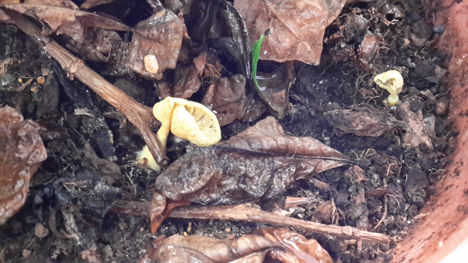 Creo que José está en lo cierto, el Leucocoprinus Birnbaumii aparece frecuentemente en los tiestos y jardines ya que viene con el sustrato vegetal que utilizamos habitualmente para rellenar los mismos. Si dejas crecer los ejemplares pequeños verás que se trata de la especie, el ejemplar que nos presentas está bastante deteriorado.