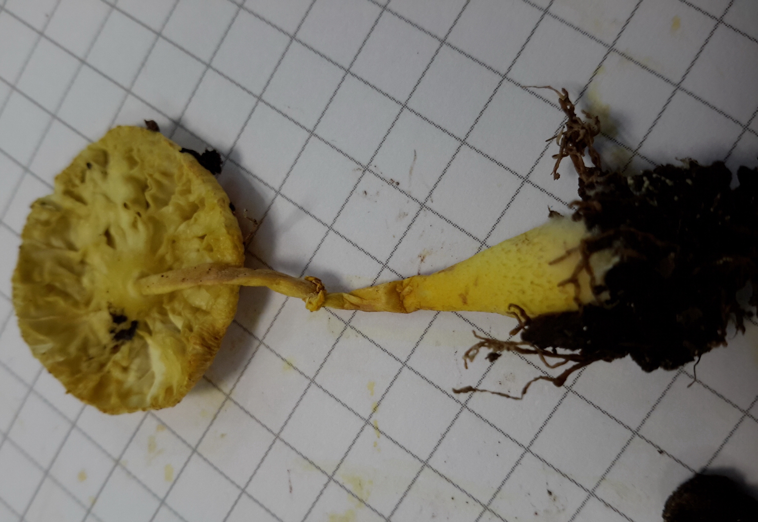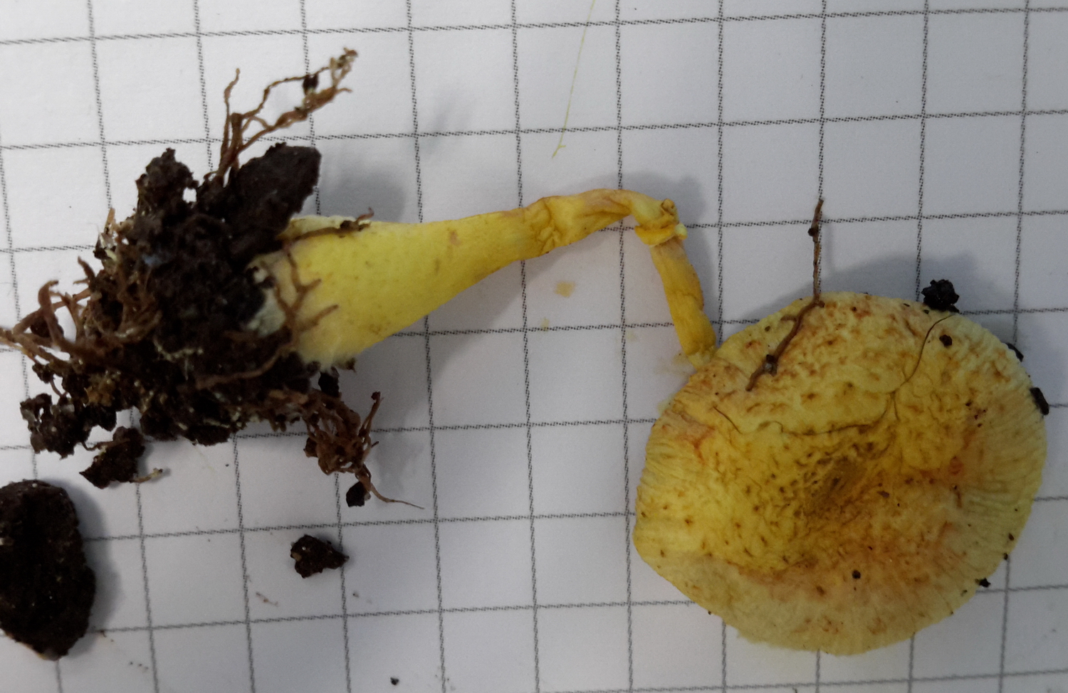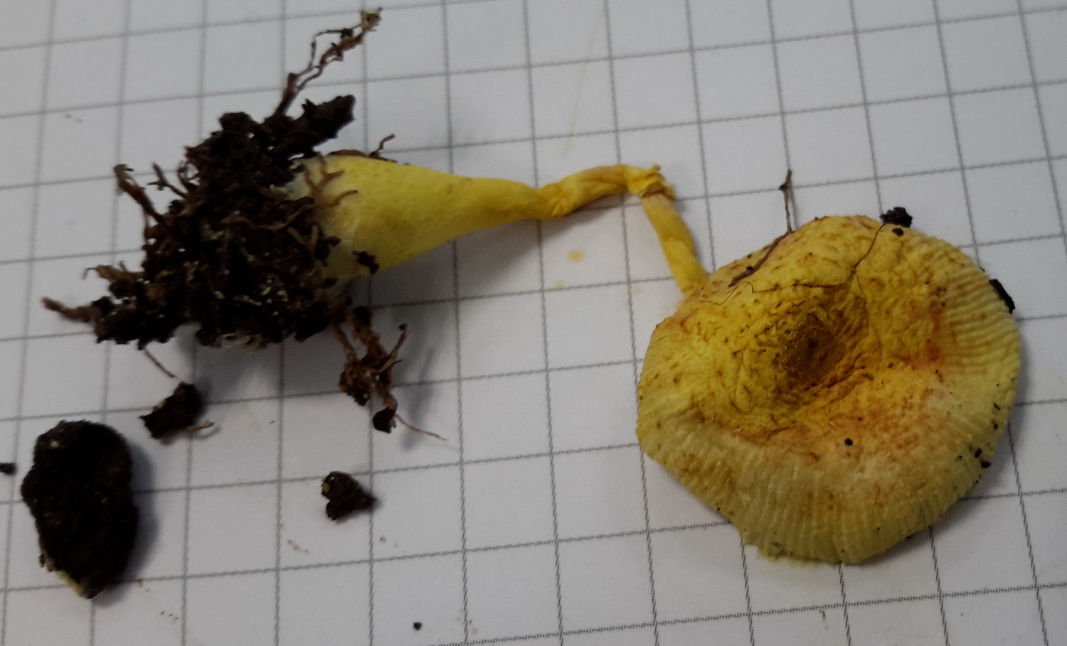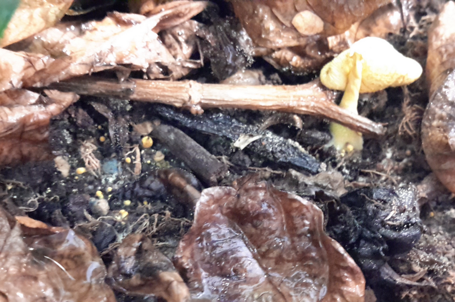Y acercándome un poco más compruebo que es una seta con un color amarillo muy bonito y que a su izquierda aparecen una serie de puntitos amarillos que parecen más setillas en desarrollo: