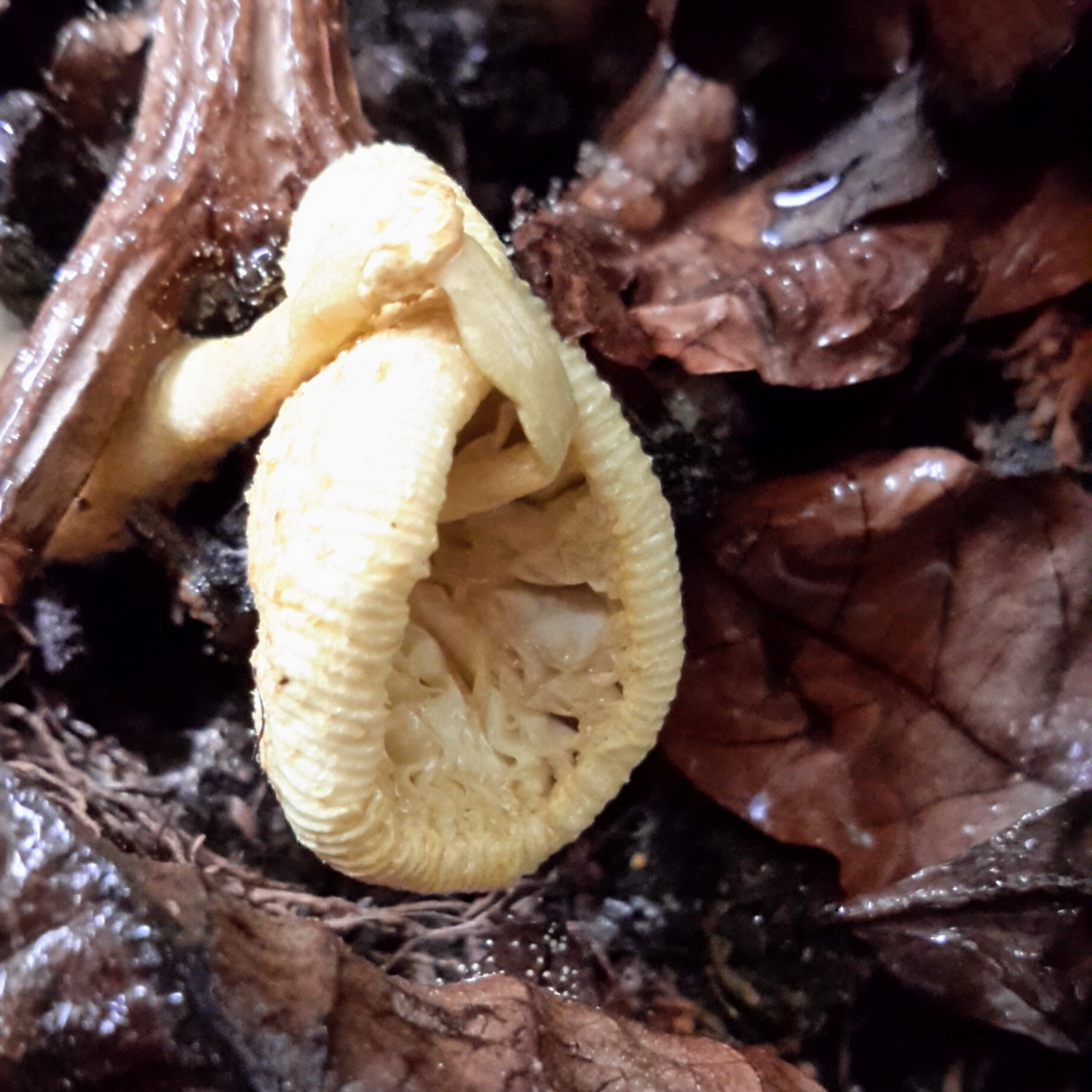 Y dándole la vuelta se aprecian unas laminillas y casi en medio del pie, cuyo ancho se va incrementando notablemente hacia la base, aparece un anillo, todo ello concoloro con el margen amarillento del sombrero, el cual tiene en su centro una especie de mamelón mas oscurecido: