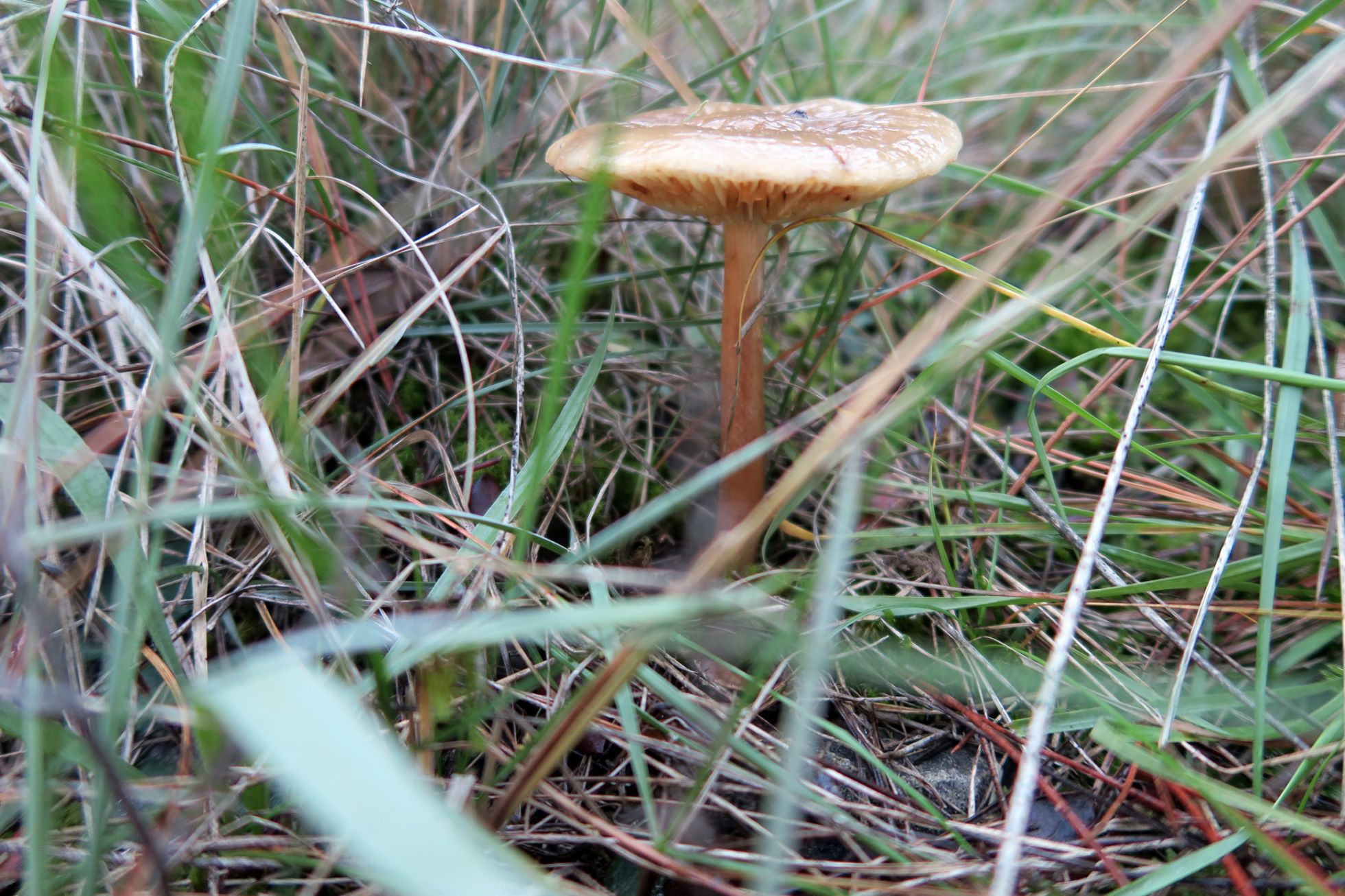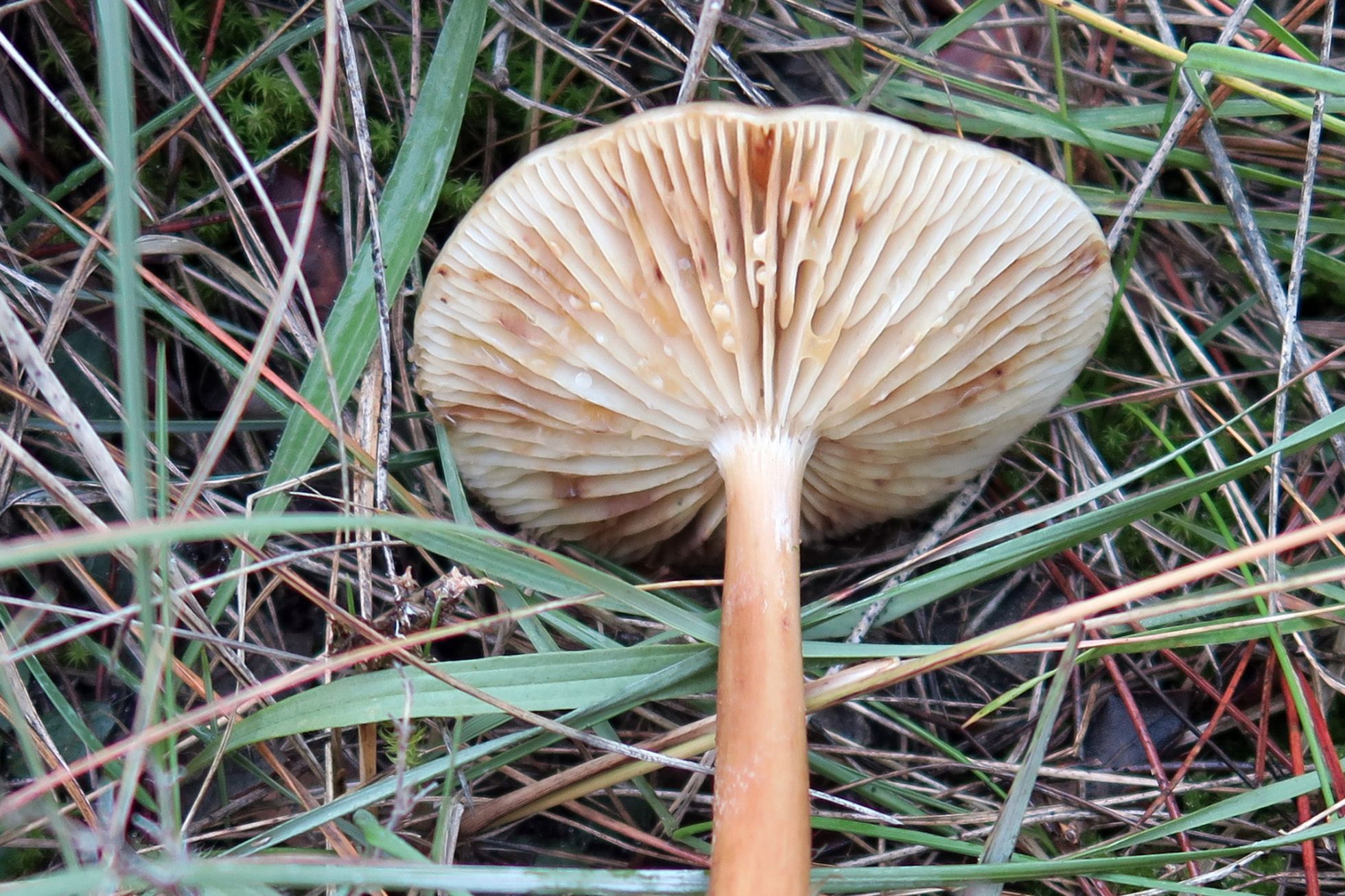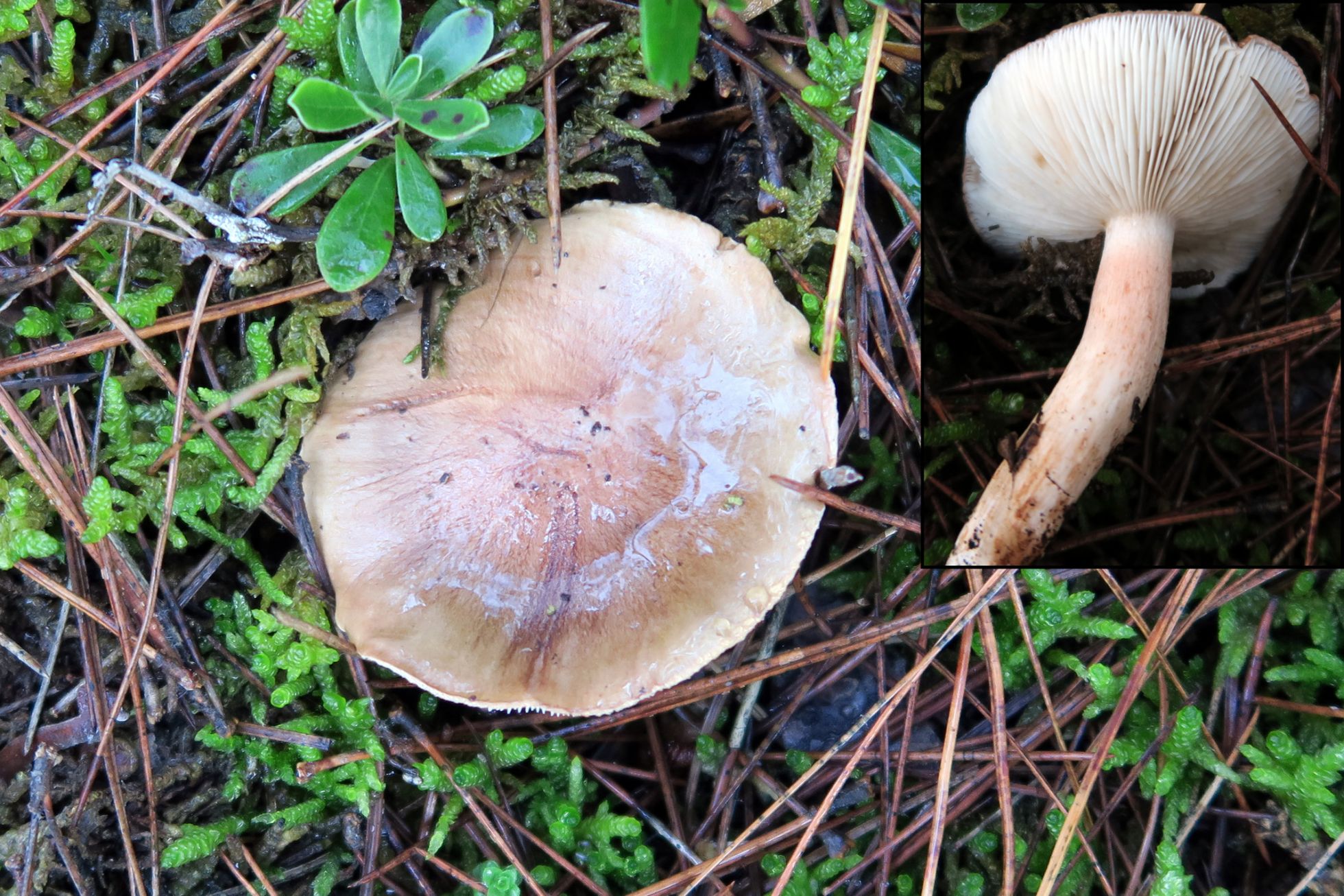 Esta de esporada blanca, no tengo nada claro que se trate ni tan siquiera de un Tricholoma, presenta una serie de detalles que la hacen especial. El sombrero aplanado y con una cutícula muy viscosa, como gelatinosa, este presenta unos surcos o hendiduras radiales anchas , dispuestas radialmente sin llegar al centro ni a los bordes, el borde mas claro. La cutícula del sombrero es separable , y bajo esta la carne se presenta como aterciopelada. Las láminas estre adnatas y sinuadas, están bastante separadas, con abundantes lamélulas, lo más característico de estas es que exudan unas gotitas de latex. La carne del sombrero es escasa, de color claro y de sabor insípido, poco agradable debido a la textura gelatinosa del sombrero. El pié muy fibrado longitudinalmente y hueco en su interior, este es muy largo y radicante , terminaba aún con una raiz de unos 2 cm. que no se aprecia en la imagen ya que se me rompió al manipularlo, estaba bien agarrado al suelo. No se de que puede tratarse, siento una especial curiosidad por esta especie, no me cuadra con Hygrophorus, tampoco con Tricholoma, ni con Rhodocollybia , etc.