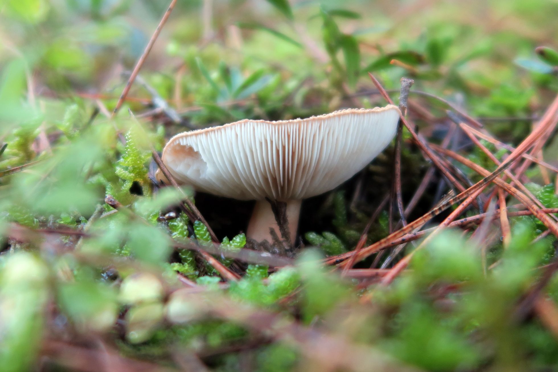 De esporada también blanca, el sombrero aplanado y cutícula con fibrillas radiales un poco mas oscuras, esta se separa facilmente del sombrero, al igual que la anterior, las láminas en este caso son mas apretadas y con lamélulas, láminas adnatas y un poco decurrentes por un diente. El sabor de la carne es dulce. El pié en mas largo que la primera y con escamitas de color pardo en su superficie. No se si podría tratarse de Tricholoma Focale, tengo un montón de dudas.