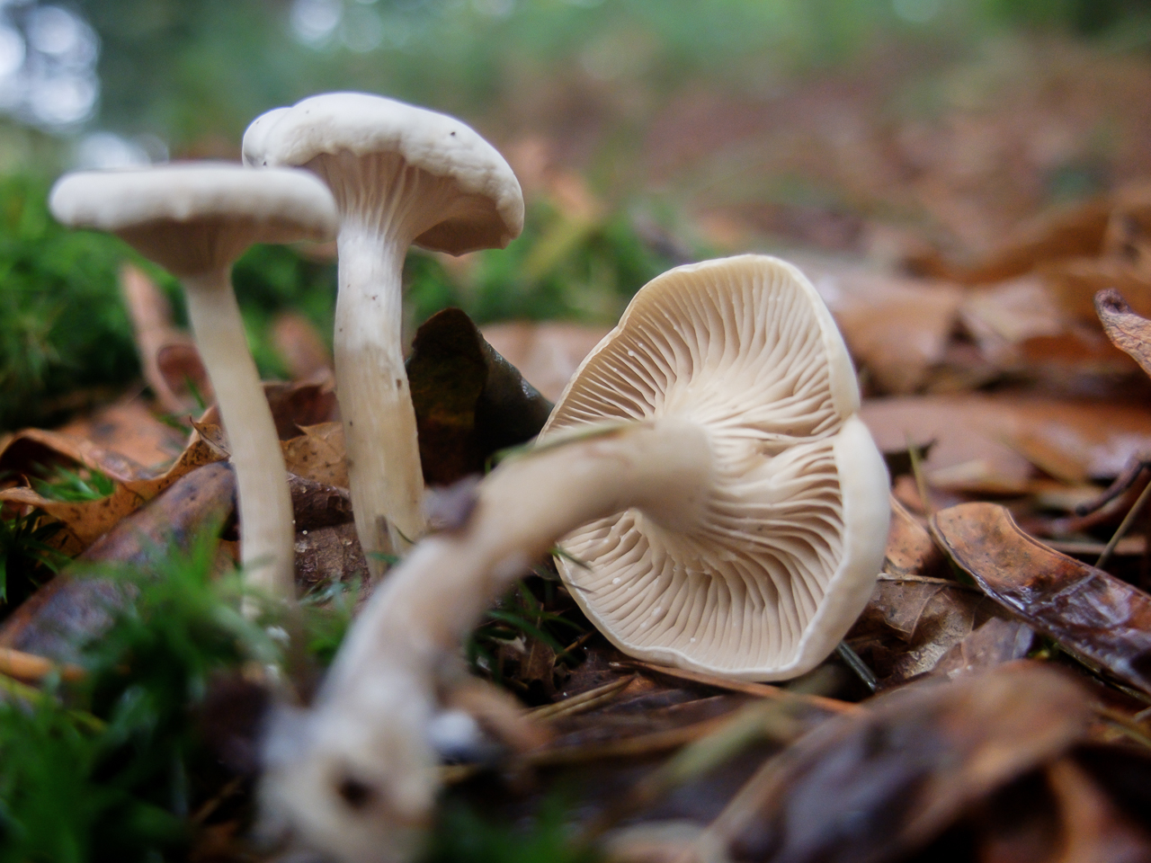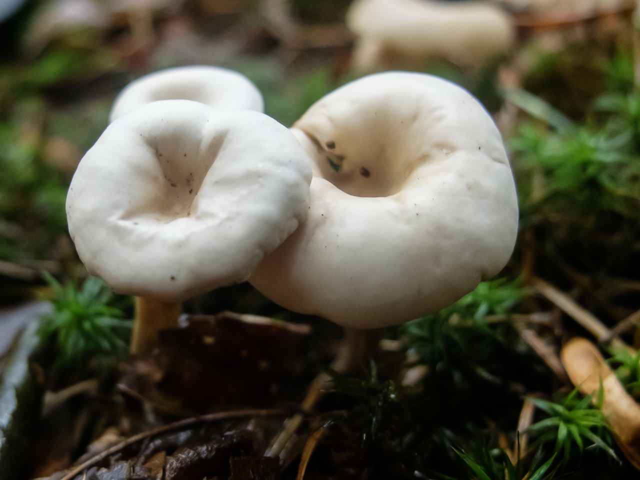 En cuanto a la segunda tiene apariencia de clitocybe blanco, pero exhuda latex blanco, un lactarius blanco y de poco porte, unos 2 cm de diametro de sombrero, no sé ......