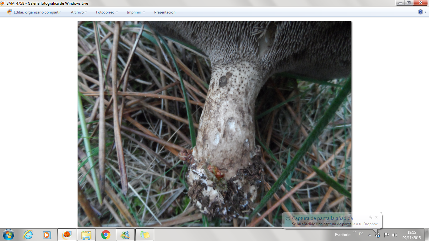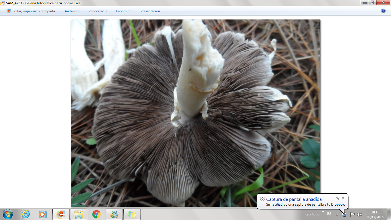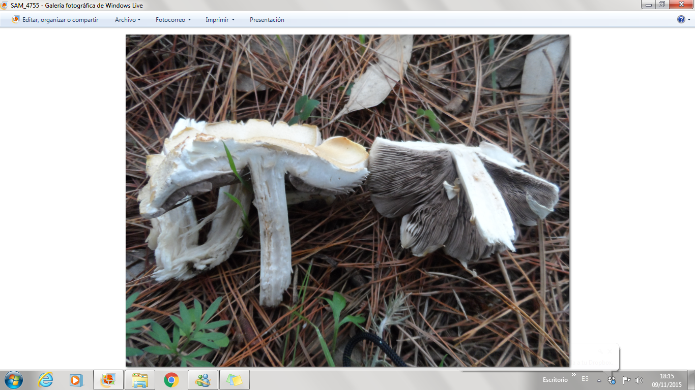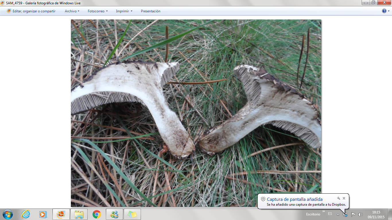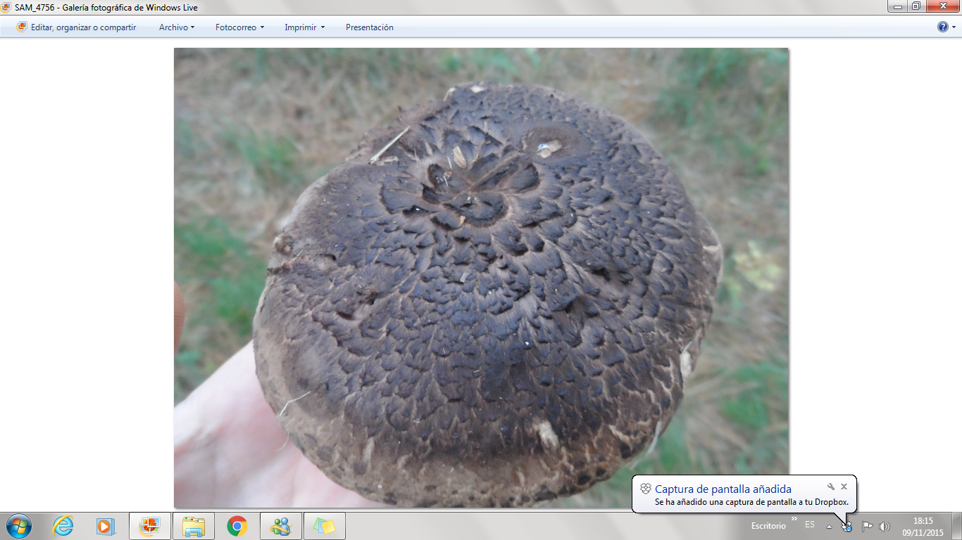 Las tres siguientes fotos creo que corresponden a un Agaricus sp, pero no me atrevo a comer sin identificarla . Característico olor anís y ya veis las fotos, láminas oscuras-rosadas, esa especie de escamas amarillas pero no amarillea el sombrero ni el pie al tacto