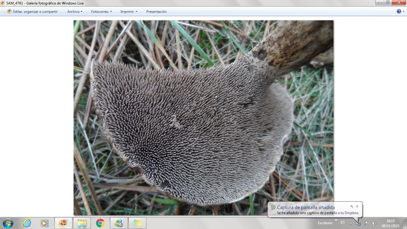 Y aquí la última, una especie de Hydnum (lo digo por el tipo de himenio) pero un color ocre-negruzco, escamado en el sombrero y con el pie compacto. El olor bastante extraño, no diría desagradable pero al mismo tiempo familiar, siento ser tan ambiguo.