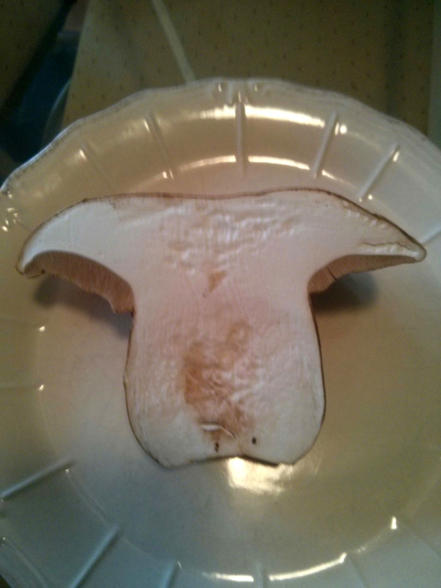 Este es muy blanco y marrón chocolate por fuera. Parece un boletus beningno y tenemos pocas dudas de que sea bueno, pero nos gustaría identificarlo.
