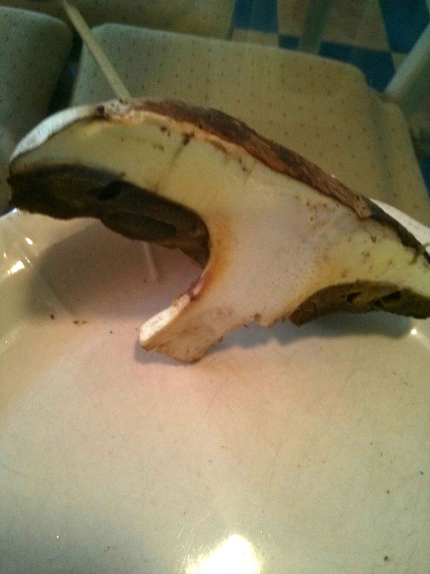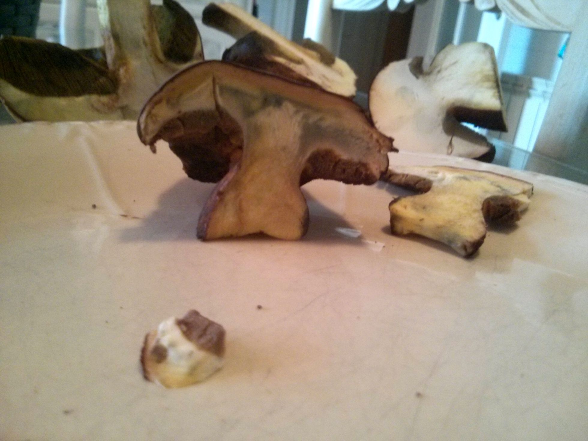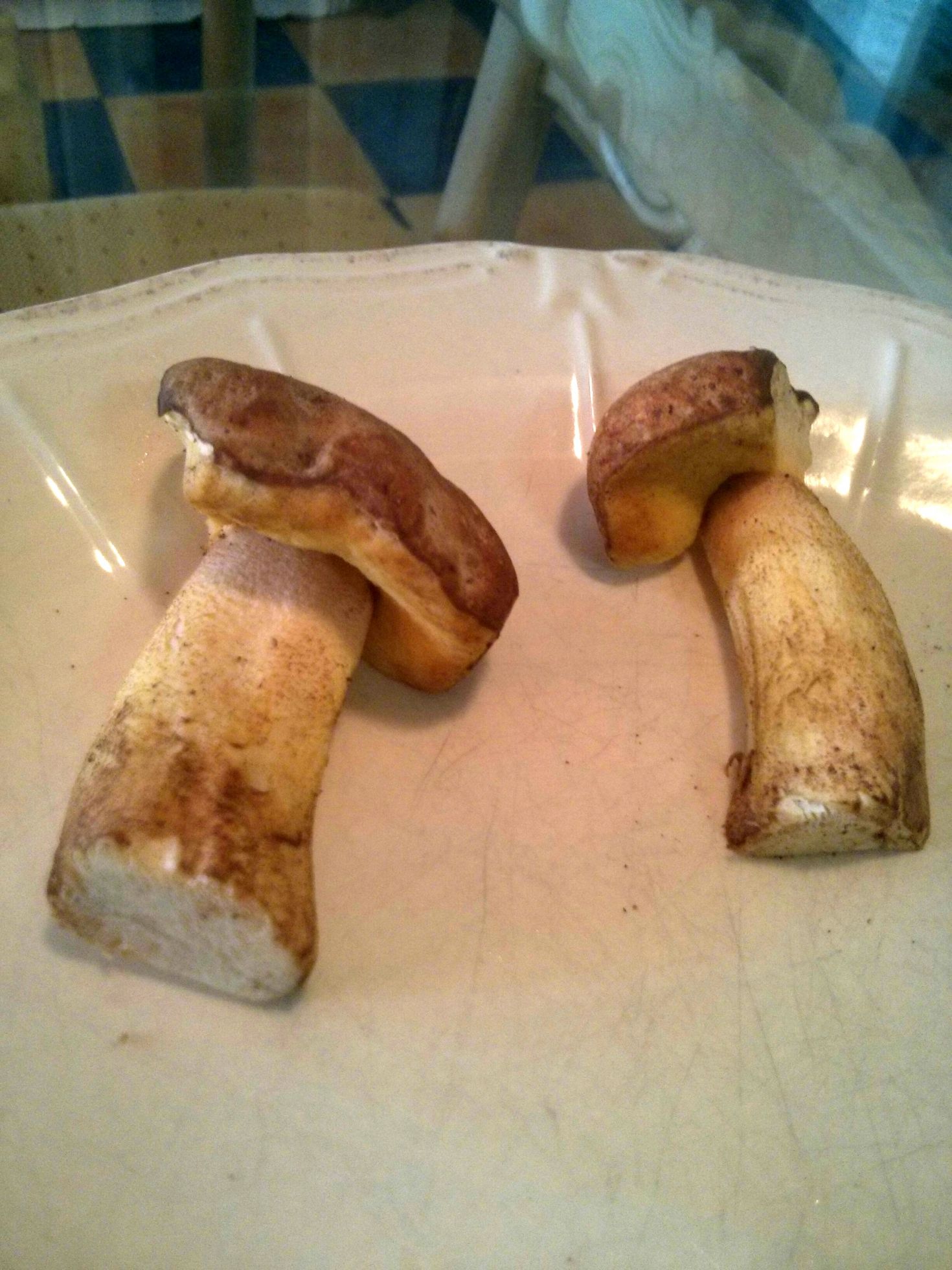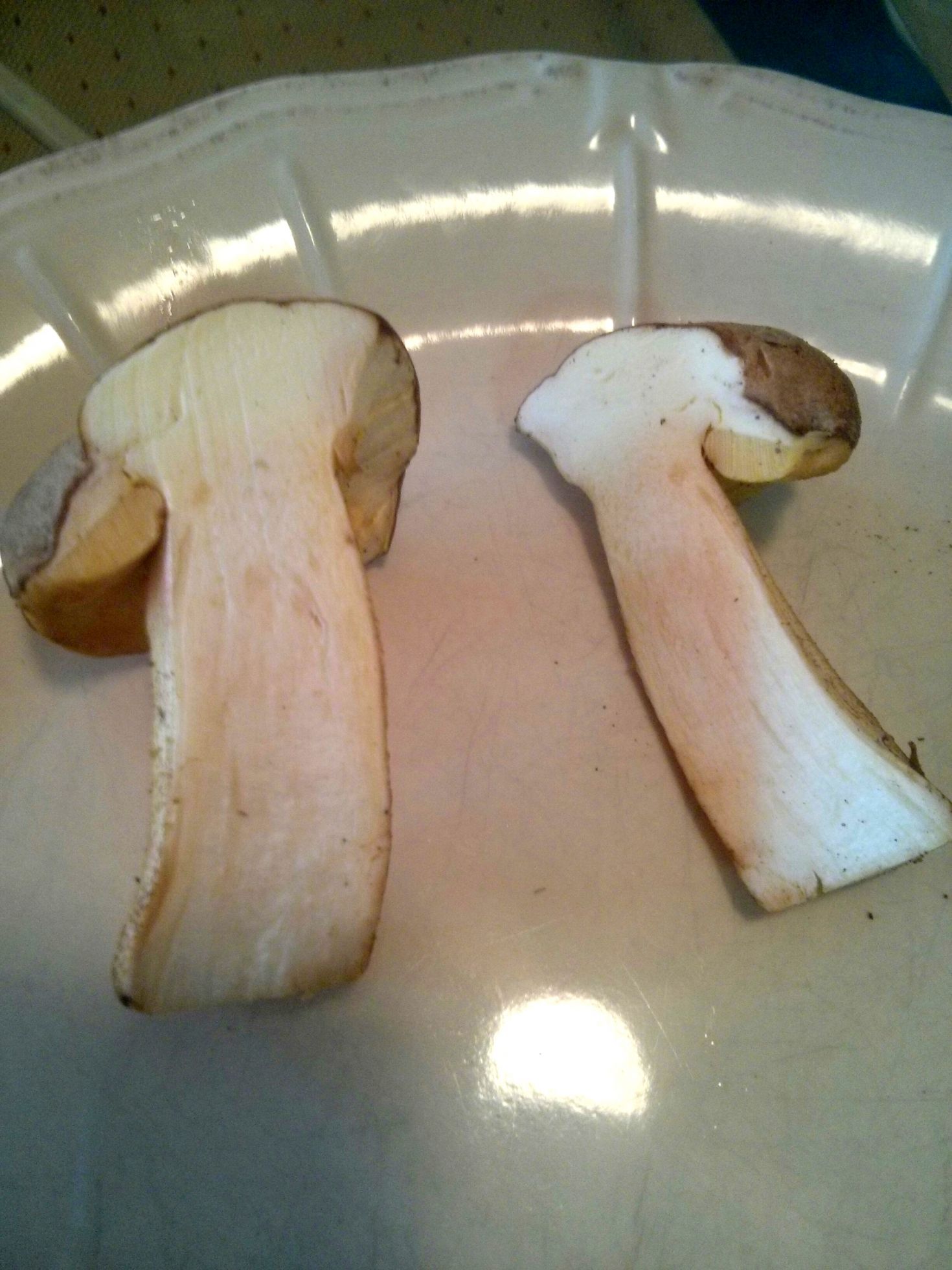 Este es muy blanco y marrón chocolate por fuera. Parece un boletus beningno y tenemos pocas dudas de que sea bueno, pero nos gustaría identificarlo.