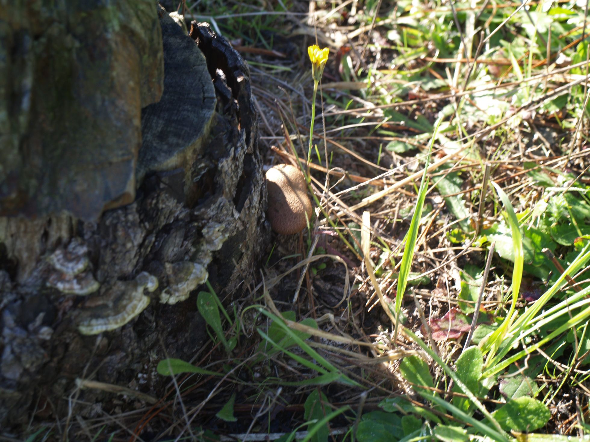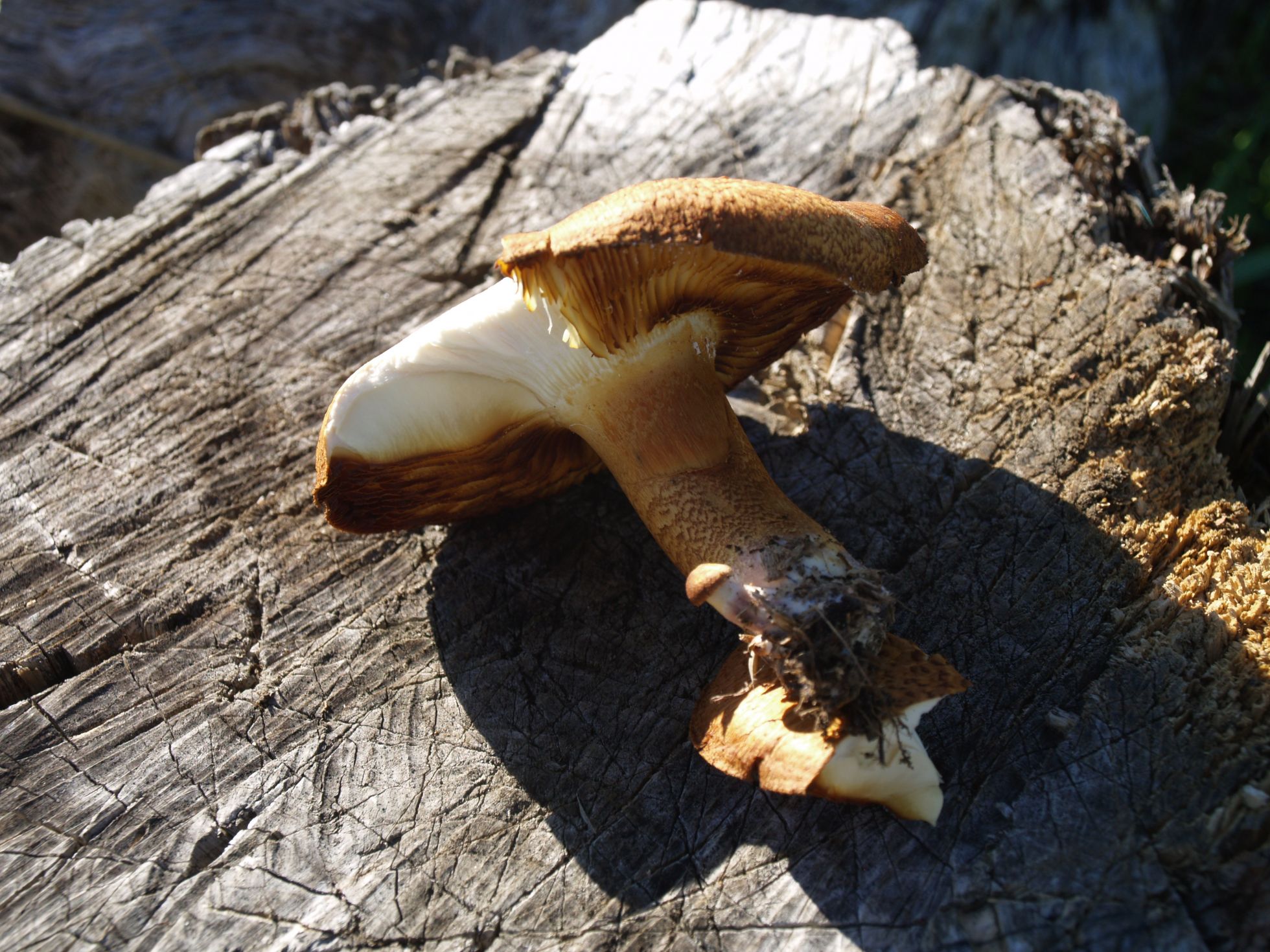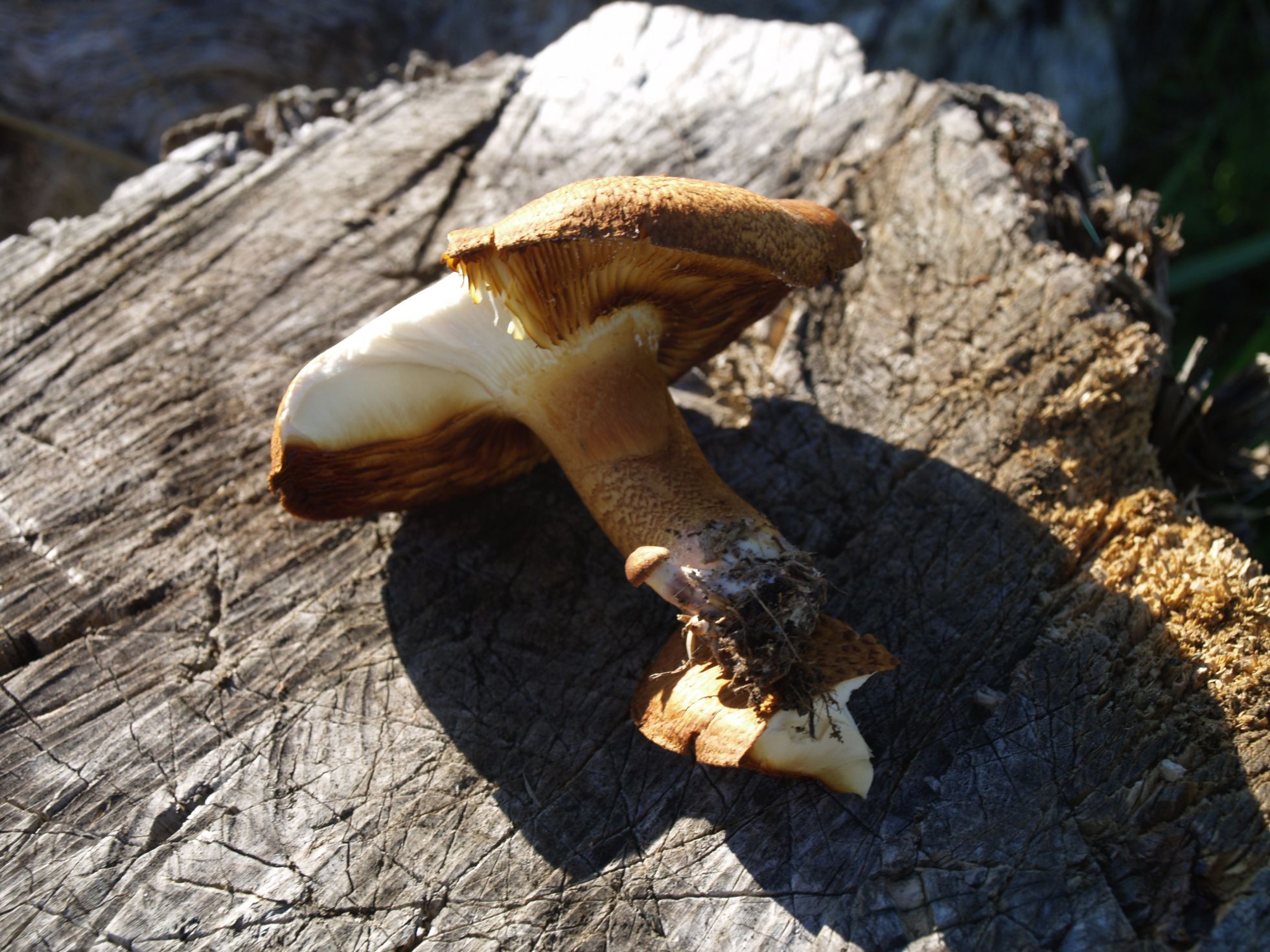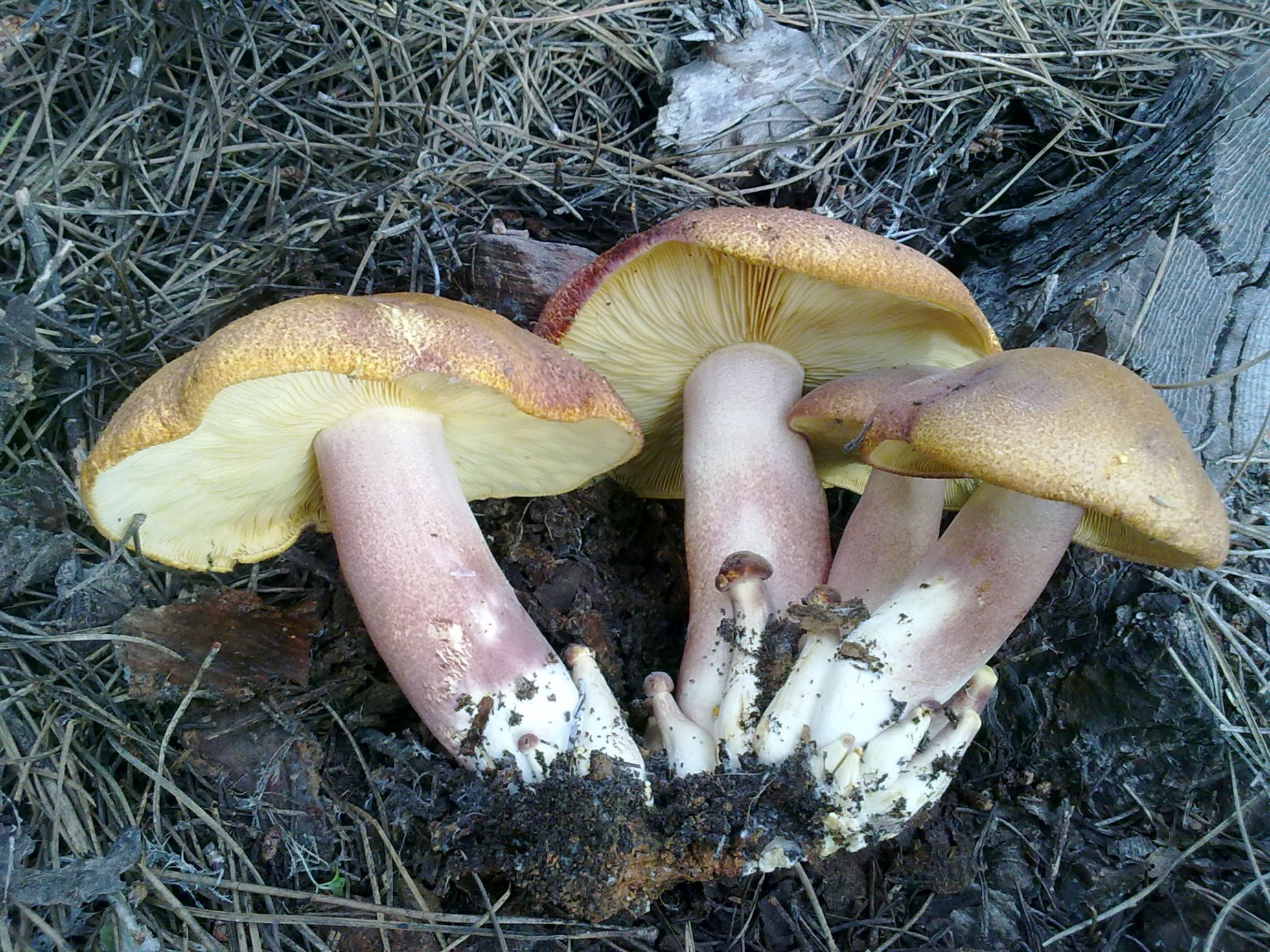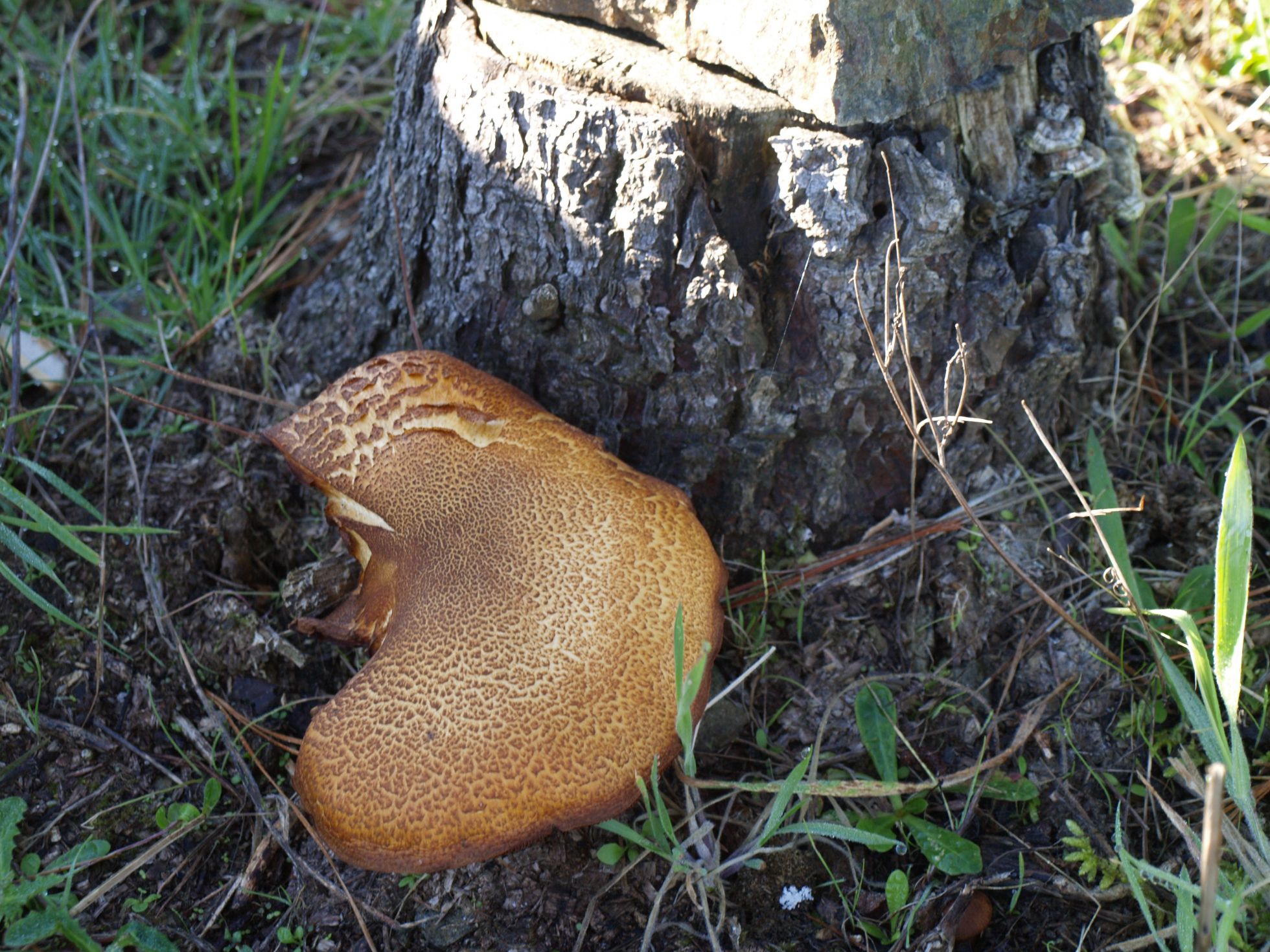 Sí el tocón es de pino, se ve bastante claro y quizá sea una tricholoma pero la tuya parece diferente sobre todo el pie, en la que mandas es vinosa y esta es más de la tonalidad del sombrero, poco más puedo decirte.