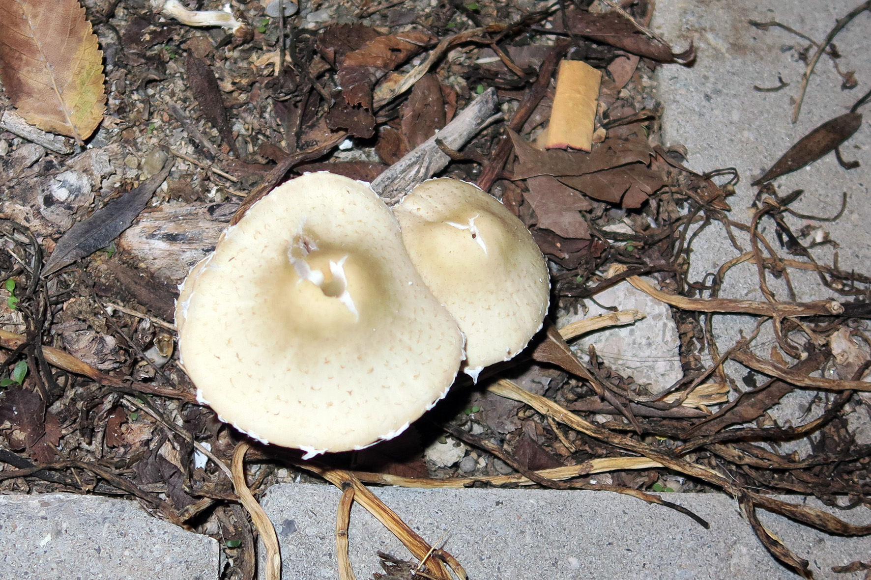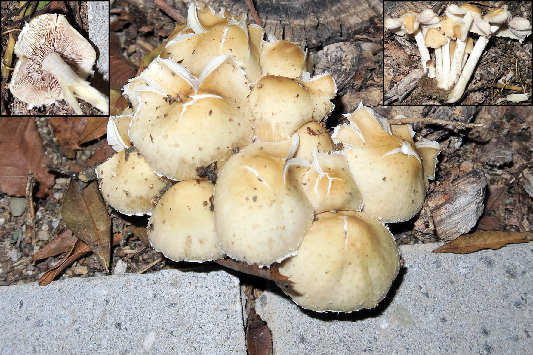 La especie brotaba sobre un tronco cortado de un ejemplar joven de Platanus hispanica, el que llamamos platano de sombra, el sabor era harinoso y como dulce, al igual que el olor. Por el color óxido oscuro de la esporada deduje que podía tratarse de Hypholoma capnoides, ya que cuadraba lo del sabor, aunque no me encajaba con el aspecto general , ni tampoco con el hábitat.
