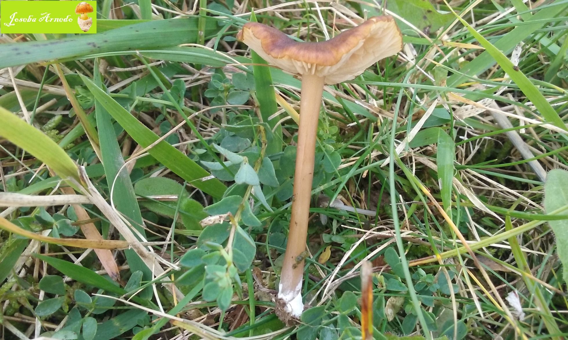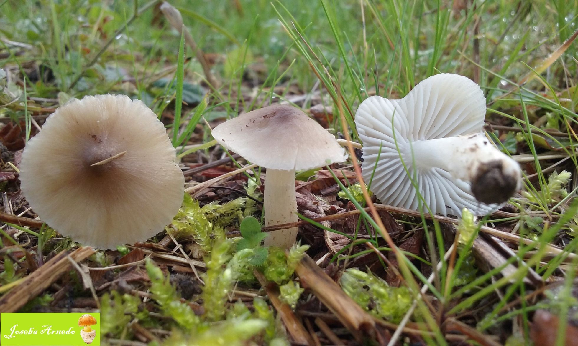 Esta pequeña Mycena se encontraba cerca de un setal de aetites y ha sido cuando he fotografiado estas ultimas cuando las he visto. Estas crecian sobre musgo y son de una coloracion mucho mas clara y la diferencia que mas me ha llamado la atencion es el pie, ya que es mucho mas robusto y corto por lo que levantan mucho menos del suelo. El sombrero a su vez tambien parecia algo mas robusto que en las especies que he visto en estas campas, aetites y olivaceomarginata.