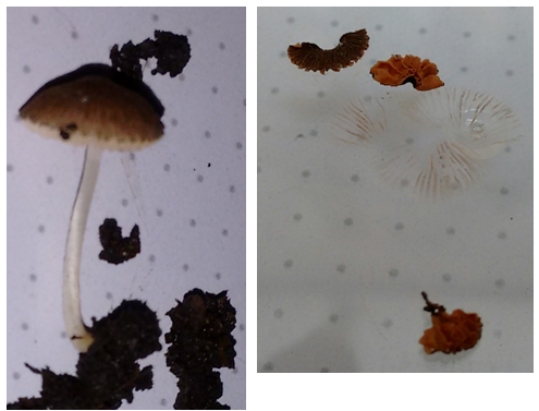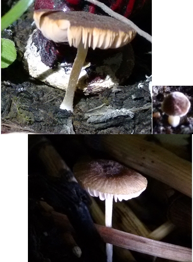 El ambiente es superhumedo, ya que el equisetum requiere mucha agua, la parte superior de las setas parece ser màs bien plana de no màs de 15mm, el tallo no supera los 2 cms y el color del capuchon parece ser un marron a marron oscuro hacia el centro.