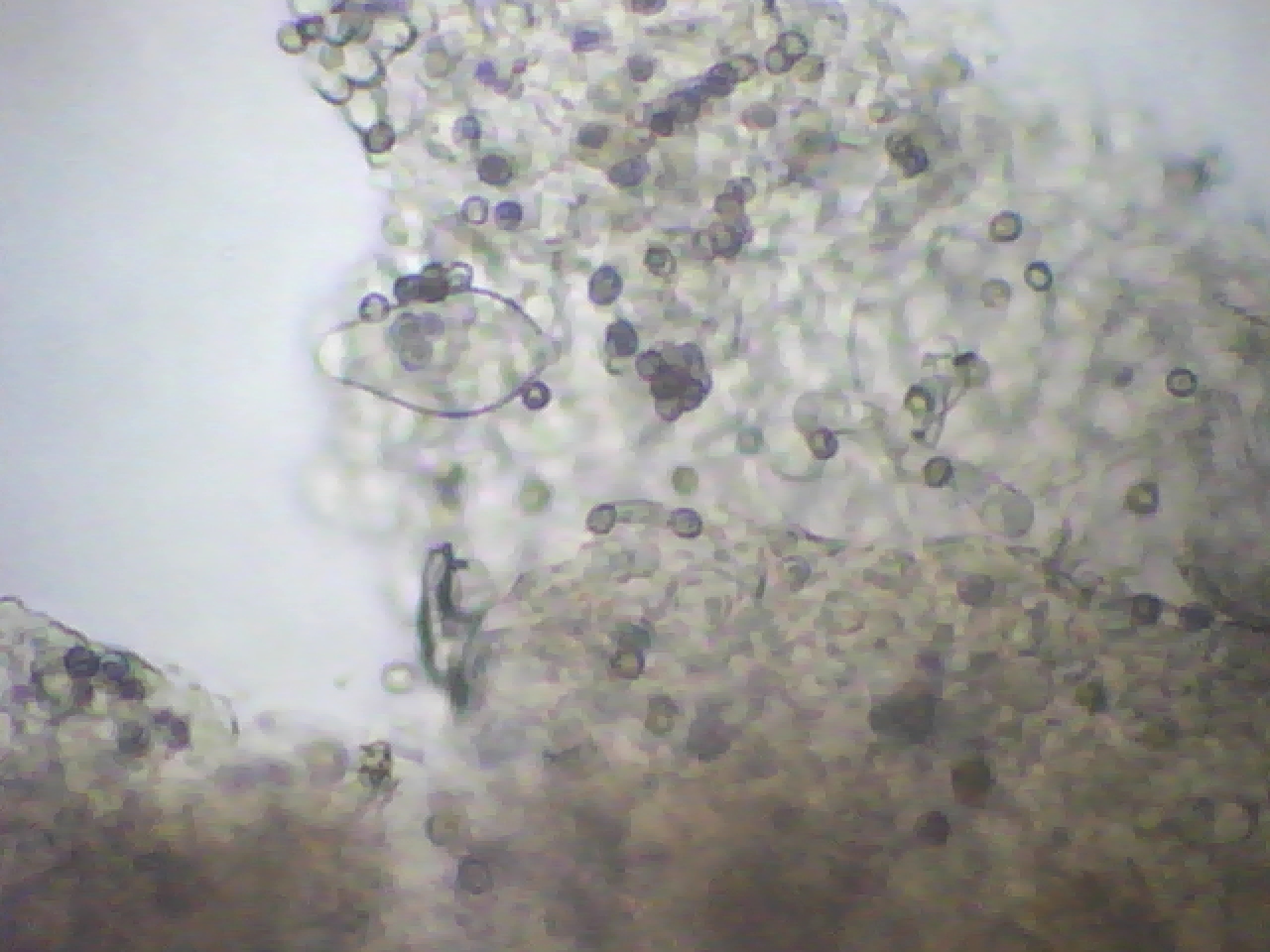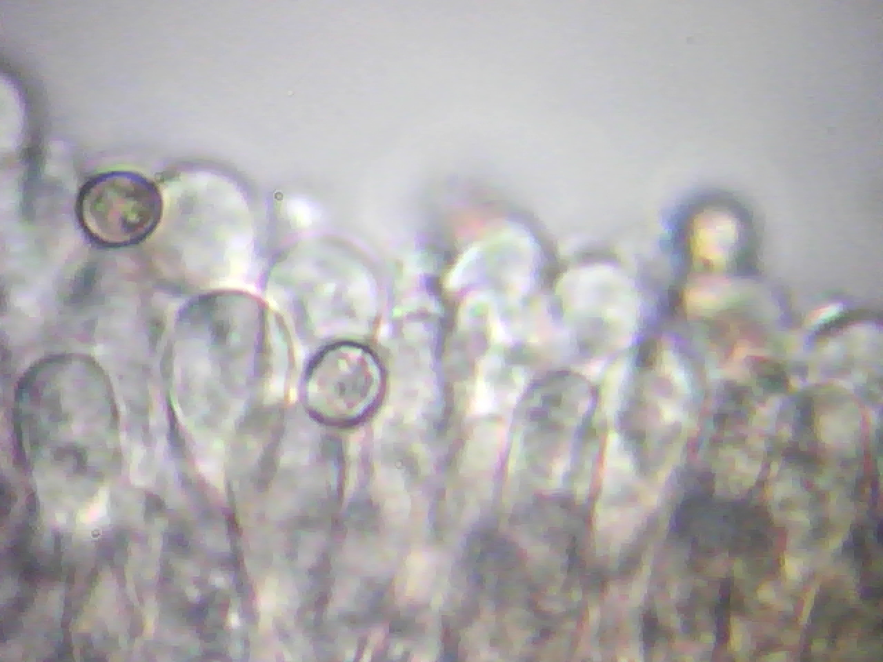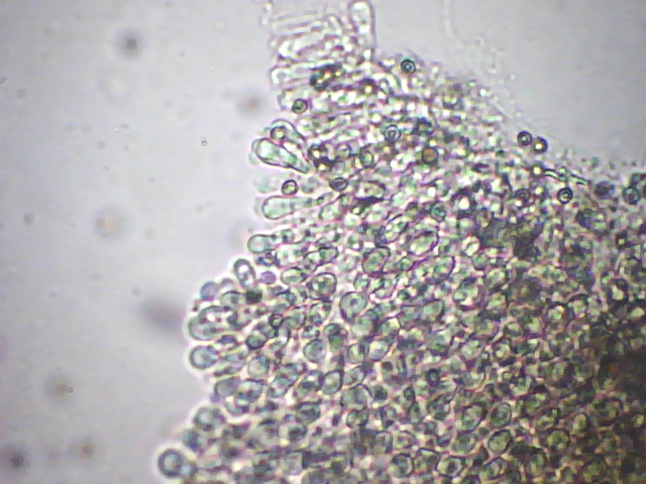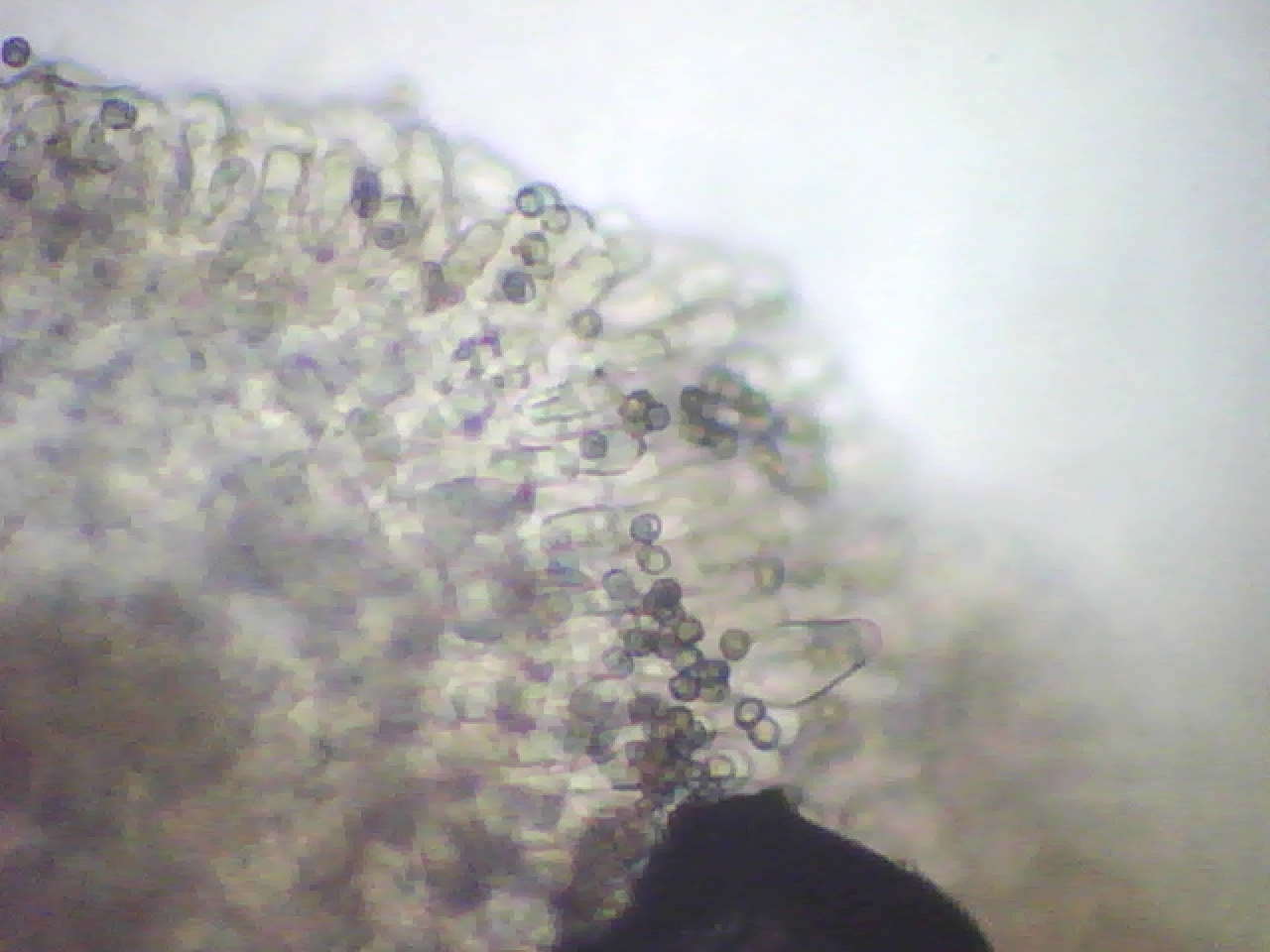 La segunda y tercera fotos son de las láminas y se ven perfectamente varios basidios, algunos de ellos con las esporas aún sujetas.