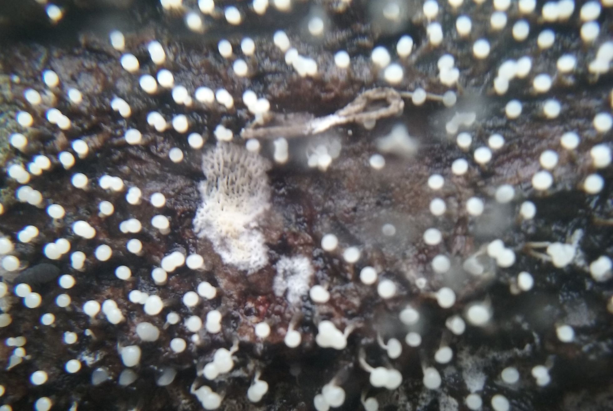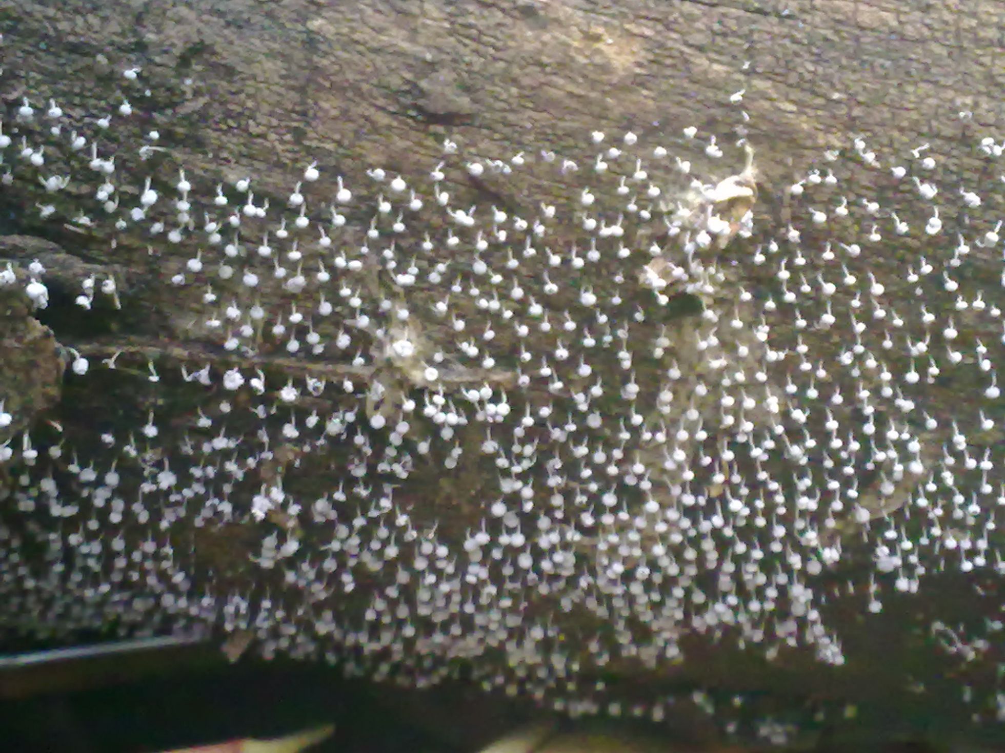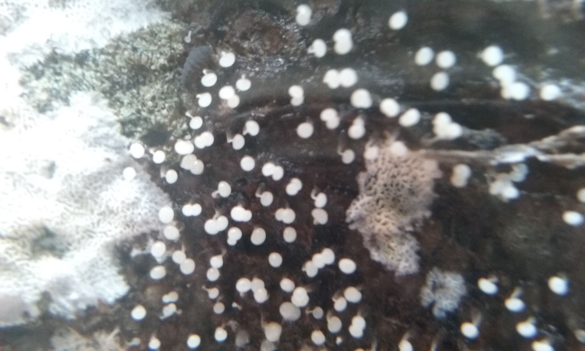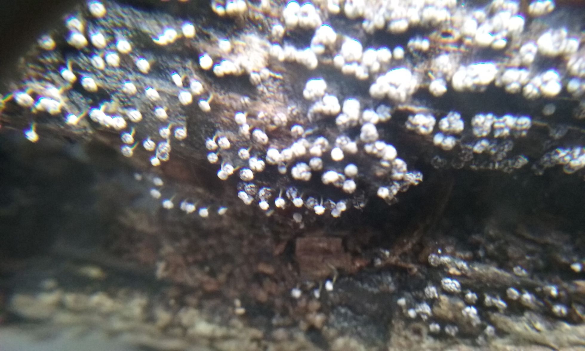 Estas preciosidades las he encontrado al dar la vuelta a una vieja rama. Perdonad la calidad pero bastante he hecho consiguiendo que se vea algo con el movil y mi lupa delante. No medirian mas de 2 mm y se encontraban sobre madera de Quercus. Son circulares con un pie bastante estrecho. En un primer momento son blancas y en la madurez toman unos tonos grisaceos. Lo mas parecido lo he visto por el genero Trichia pero no lo veo nada claro.