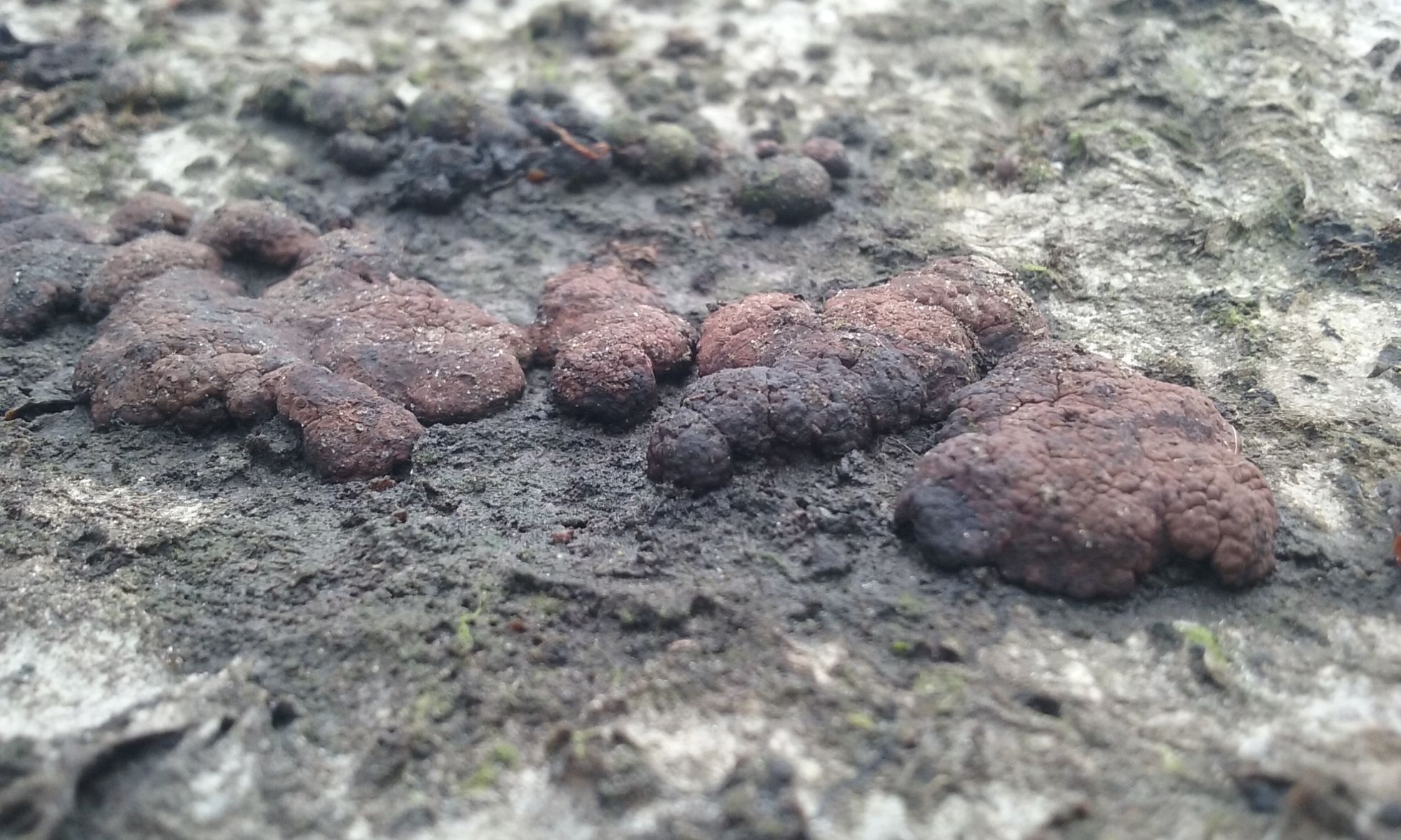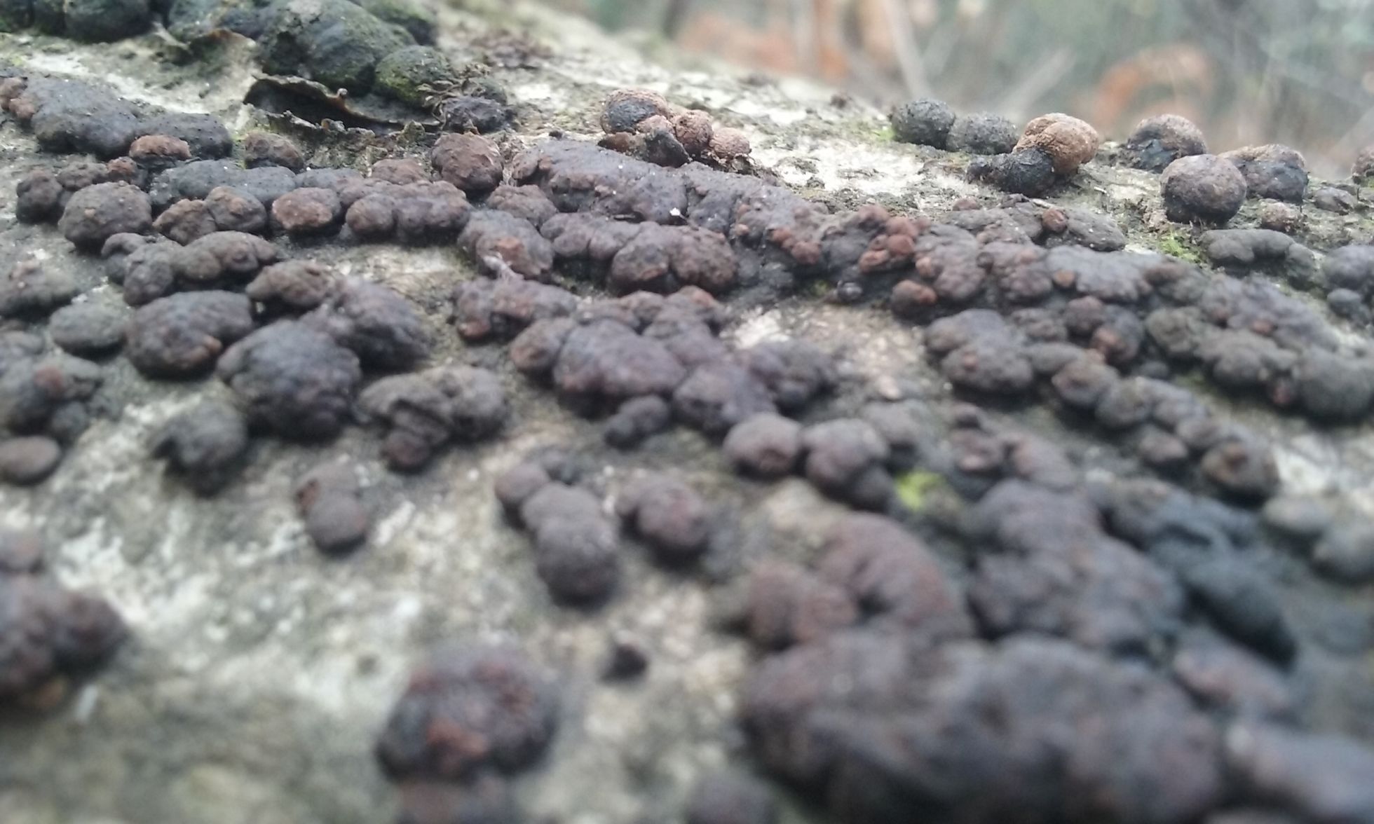 Por mi zona no son nada frecuentes los Xylariaceae pero teniendo en cuenta el hábitat que mencionas, bien podrían ser Hypoxylon confluens. El Hypoxylon fragiforme aunque prefieren las maderas de hayas, tampoco podemos descartar que salgan en otros tipos de planifolios. Un corte para ver el interior hubiera sido de gran ayuda. (te paso un enlace de la Hypoxylon confluens)