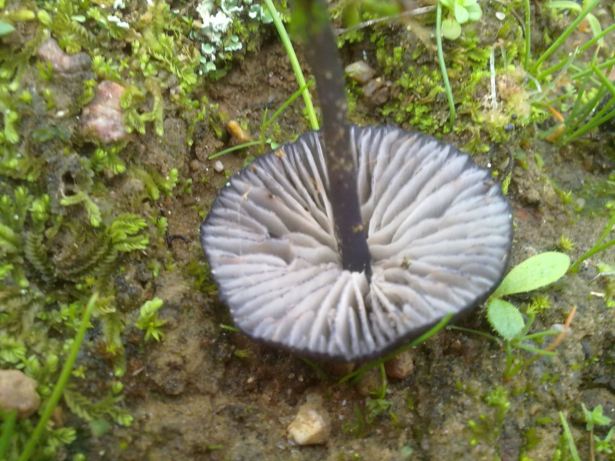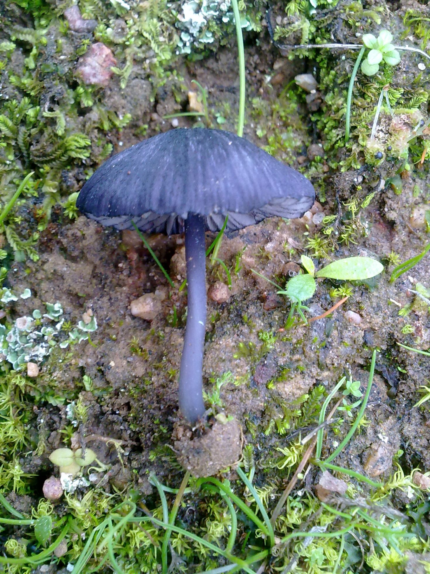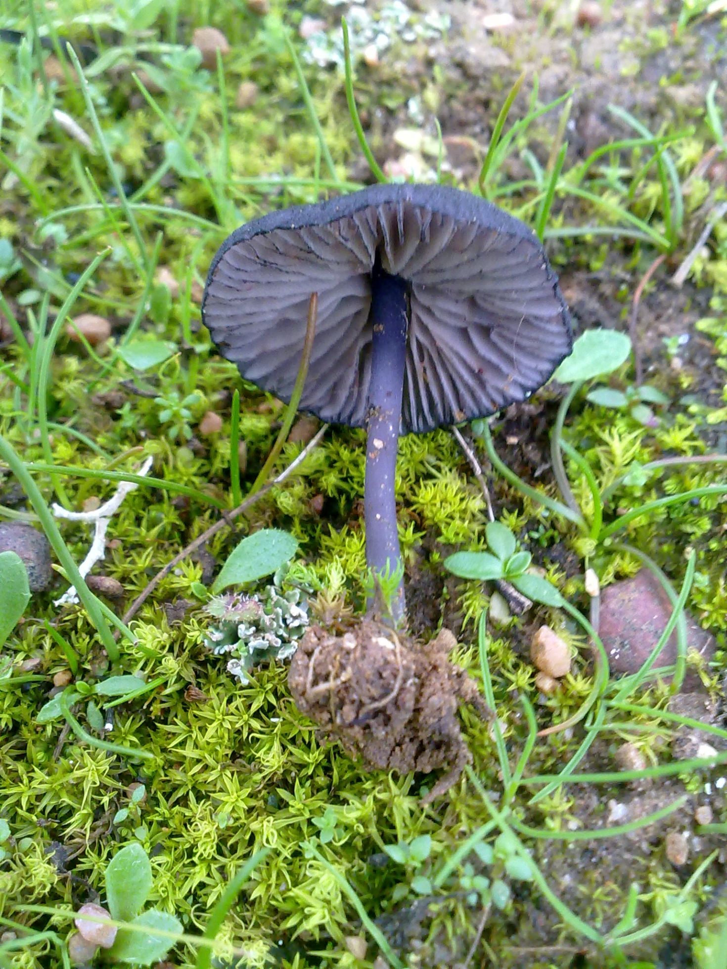 Encontrada en la provincia de Sevilla en suelo pobre y arenoso en el margen de un camino pero sin asfaltar. Sombrero pequeño de entre 1,5 y 2,5cms de un color violáceo muy oscuro casi negro, parece que algo deprimido en la zona central. Pié algo mas claro y liso sin restos pruinosos en su base. Láminas con arista del mismo color que el sombrero.