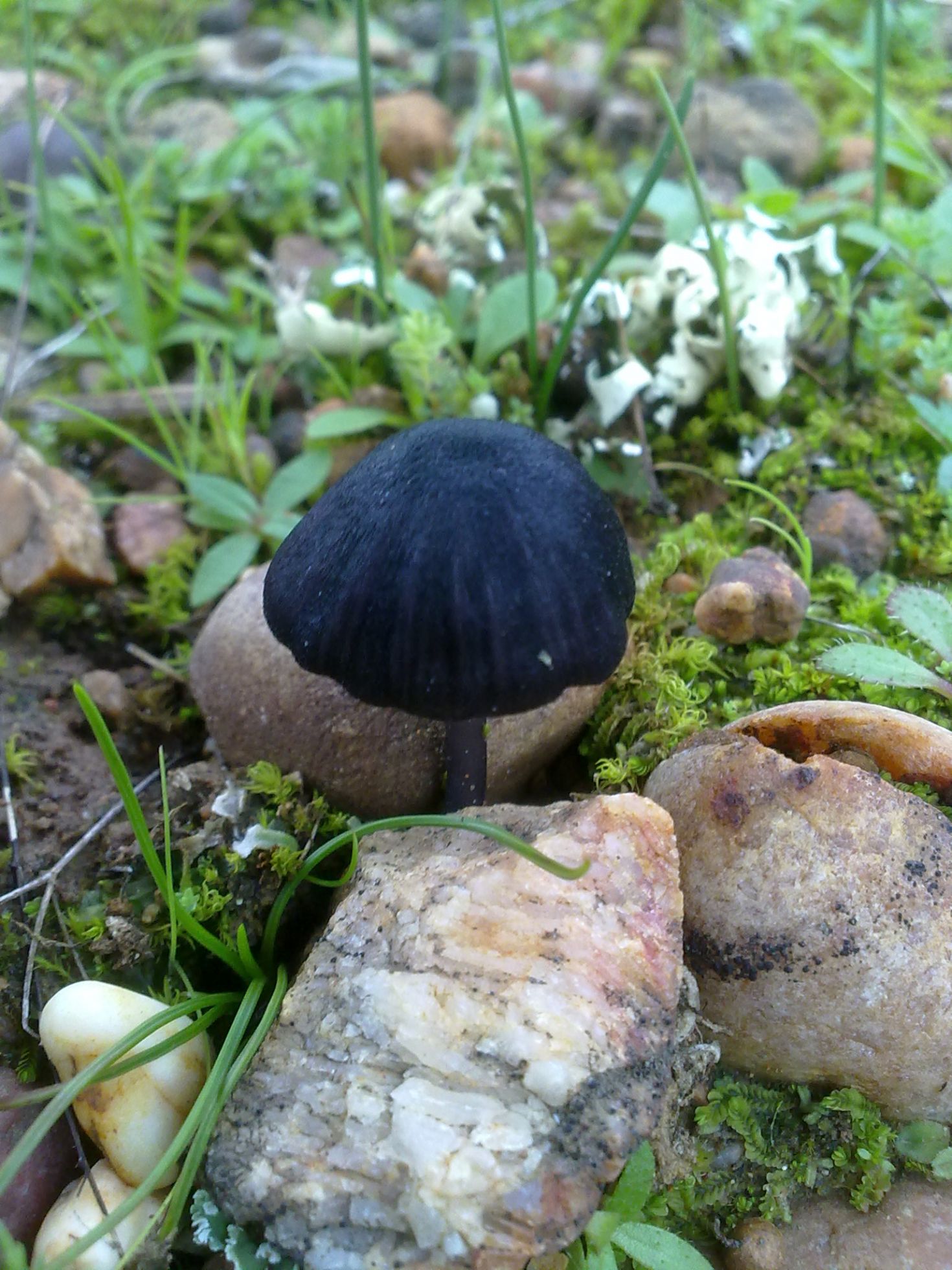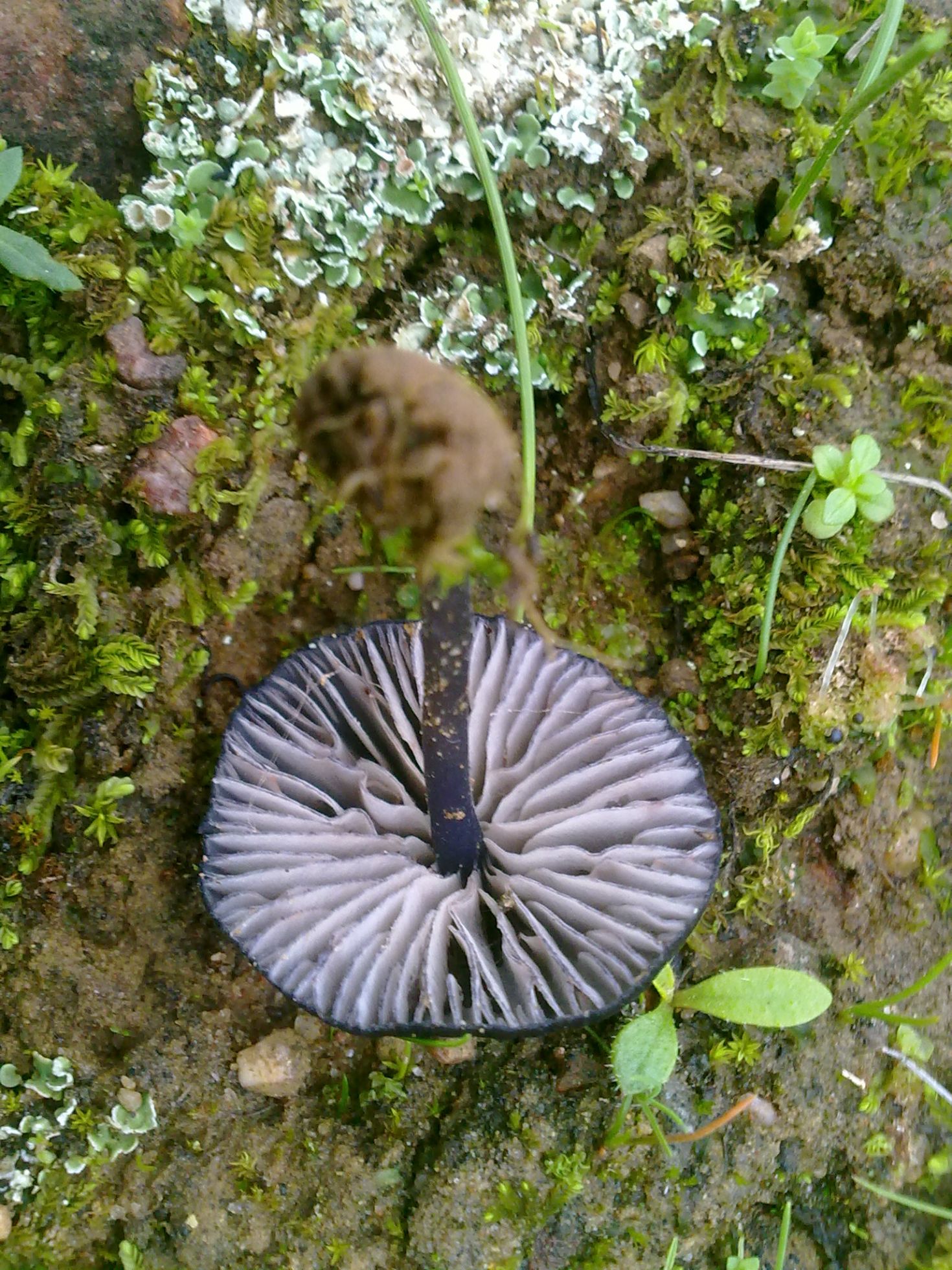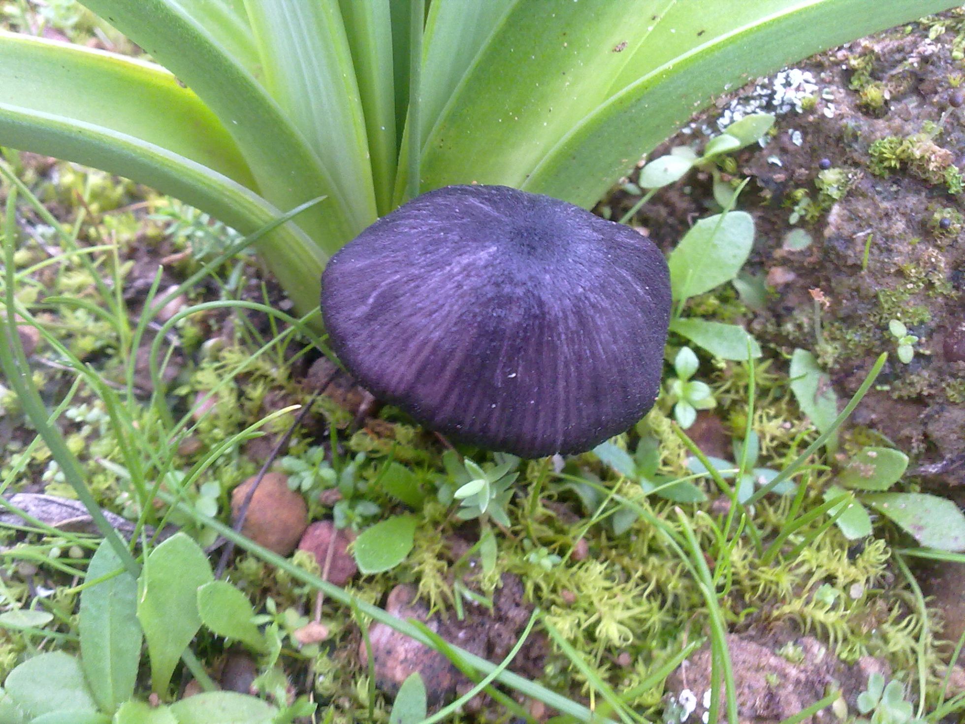Encontrada en la provincia de Sevilla en suelo pobre y arenoso en el margen de un camino pero sin asfaltar. Sombrero pequeño de entre 1,5 y 2,5cms de un color violáceo muy oscuro casi negro, parece que algo deprimido en la zona central. Pié algo mas claro y liso sin restos pruinosos en su base. Láminas con arista del mismo color que el sombrero.