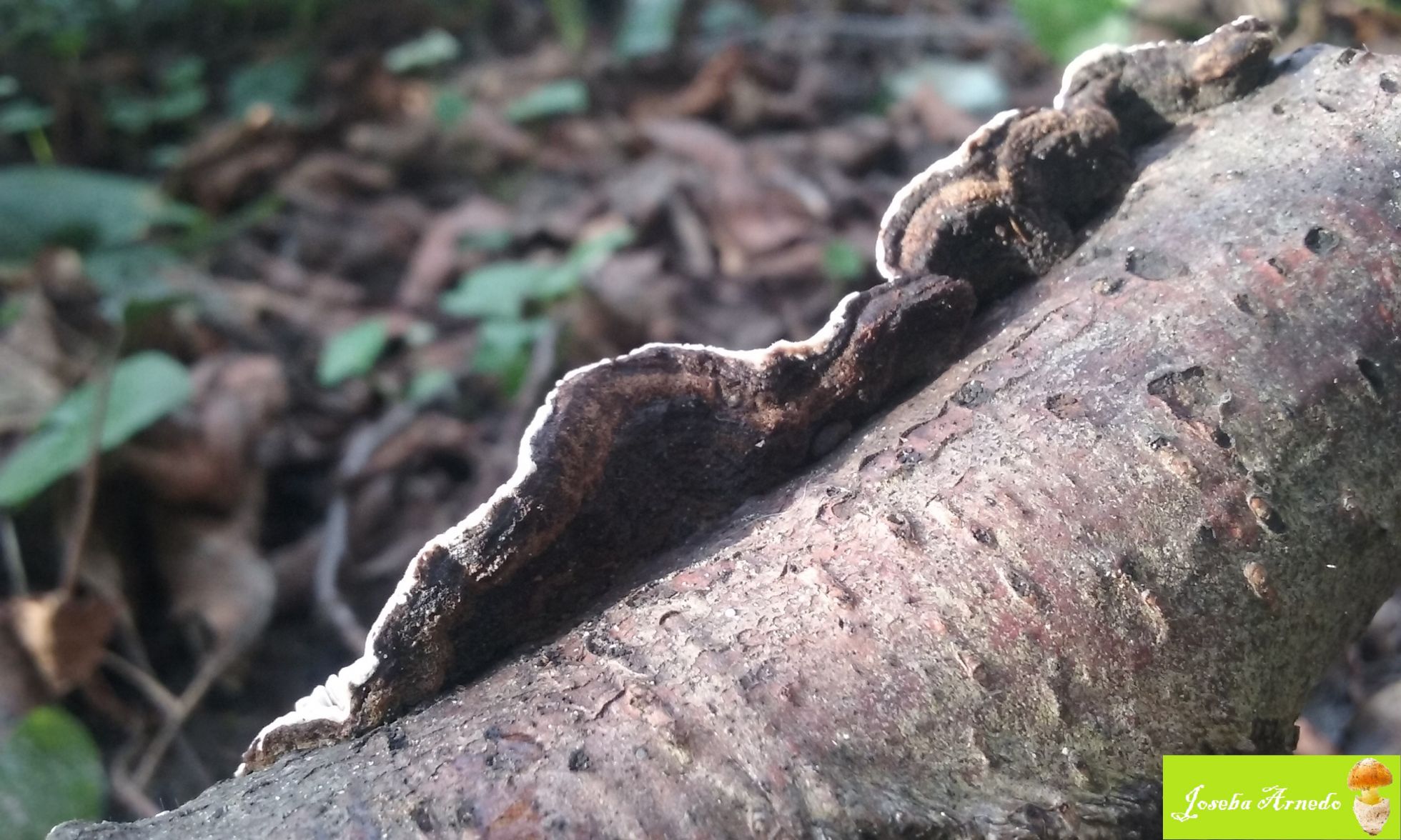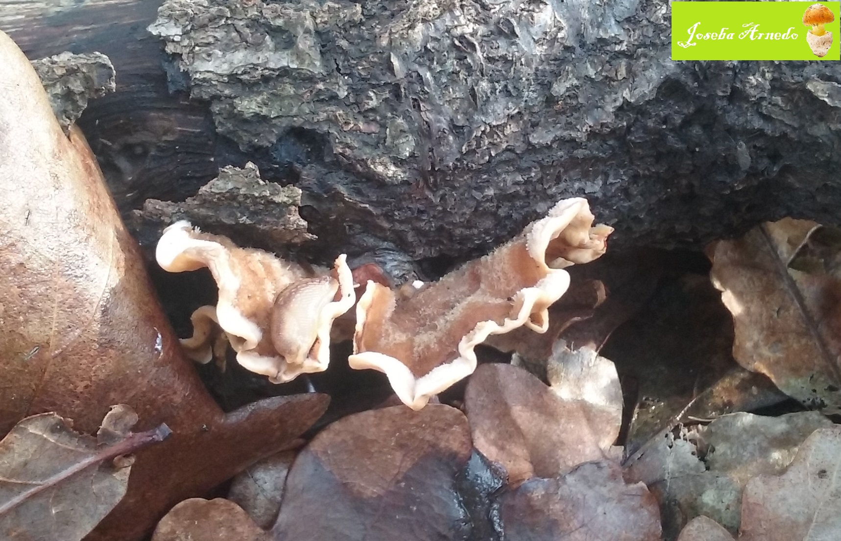 Esta especie crecia en lo que creo que era una vieja rama caida de aliso. Solo en el ejemplar mas desarrollado se veia levemente el sombrero al estar el himenio separado de la madera.
