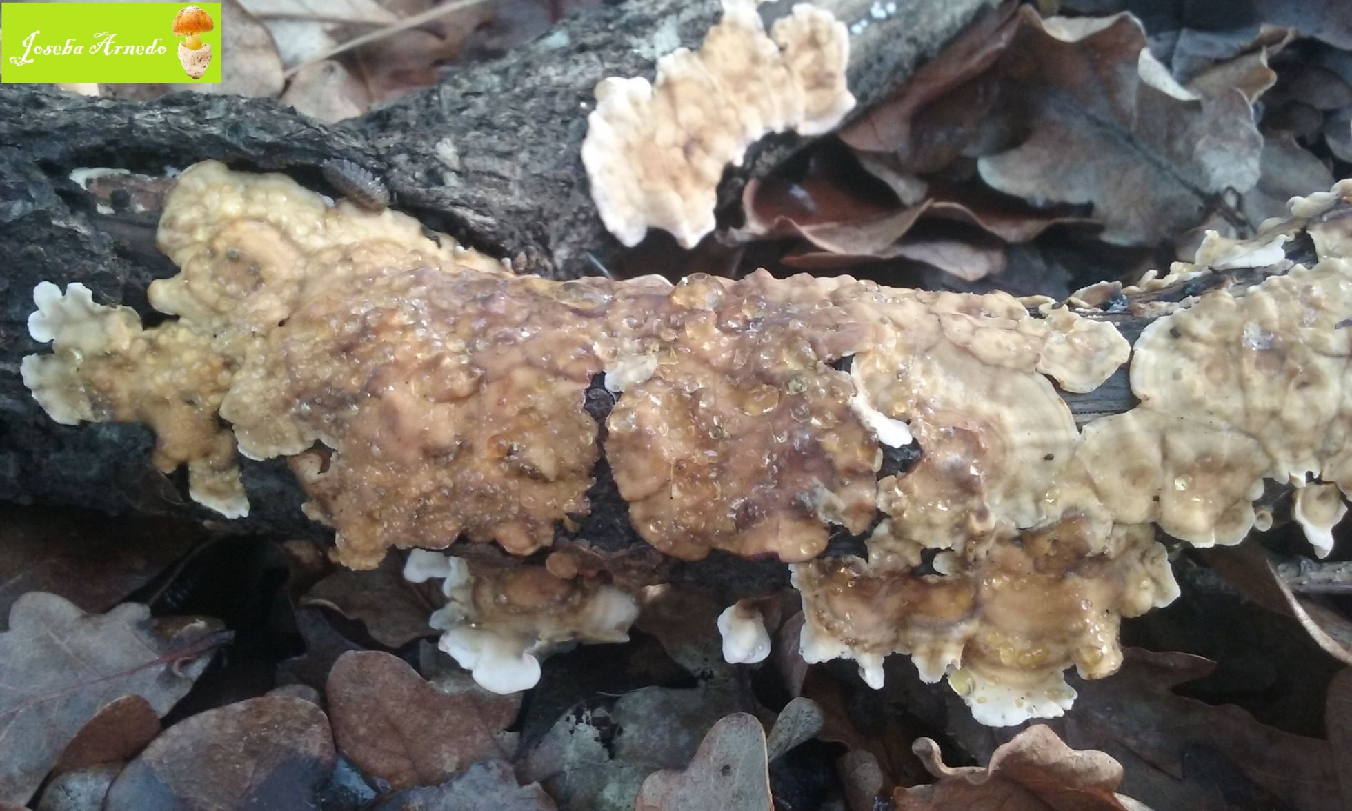 Esta estaba sobre una rama de roble. Es una especie que estoy viendo mucho estos ultimos dias y creo tenerla identificada. Lo que me ha llamado la atencion era que en el himenio habia una especie de bolas que se asemejaban a la resina de los arboles.