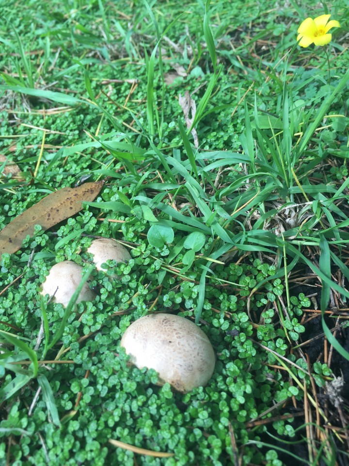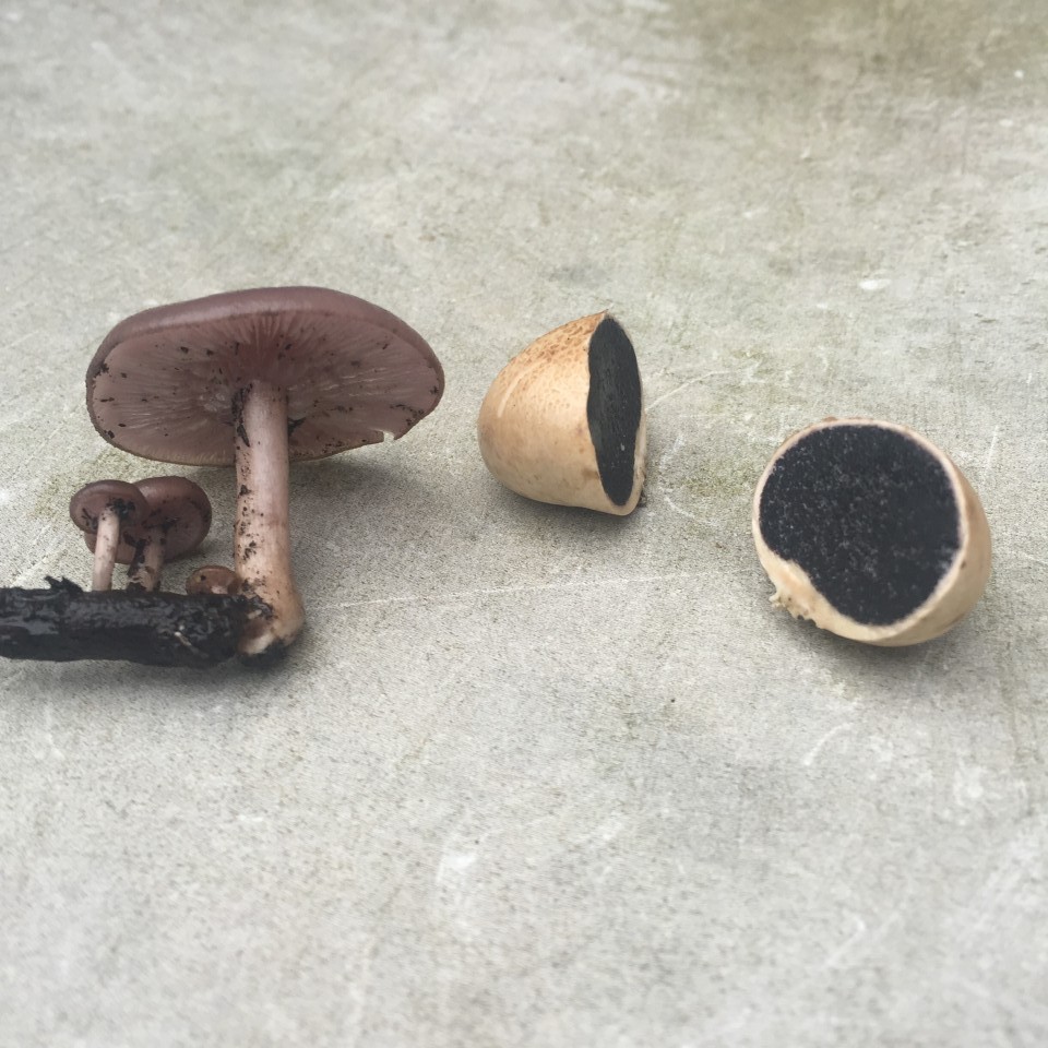 Hola Gaston, parece Lepista sordida , especie que aparece habitualmente en jardines, lo de aparecer sobre un pequeño tronco no es nada raro ya que se trata de una especie saprófita de restos vegetales, la esférica de acuerdo con Andrés Lorenzo (es un lince) por el pequeño pié parece Scleroderma citrinum, aunque en jardines es mas típico el Scleroderma verrucosum.