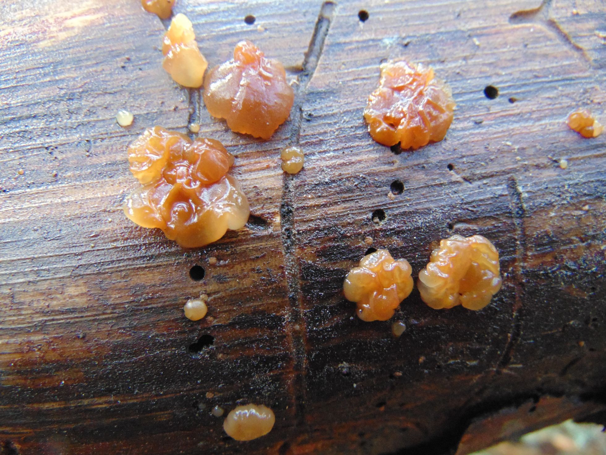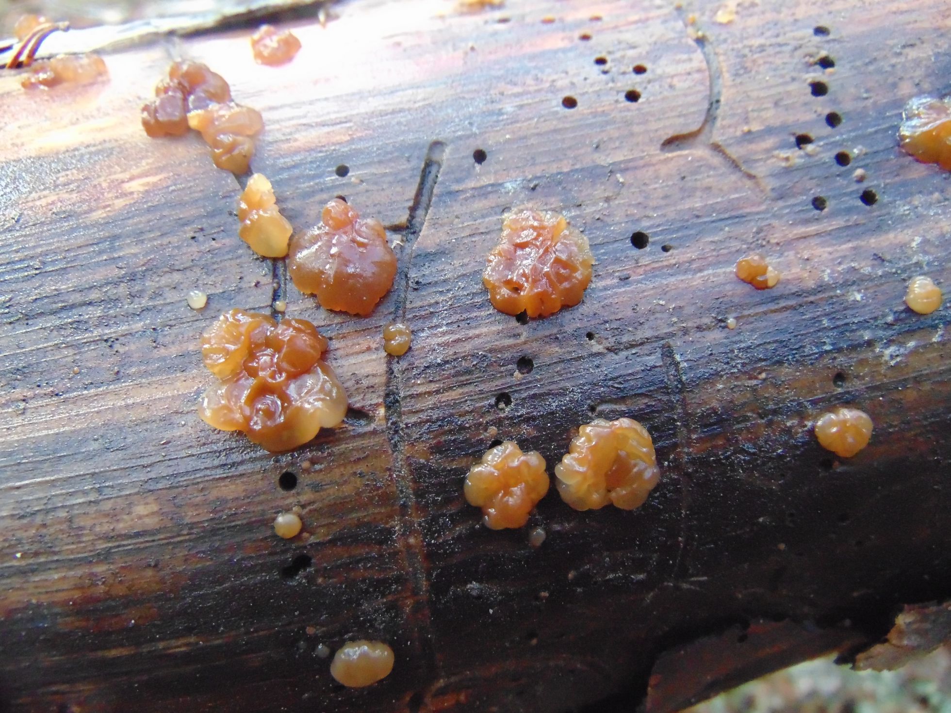 Aupa Ernesto, la primera me parece que se trata de Dacrymyces stillatus. Hay alguna otra similar, pero esta suele ser habitual en coniferas. La segunda me ofrece mas dudas pero por darte una opcion, mira por Exidia saccharina.