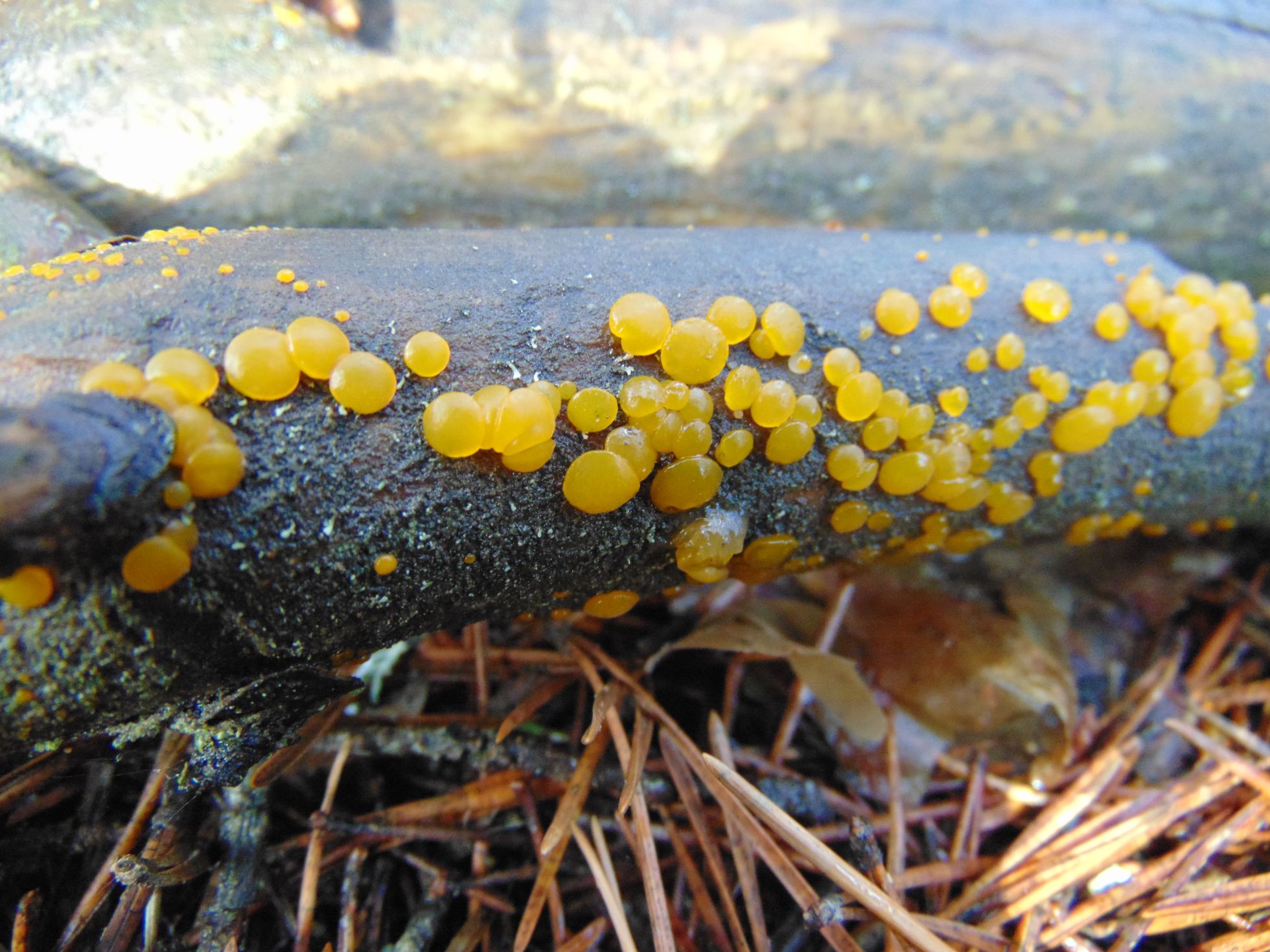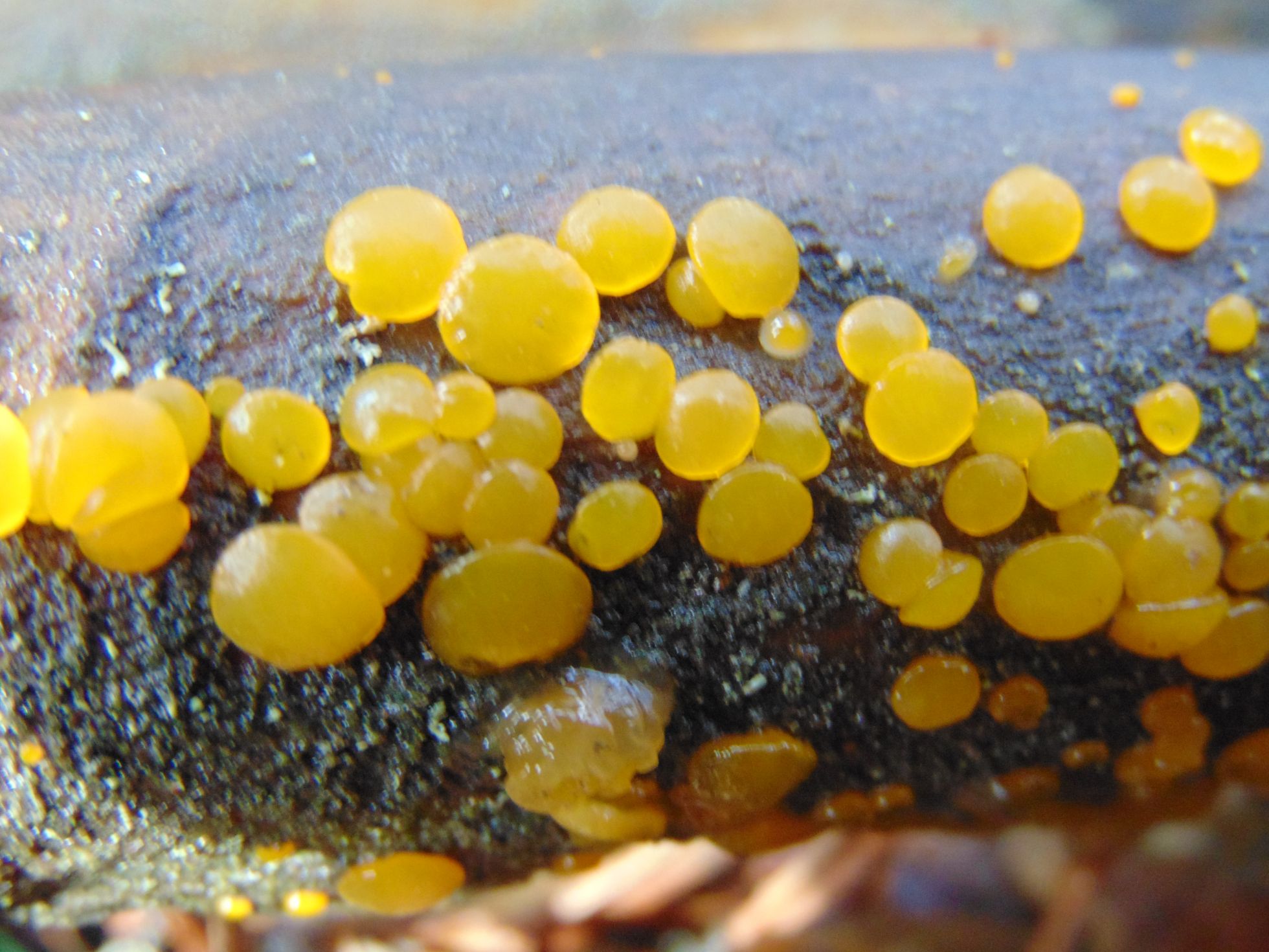 Hola Ernesto, de acuerdo con los compañeros, la primera sí parece Dacrymyces stillatus, esta yo me la he encontrado sobre madera de planifolio, aunque también suele ser habitual sobre madera de coníferas. En mi zona sobre madera de coníferas suele ser habitual la Ditiola radicata, aunque la especie que nos presentas no me lo parece. Te dejo la ficha de las dos especies para que puedas compararlas.
