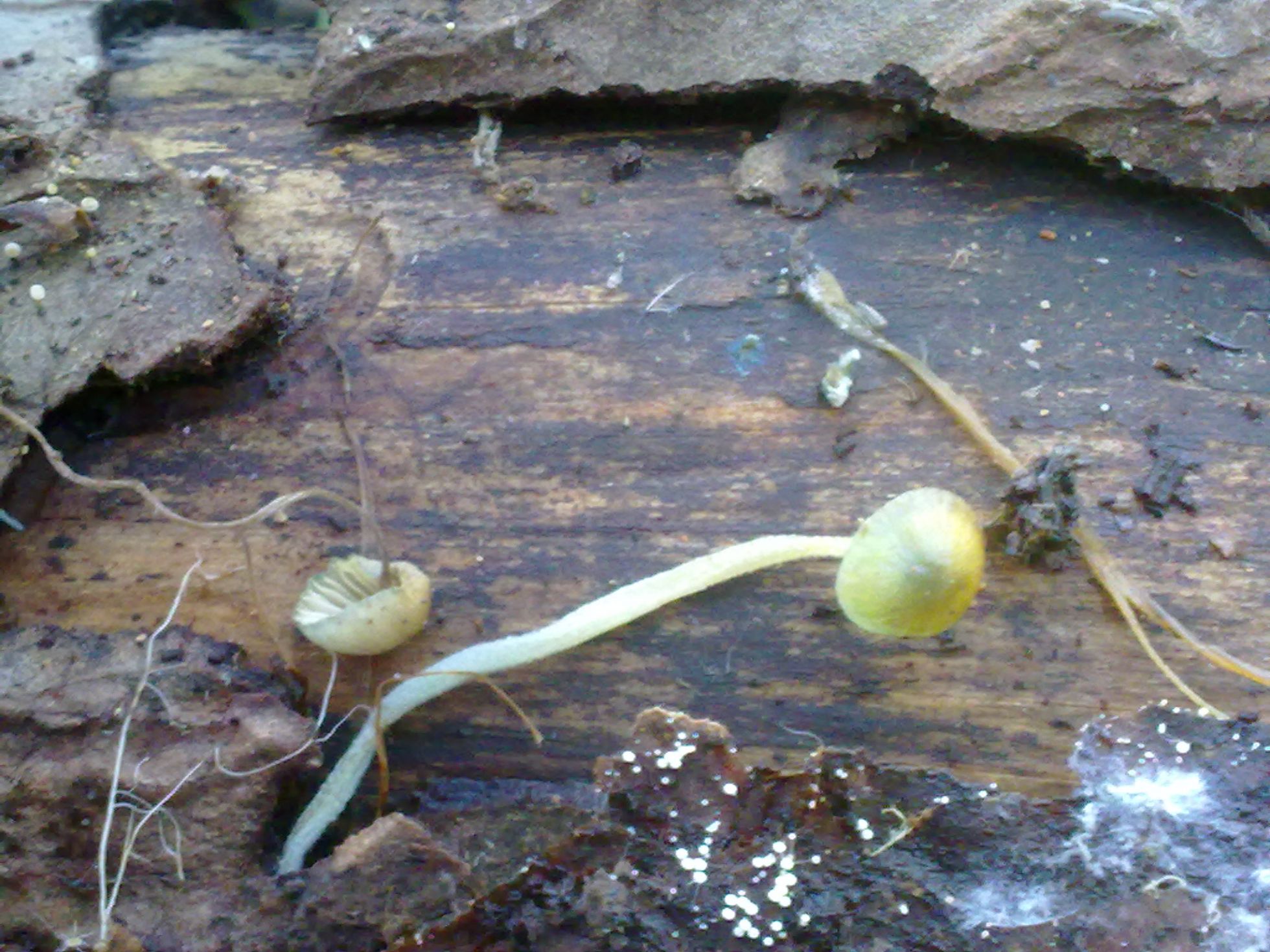 En la segunda imagen que nos presentas, debajo de la posible Mycena aparecen unas pequeñas bolitas de color blanco que en la parte superior izquierda de la imagen parece que presentan un pié bastante diferenciado, a parte de la Mycena creo que te has dejado un posible Mixomiceto (es que estos son mis favoritos).
