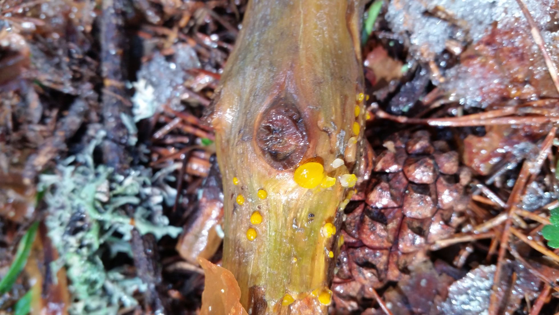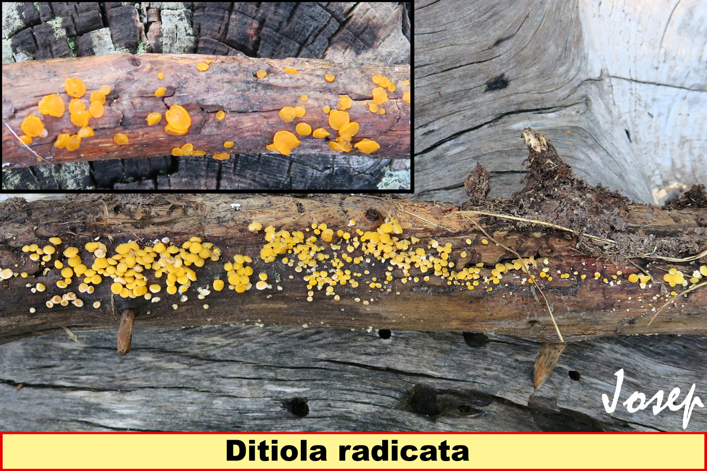 Gracias Joseba, creo que con la última hemos patinado los dos un poco, el Dacrymyces stillatus es mas común sobre madera de planifolio, no me había fijado en la piña del suelo, sobre madera de conífera y viendo la base blanquecina se parece más a Ditiola radicata.