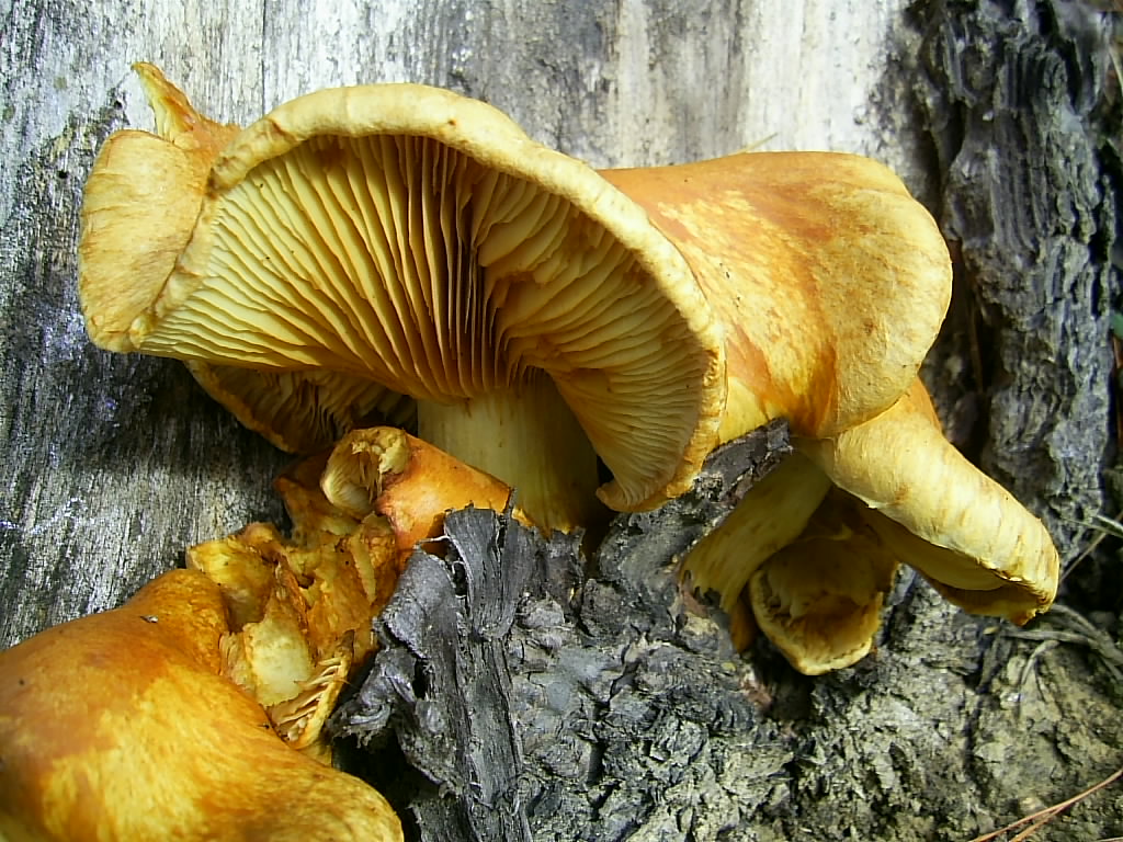 Hola Duende: En mi opinión se trata del Gymnopilus spectabilis, digo esto porque con el detalle que das de su gran tamaño, el color herrumbre que se aprecia en sus láminas, y el hábitat sobre madera es lo que más cuadra, a pesar de que no se aprecia claramente el anillo ya que este suele ser fugaz. Por otro lado te diré que no se trata de un Tricholoma de color amarillento (viridificatum,fucatum,etc….) ya que estos no son de madera, ni tampoco de un Tricholomopsis (rutilans,decora) ya que estos otros no tienen herrumbre en las láminas.