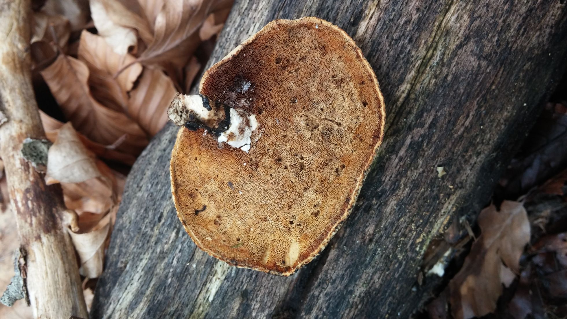 yo nunca he visto algo similar y mira que ando por hayedos y veo Polyporus a patadas. He buscado y rebuscado y no he encontrado ninguna especie de este genero con ese color en el sombrero. A ver si sacas algo en claro con la micro porque me tiene intrigado.