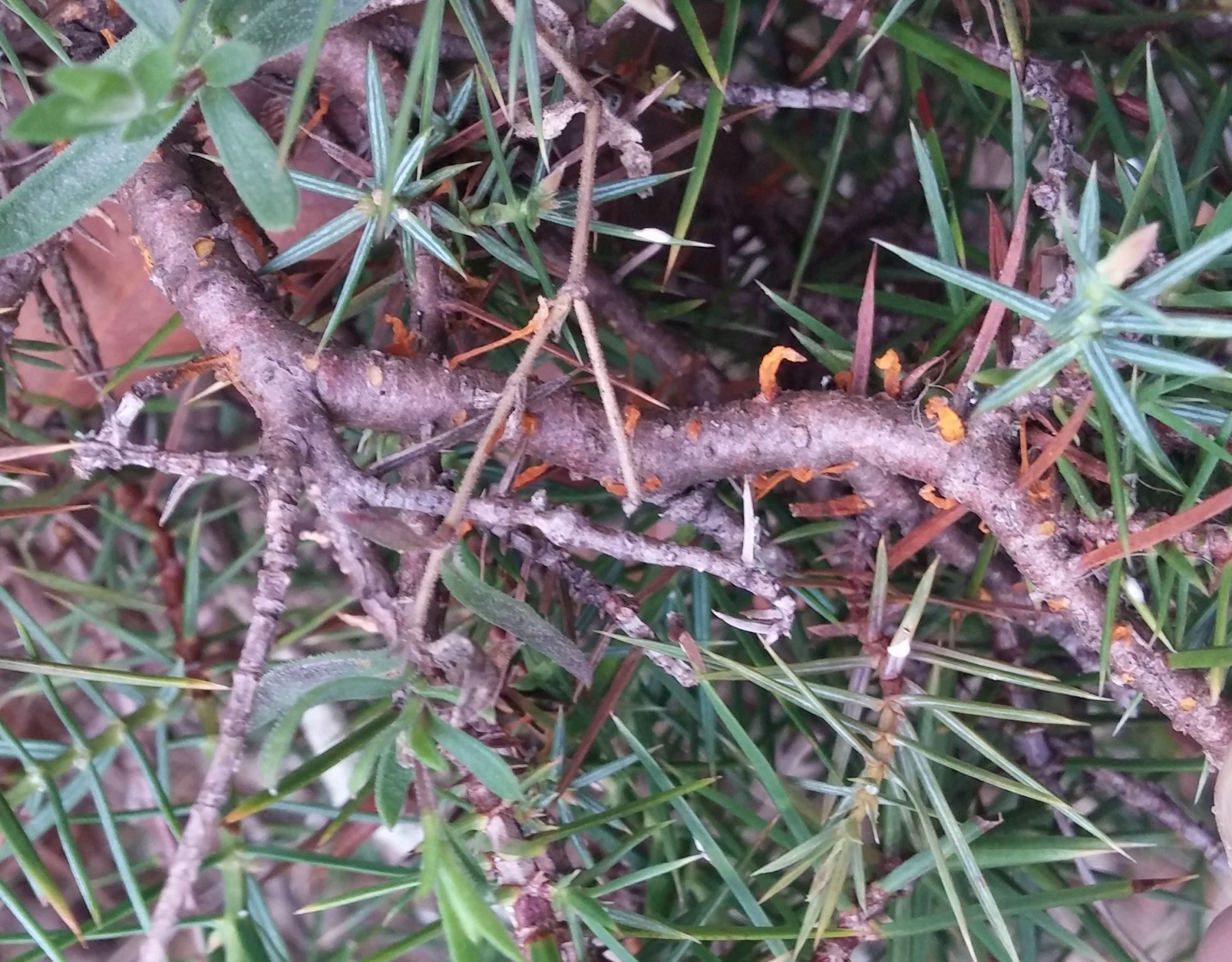 Y ésta se la dedico a Jon Joseba, Gimnosporangium gracile, que no deforma la rama que parasita, sobre Junniperus oxycedrus.