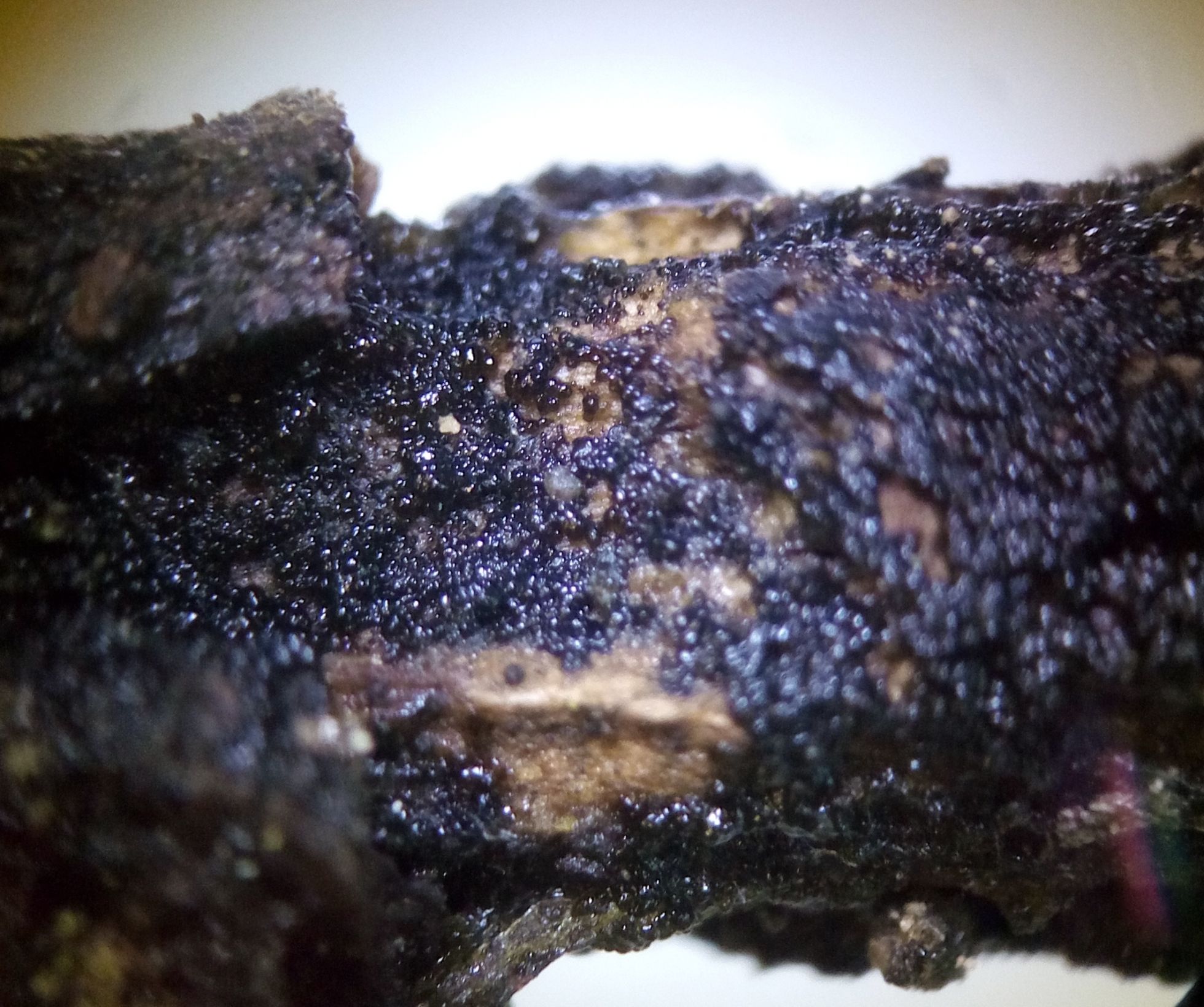 hace alguna semana os puse una foto de algo que ni sabía si era un hongo. Javier me la identificó como posible Brefeldia maxima en un estadio avanzado, pues comienza blanca, pasa a granate y acaba siendo negra, con el mismo aspecto de lo que yo os presento. En este estadio cuadra bien por su aspecto, pero me escama bastante no haber visto ninguno de sus anteriores fases.