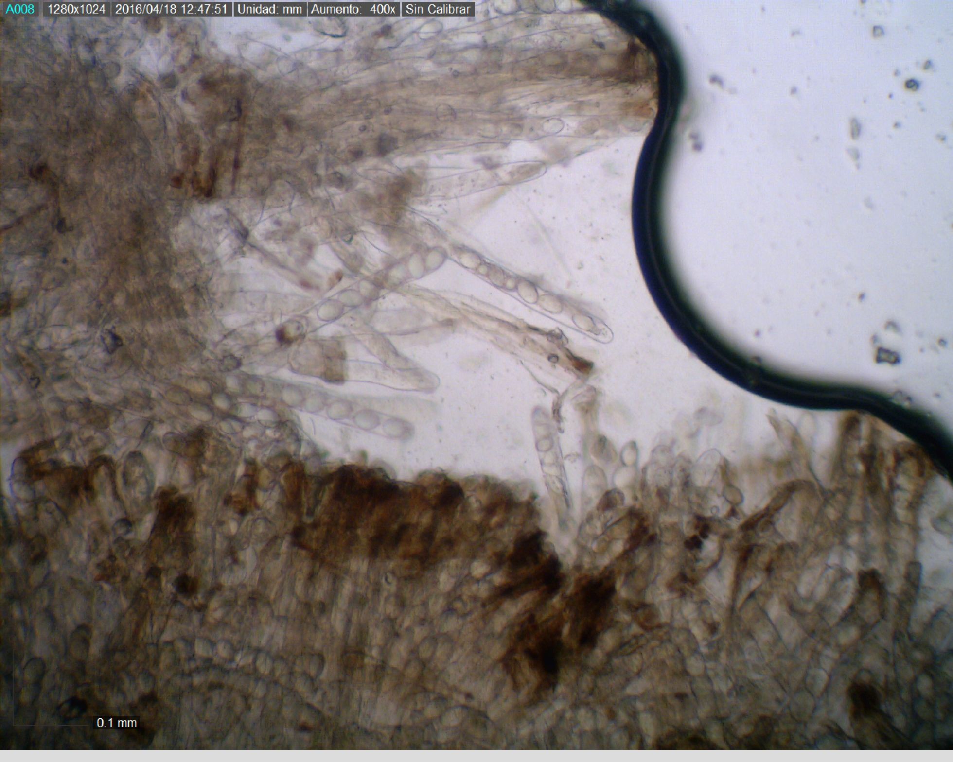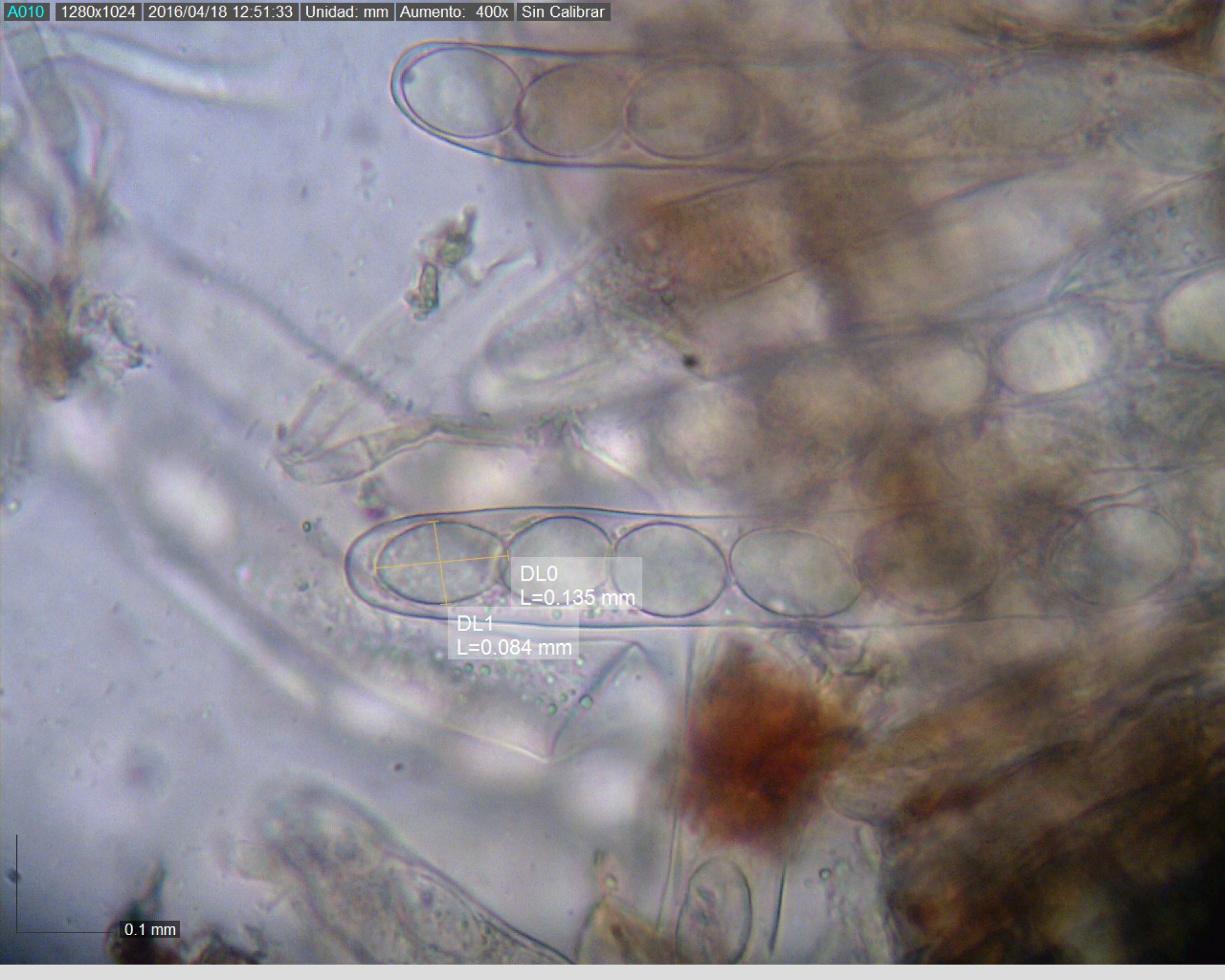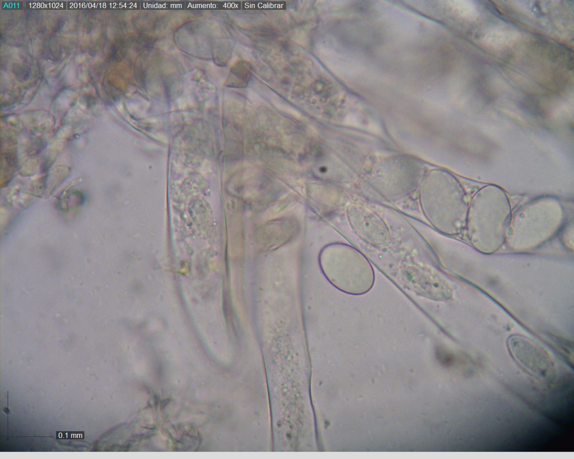 hace unos días presenté una Discina que podía ser D. parma. Por consejo de Josep la he pasado por el micro y creo que no es, puesto que según he podido ver, no tiene esas protuberancias (no se su nombre científico) en los extremos de las esporas. Os la presento a ver si alguno me puede indicar cuál será.