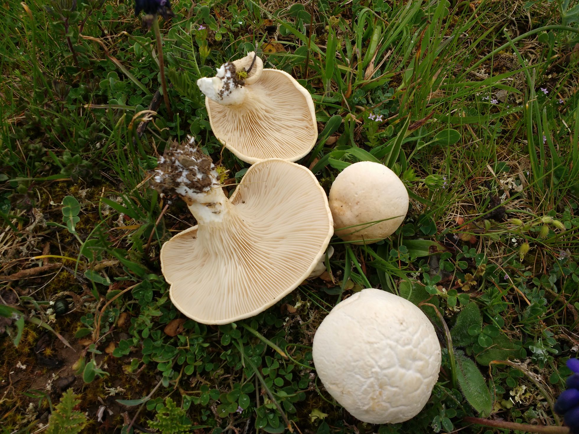 Ayer en un pastizal a unos 1000m encontré lo que parecían unos champis pero resultaron que no. Las he identificado con la ayuda de Joseba como Pleurotus nebrodensis. La descripción cuadra y aparentemente no hay mucha confusión posible.