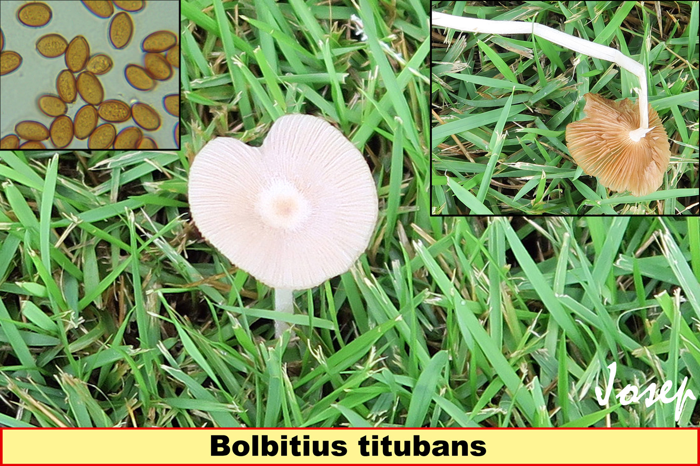 Hola Rubén. Tengo claro por el color de las láminas que se tratade un Bolbitius, aunque no tengo nada claro que se trate de Bolbitius reticulatus, ya que se trata de una especie muy poco referenciada en tu Continente, apenas alguna referencia en el norte de Canadá, además el ejemplo que nos pone Javi es una solo imagen de Biodiversidas virtual que tengo dudas sobre su correcta identificación, si buscas imágenes de Bolbitius reticulatus verás que se presentan muy distintas a las de tu propuesta, hasta presentan el sombrero viscoso nada que ver con el sombrero seco de tus imágenes.