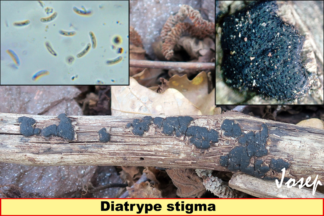 Yo por mi parte como ya sabéis he aprendido a desconfiar de especies que la mayoría de las veces tienen "clones" por esto quisiera a modo orientativo que no descartaras especies próximas como la....Diatrype bullata estas salen preferentemente sobre maderas de sauce y aliso y el tamaño de sus esporas son: 7-8x2 micras. Como no veo su interior ni las medidas de las esporas, tampoco podemos descartar la Diatrype disciformis o en el caso de que su desarrollo hubiera sido en robles la Diatrype quercina.