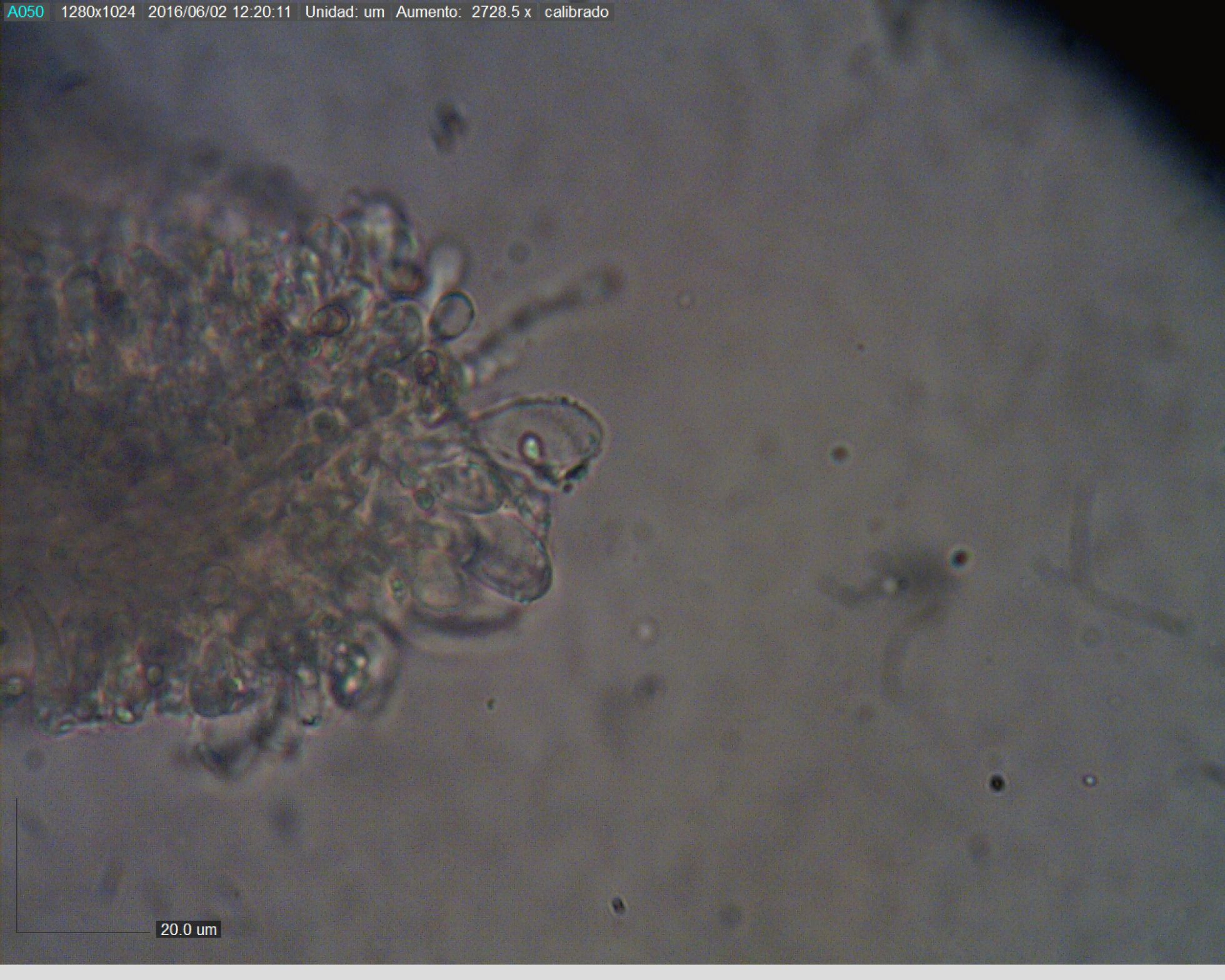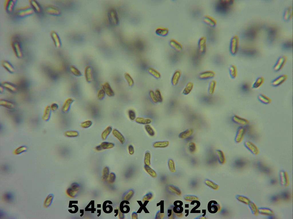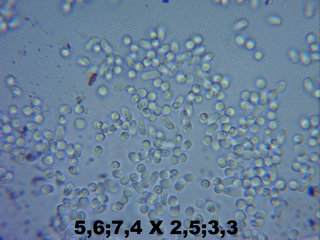 El tamaño es algo menor que lo que hemos leído en la bibliografía, pero no nos cuadra bien con otra especie, puesto que las que hemos mirado, se alejan más del tamaño. La chica que me ayuda tiene la teoría que quizás creen esporas más pequeñas al estar en condiciones peores. La cogimos el viernes y la pusimos a esporar en la nevera. Como el lunes no había nada, la sacamos y hoy ya sí que había esporado, quizás pueda crear esporas menores por el paso de tantos días???