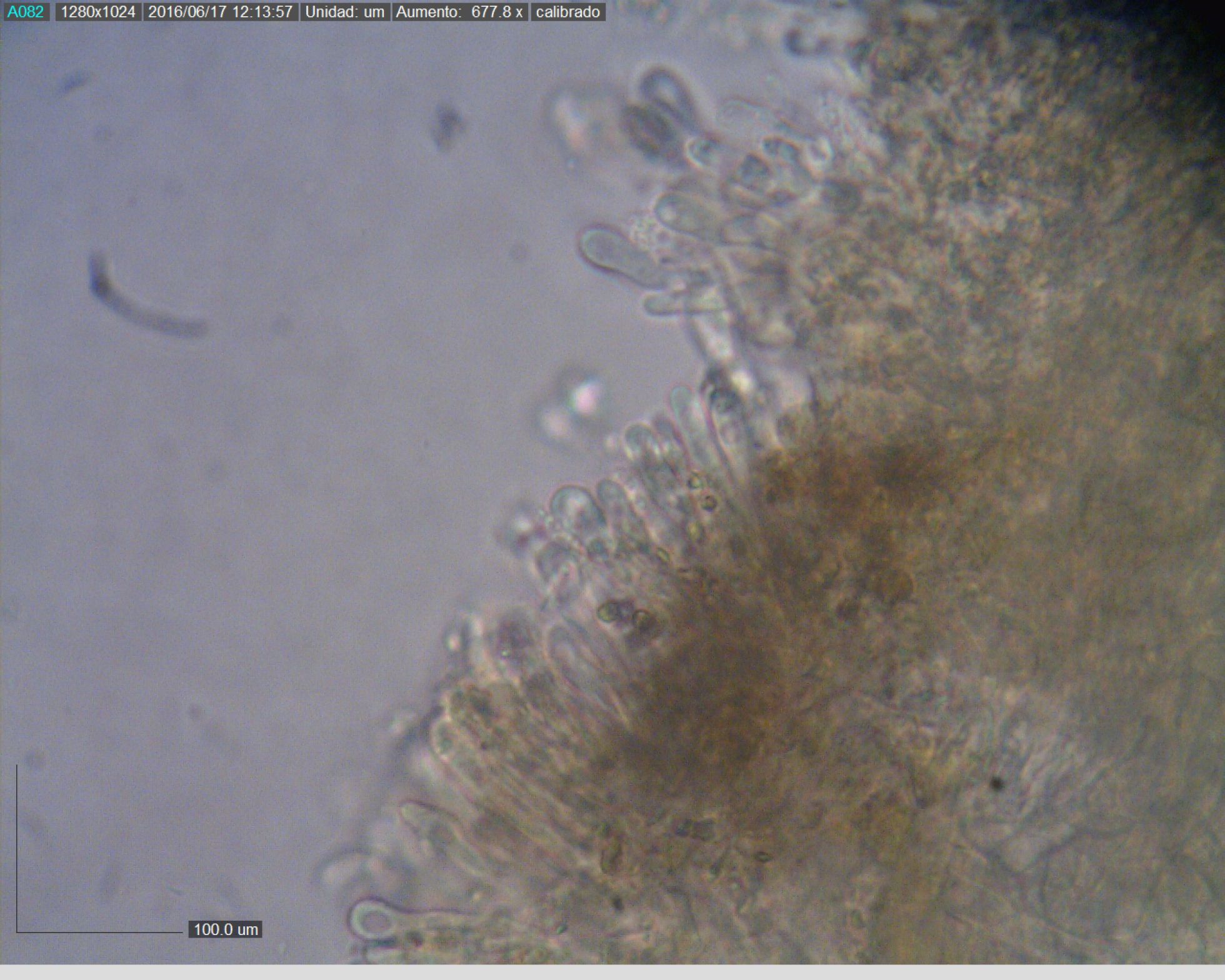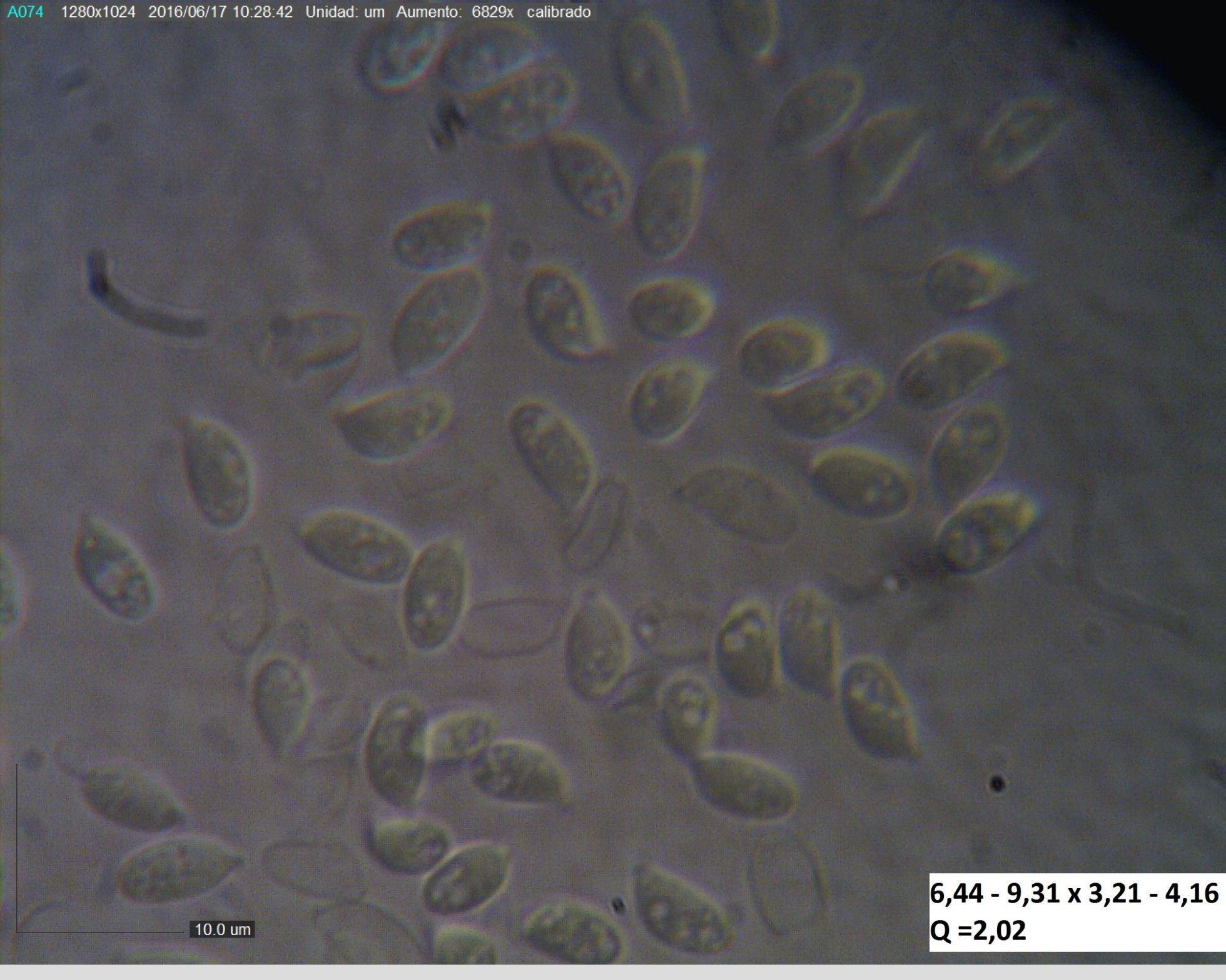 Hola Héctor, mejoras mucho con la microscopía, me encanta la imagen del basidio con las 4 esporas, la forma de las esporas me recuerda a los Gymnopus, encajaría con Gymnopus villosipes. Te dejo dos enlaces , uno con una imagen y el otro con la imagen de las esporas de Gymnopus villosipes y sus medidas, que parece encajan aunque de manera forzada con tu propuesta, de todas formas nos harían falta mas pruebas para confirmarlo.
