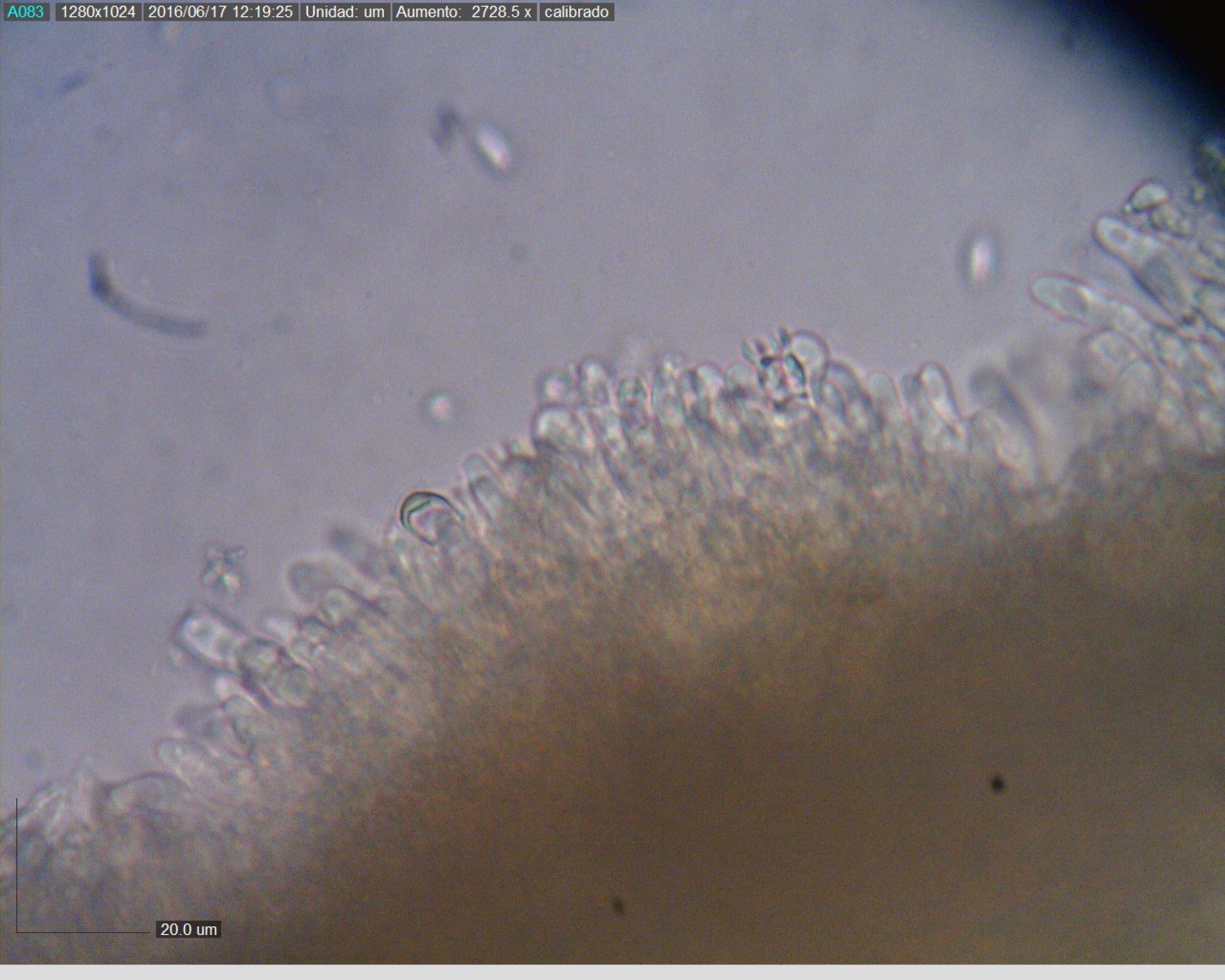 Los elementos que vemos en el corte transversal pueden ser cistidios pero no sabemos su medida. Yo siempre aconsejo un corte radial para mirar los queilocistidios. En un corte radial los queilocistidios (si existen) predominan sobre los basidios y es fácil observarlos, o bien bien mirar la arista en ese mismo corte , que estaría en la parte más delgada, (unos pocos queilocistidios). Es posible que el basidioma no presente pleurocistidios, a menudo tampoco las bibliografías los muestran, es por ello necesario incluir los queilocistidios.