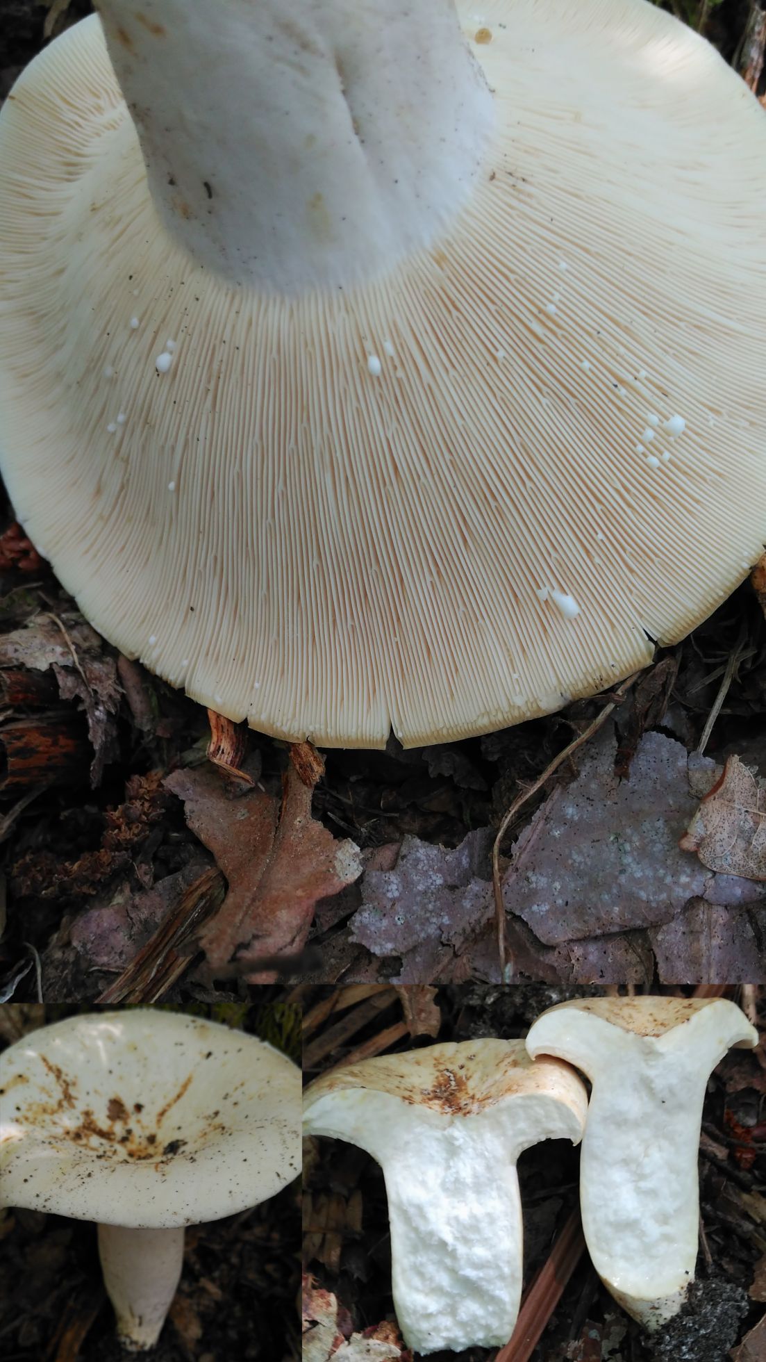 Láminas muy apretadas, adnatos y concoloro con el pie quizás más marcado a crema, son muy pequeñas y muy apretadas al punto de que si no te fijas bien parecen poros., rezuma unas gotitas de lactato de color blanco