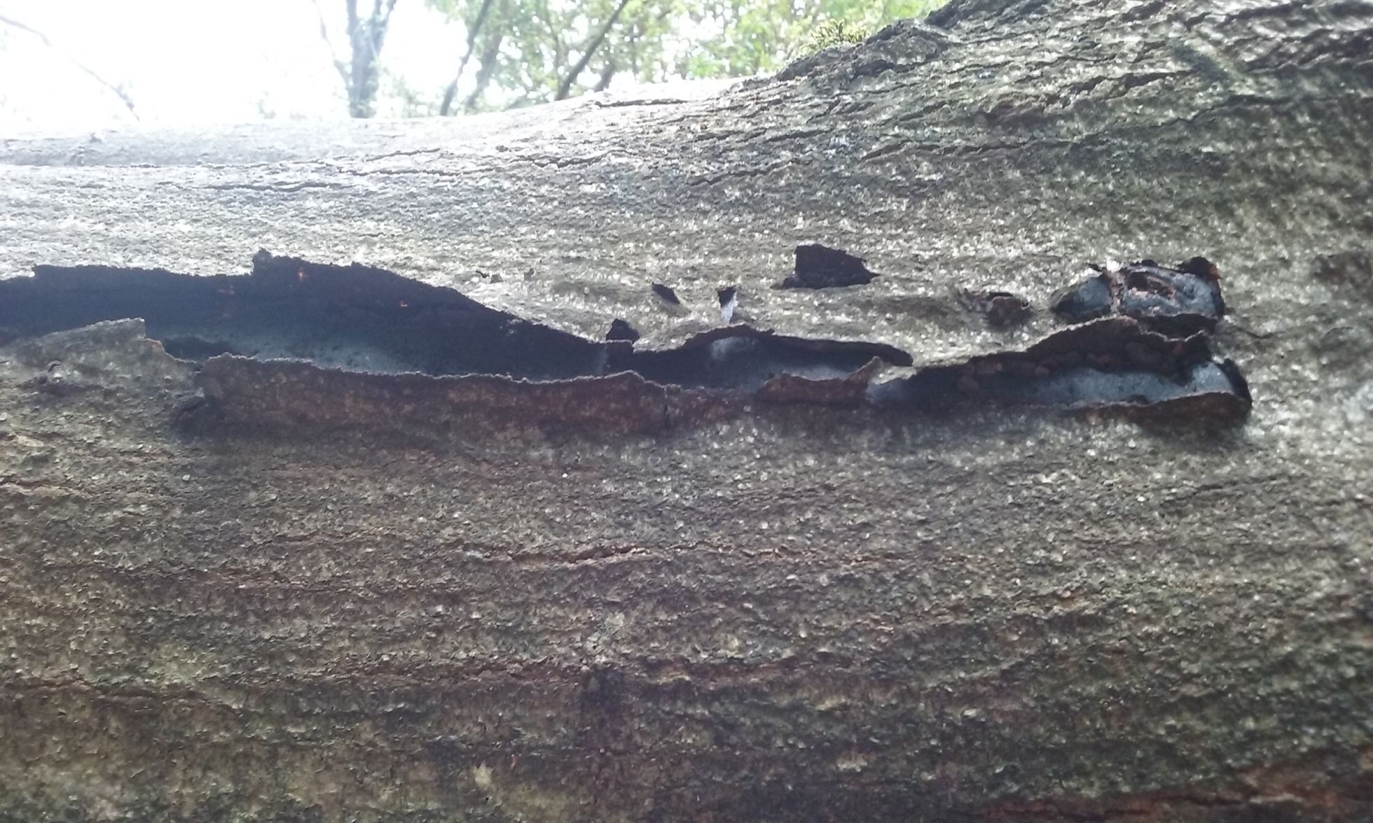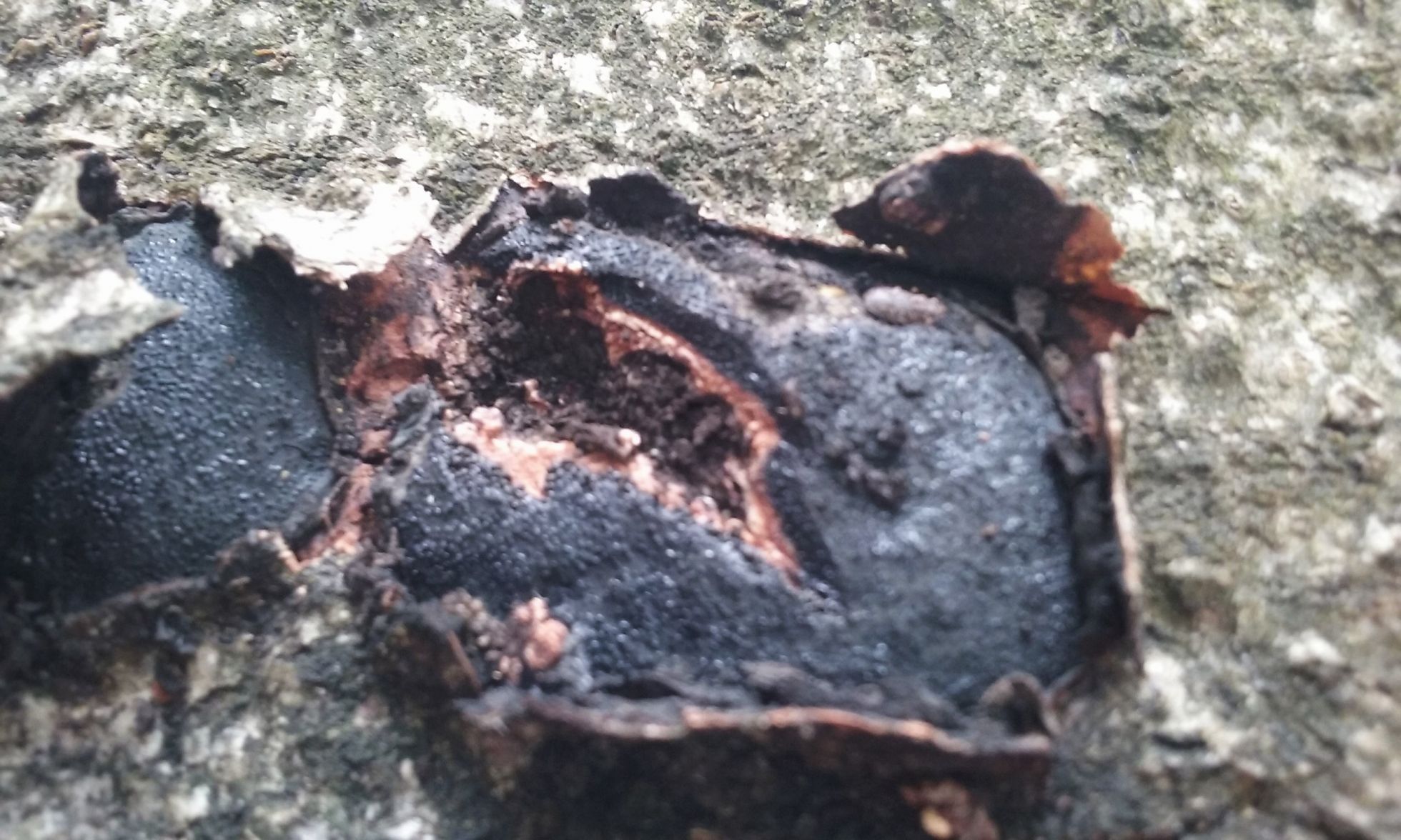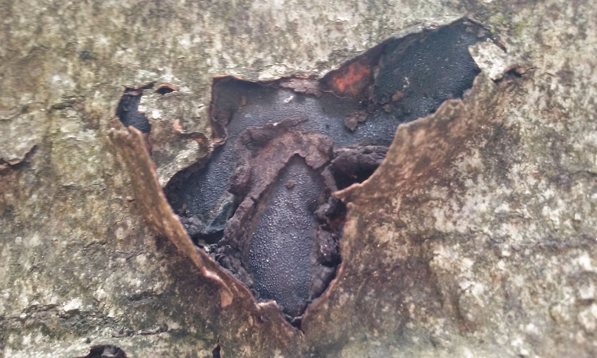 Estas costras era la primera vez que las observaba. Salian de un roble americano caido y rompian su corteza. Eran de consistencia dura y me ha costado mucho poder hacer un corte con la navaja para ver el interior que como se observa es de un color pardo y parece estar revestido por otra capa mas clara. Lo que tambien me ha llamado la atencion es que a diferencia de especies similares como Dyatripellas etc. estos se extendian varios centimetros.