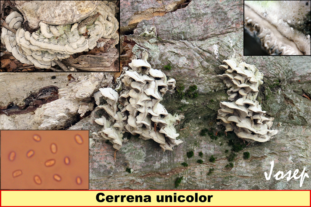 En este caso para salir de dudas en muy importante una imagen de la sección de la misma, la Cerrena unicolor presenta una línea negruzca que separa la capa de poros y la carne del sombrero, se puede apreciar esta línea en la miniatura de la derecha de la última imagen.